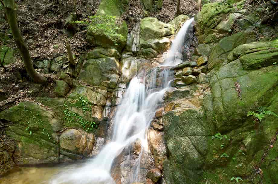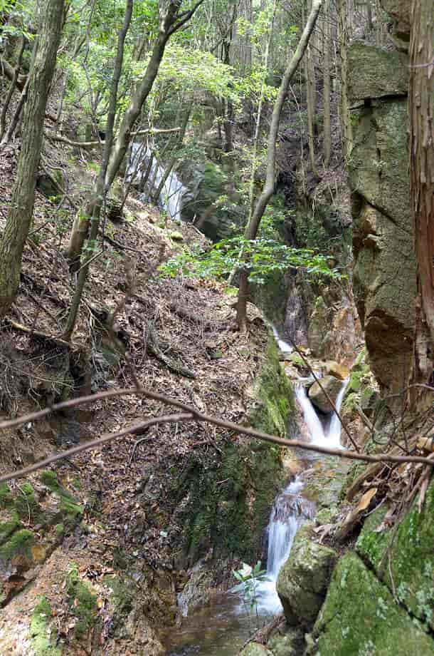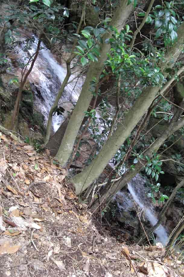 三重県伊賀市にある「天竜の滝」は、柘植地区を流れる倉部川に流れ落ちている。 周辺は奥余野森林公園として整備されていて、天竜の滝は、公園内の三馬谷に流れ落ちている。 三馬谷には名前が付けられている滝が四つあるが、それらは、総じて「三馬谷の滝」と呼ばれている。 天竜の滝はその中で最も大きく、15m程の落差があるだろうか。 最上流にある滝でもあり、別名・「一の滝」とも呼ばれている。 全体は二段の段瀑のようだが、岩の間に隠れるように流れ落ちているので、山道からでは全体の様子が分かりづらい。 それでも、天竜の滝は三馬谷の滝の中でも特に目に留まり、「一の滝」と呼ばれるに相応しい味わいがある。 天竜の滝への交通・アクセス さて、天流の滝は、奥余野森林公園内の三馬谷にあるが、公園までの交通はそのページで紹介しているので、谷の入り口にある休憩所からだと、15分程の距離にある。 下流側にある「雲竜の滝」からだと、5分ほど山道を登って行った辺りで、山道の右手に見える。 雲竜の滝から山道を進んで行くと、一度渡渉することになるが、川幅はないので、気をつけて渡れば特に問題はない。 また、山道は沢の向こうに続いているが、対岸にはアルミ製の梯子がかけられているのが見える。 沢を渡ってからは、このアルミ製の梯子を登ることになるが、梯子と一緒に鎖も付けられているので、これにも頼って梯子を登ると、思ったよりも簡単に登ることができる。 梯子を登ってから先の山道もはっきりとしていて、程なく、右手に天竜の滝が見える。 しかし、山道からでは樹木に隠れて全体の様子は分かりづらい。 また、山道からの斜面は降りて行くには急なので、滝前には、手前にある梯子の辺りから沢を遡って行かなければならない。 それでも、滝前に出るには、落差2~3m程の小さな滝を越えることになり、これはかなり無理をしなければならず、危険でもある。 岩が濡れていると特に危険なので、残念だが、小滝手前の斜面辺りからの眺めに止めておいた方が良さそうである。 その辺りからだと、上段、下段、それぞれの一部を見ることができる。 尚、ここから山道を進めば、少しばかりで「油日岳・忍者岳」方面への分岐があり、三馬谷はここで終わることになるが、天竜の滝までには、名前はないが目に留まる滝が幾つかある。 谷の景観にも変化があって、三馬谷は歩いていても飽きることがない。 |