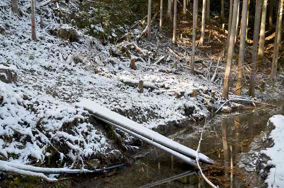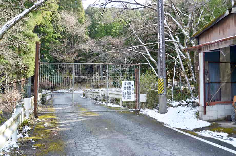 | ▲林道手前の獣除けゲート・すぐ右へ進む | ▲堰堤を越えた先にある鉄の橋(画面右) |