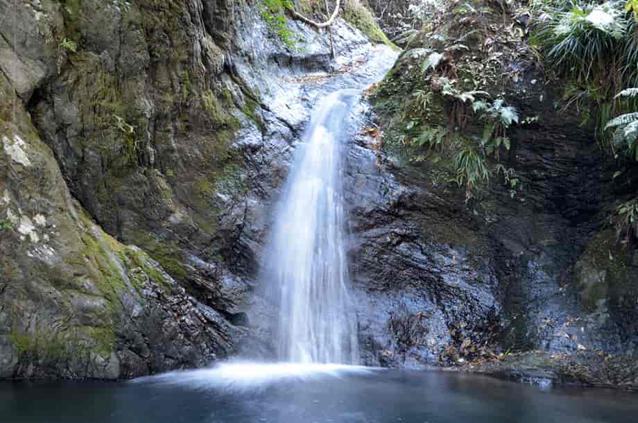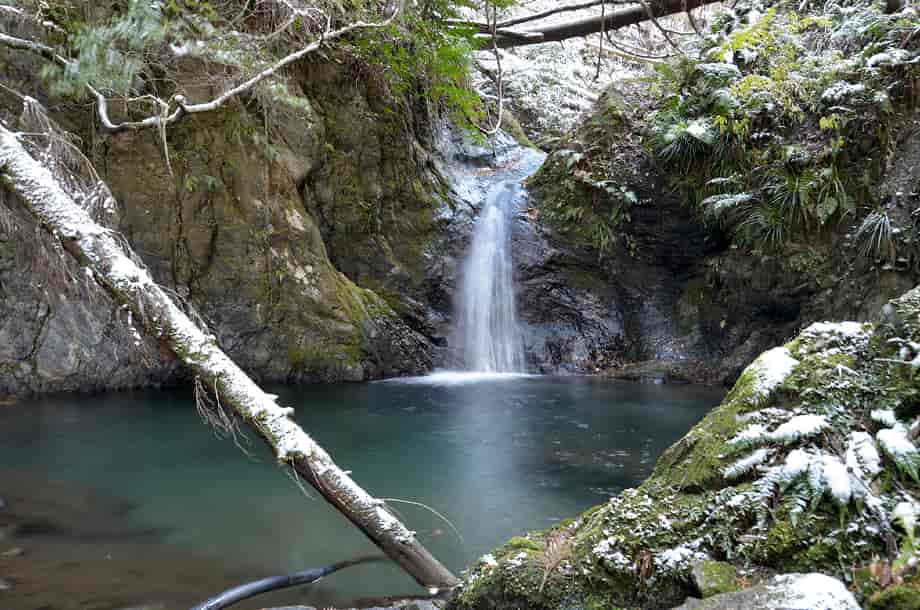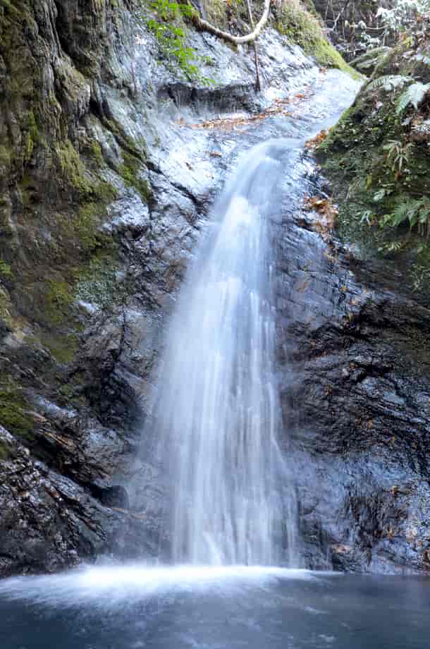 松阪市飯高町にある「鯛が淵の滝」は、加波地区を流れる櫛田川の支流に流れ落ちている。 落差4m程の滝だが、広い滝壺をもっていて、これが「鯛が淵」と呼ばれているのだろう。 山道からでも見える滝だが、この広い淵もよく見える。 淵の水は、遠くから見てもよく澄んでいて、水の色と白い滝とのコントラストも美しい。 滝自体は大きくはないが、広い淵とのバランスが取れているようで、何とも言えない味わいがある。 滝前も開けているので清々しいが、水量が多いと、足場は限られてしまうのかもしれない。 ところで、「鯛が淵」の名前がやや気にかかる。 字義から察すると海水魚の「タイ」だと思うのだが、川にはタイがいようはずもないので、何かの川魚を「鯛」と呼ぶのだろうか。 それとも、「鯛」は「大」などが転じたものだろうか。 謂れは全く分からないが、何かあって付けられた名前なのだろう。 鯛が淵の滝への交通・アクセス さて、鯛が淵の滝へは、大崩谷を目指すことになるが、自動車の場合、松阪市街方面からだと、国道166号線を東吉野村方面へ向かって西へ進む。 道なりに走って行くと、やがて飯高町加波地区に入るので、左にある櫛田川に架かる新加波橋を渡る。 ここには信号機などないが、橋の袂のところに「加波」の住所表記があるので、それにも注意するとよい。 反対方向の東吉野方面からだと、この住所表記は見えないが、ここは四差路になっていて、左角にはコミュニティバスの「加波」のバス停が見えるので、それに注意しておくとよい。 ここまで、途中にある「道の駅・飯高駅」からだと45~50分程で、その先にある「田引トンネル」からだと20分程度。 鯛が淵の滝へは、橋を渡って少し行くと道は大きく左へと曲がるが、そのまま道なりに進んで行く。 しばらく行くと獣除けのゲートがあるので、これを開けて先に進む。 ゲートの先はすぐに大崩橋で、橋を渡った先が分岐になっている。 この分岐の辺りが広くなっているので、自動車はここに止めることができる。 ゲートからの道は左へと進むようになっているが、鯛が淵の滝へは、この分岐を右へと進んで行く。 道なりに左へと進んで行くと、使われていないような斎場に着くので、滝へは右の林道へ入って行く。 分岐から右の道を進んで行くと、程なく右側に堰堤がある。 自動車はこの辺りまでは上がってくることができ、堰堤の手前にも広場あるので、ここに駐車してもよい。 この堰堤のすぐ先にも堰堤があり、その途中で沢を渡るようになる。 この沢には鉄の板を渡した簡単な橋が架けられているので、これを渡って対岸に見える山道へ進む。 但し、この橋は一方が沢へ落ちていたりするので、渡るときにはよく注意した方がよい。 また、この沢は、長靴があれば、そのまま渡ることもできる。 対岸に渡ってからは山道になるが、道ははっきりとしていて、そのまま歩いて行くと、上り坂を上がった辺りから鯛が淵の滝を遠望できる。 ここまで、駐車場から10分程で、滝が見える辺りの樹木には、目印になる赤いテープなどが巻かれているが、この辺りの斜面は急なので、滝前へは、ここから少し進んだところから降りて行く方がよい。 先を見ると、また大きな堰堤があるのが目に入るが、この堰堤の手前辺りから斜面を降りていくと、無理をせずに滝前に着く。 尚、ここから5分ほど山道を登って行けば、「魚止滝」があるので、時間があれば足を延ばしてみるのもよい。 |