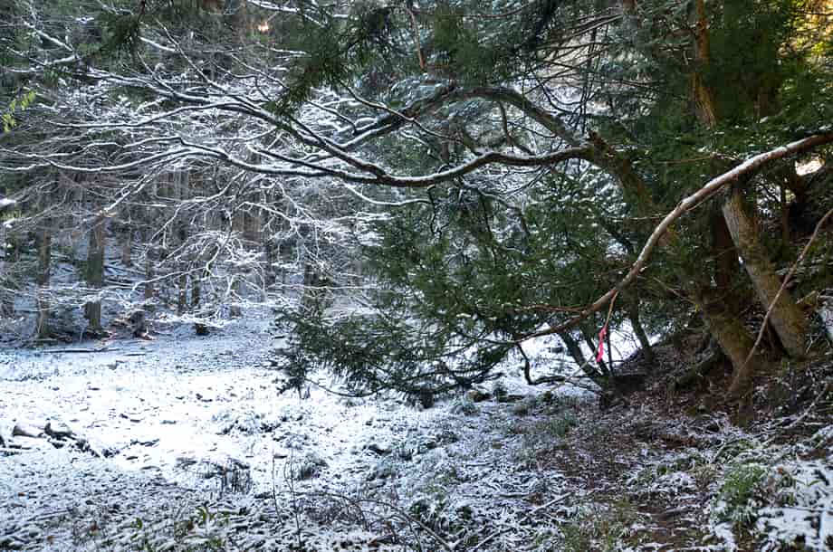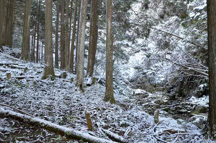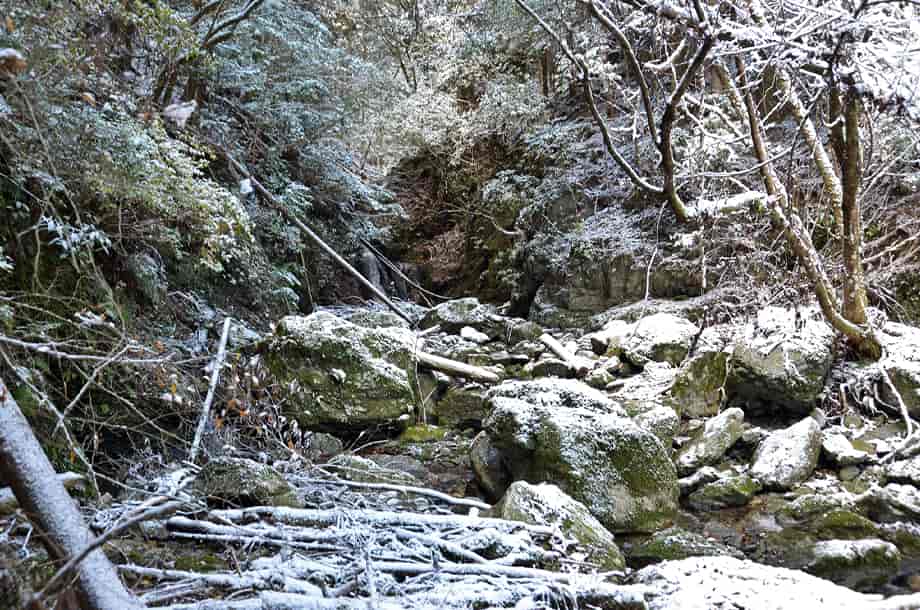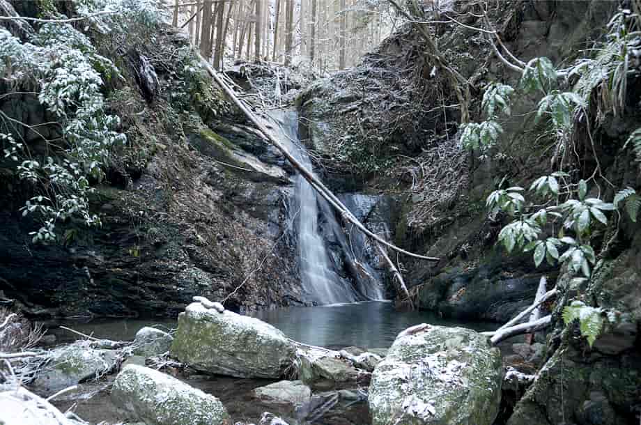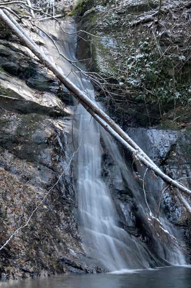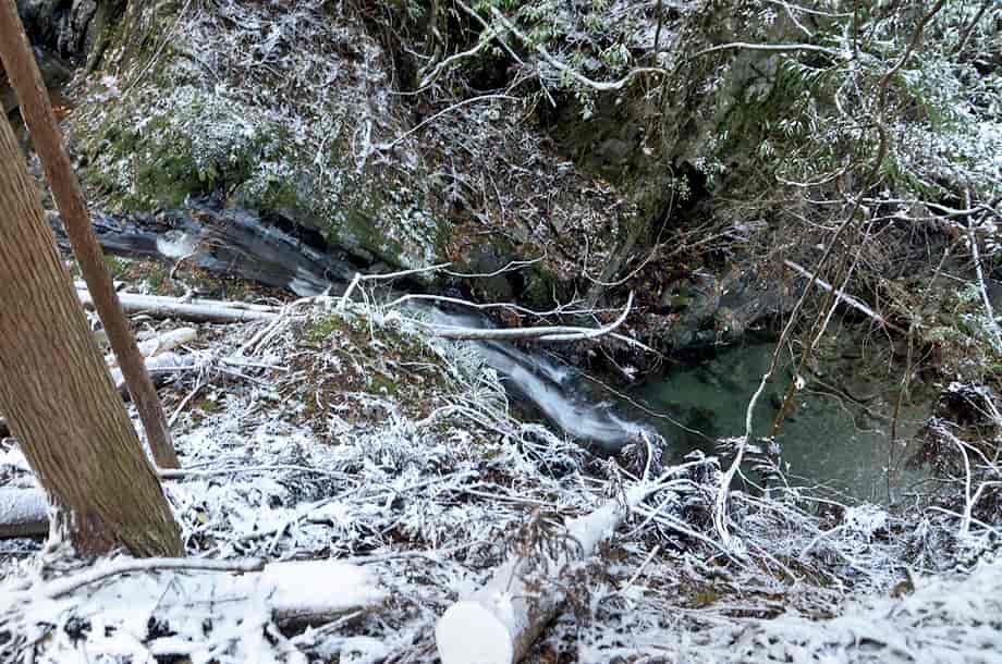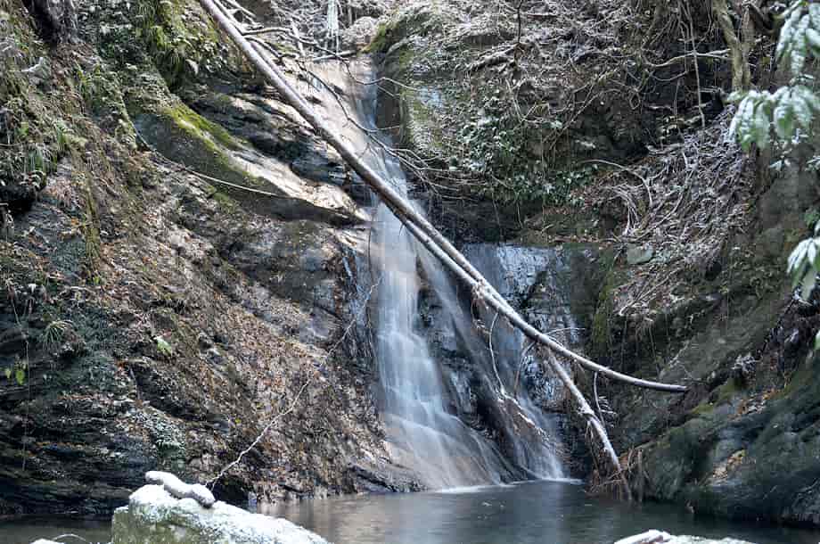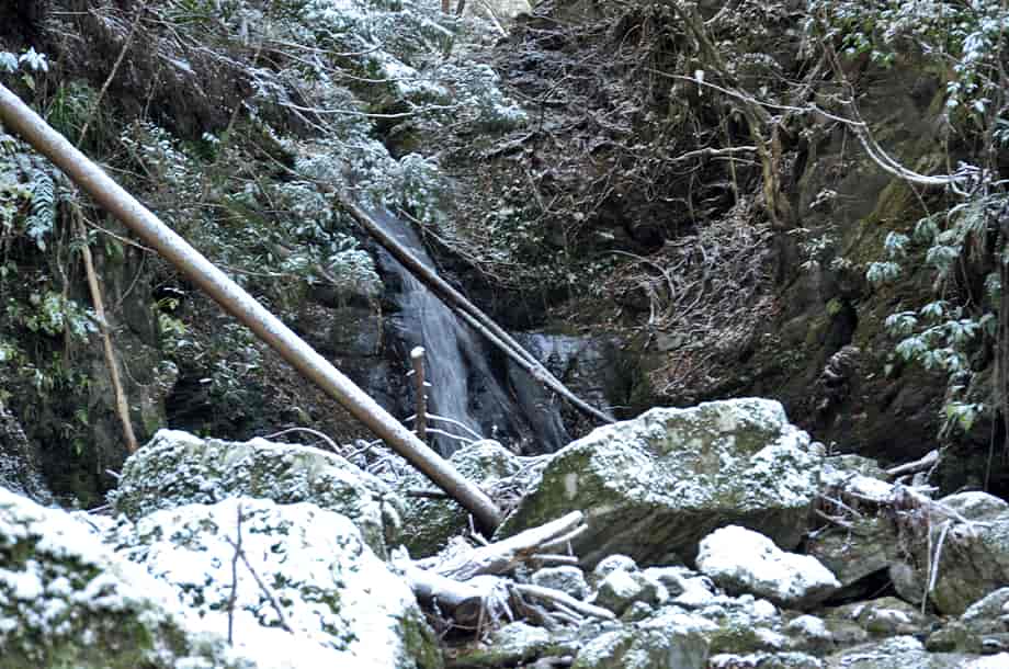松阪市飯高町にある「魚止滝」は、加波地区を流れる櫛田川の支流に流れ落ちている。 落差6~7m程の滝で、大崩谷に入ってから二つ目の滝になる。 山道から見ることもできるが、沢を上って滝前からでも眺めることもできる。 魚止滝は広い滝壺をもっていて、下流側にある「鯛が淵の滝」と似た感じがするが、魚止滝は、それよりも荒い印象を受ける。 滝壺の周りには大きな岩が多いのでそのように感じられるのかもしれないが、水が流れ落ちる岩肌も荒い感じだが、力強くも感じられる。 落ち口などの様子は山道から見ることができるが、上から眺めると思ったよりも傾斜のある滝でもある。 また、滝前から見る下流側の眺めは素晴らしい。 この時は、前日に降った雪が残っていたので雪景色のようになっていて、味わいある景観をつくり出していた。 緑の季節がどのような様子を現わすのかは分からいが、その時にも、きっと美しい渓流美を見せてくれるのだろう。 魚止滝への交通・アクセス さて、魚止滝へは、大崩谷を目指すことになるが、下流側にある鯛が淵の滝までの交通はそのページで紹介しているので、鯛が淵の滝からだと、一度山道に戻って進んで行く。 すぐにある大きな堰堤を右から越えると、堰堤の上は広い河原になっている。 対岸を見ると山道が延びているのが見えるので、河原を渡って山道を登って行く。 河原にはほとんど水がないので、簡単に対岸に渡れるが、ここからの山道もはっきりとしていて歩きやすい。 そのまま進んで行くと、鯛が淵の滝から5分程度で、滝音が聞こえ、魚止滝を遠望できるようになる。 滝前には、やや下流側から沢へ降りることができるので、沢へ降りると左側に見ることができる。 滝前までは沢を跨いだりしないといけないが、特に難所などはない。 ただ、水量が多いと、長靴などがあった方がよいかもしれない。 |