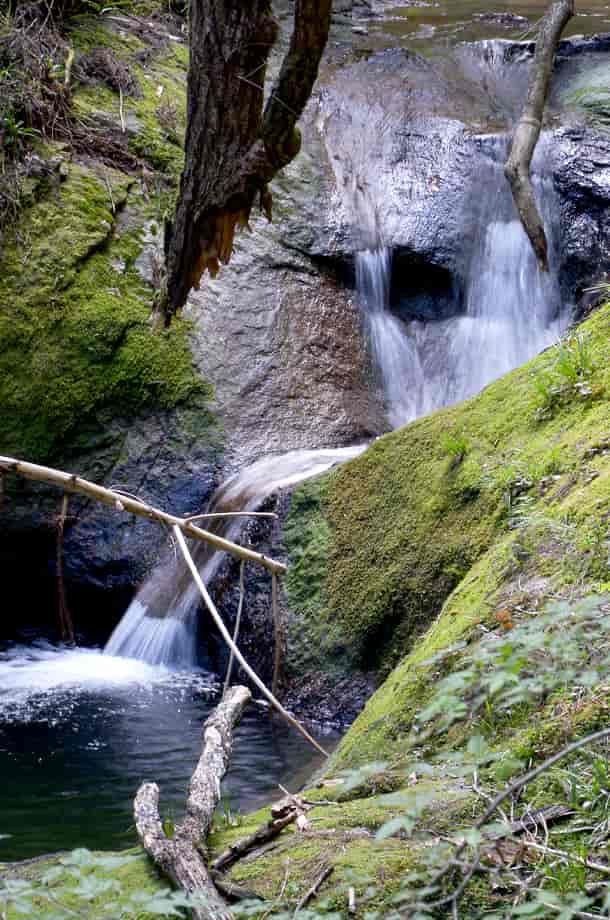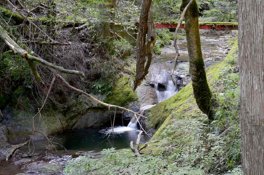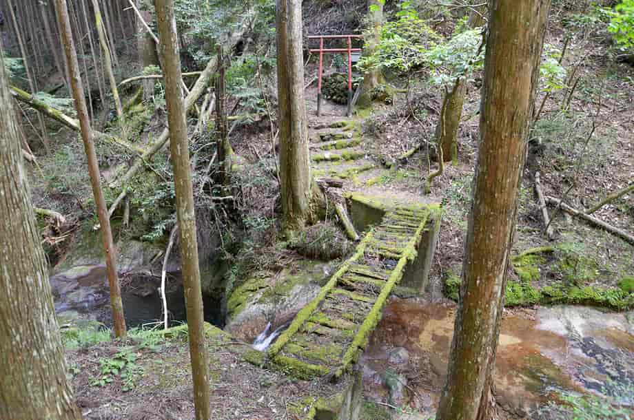 奈良県東吉野村にある鷲家大明神は、上社と下社に分かれていて、どちらも鷲家川の支流沿いにある。 この川はちょっとした渓流のような感じで、それぞれの社の前に渓流滝がかかっている。 「上社の滝」は下社から300mほど上流側にあり、歩いてもそれほど時間はかからない。 下社からの道もよく整備されていて、車なら、上社の少し先に駐車する場所がある。 下社から鷲家川の支流沿いに上がってくると赤い橋が架かっているのが目に留まるが、ここが上社になっている。 上社には道路側に赤い鳥居がないが、橋を渡ったところに鳥居があり、この奥に祠のような小さな社がある。 赤い鳥居は橋に近づくと目に入るが、上社の滝も橋のところに流れ落ちていて、落差3m程の段瀑になっている。 小さいながらも広い滝壺をもっていて、水もよく澄んでいて美しい。 また、この滝も「下社の滝」のように、逆「く」の字のようになって流れ落ちているようにも見える。 辺りの様子も下社と似ていて、周辺の渓流の様子を楽しむことができる。 社へは橋を渡っていくことになるが、こちらの橋もかなり老巧化しているので、鳥居奥にある社までは、一度沢に降りてからの方がよい。 ただ、橋の下流側からでは滝があるので、上流側の適当な場所から沢に降りて、そこから対岸の社に向かう方がよいが、水量が多いと、長靴などが必要になるかもしれない。 また、鳥居を潜ったところ、橋の手前から左に下り道があるので、そこからなら沢に降りて、滝を下流側から眺めることができる。 ところで、滞在中、上社・下社の両方の滝とも誰とも会わず、往来する自動車も見かけなかったが、この辺りの渓流の景観は思っていたよりもきれいで、散策するにはちょうどよい。 道も整備されていて歩きやすいので、時間があれば、周辺を散策してみるのもよい。 鷲家大明神・上社の滝への交通・アクセス 鷲家大明神・上社の滝は、下社から300mほど上流にあるが、下社まではそのページで紹介しているので、下社からは道沿いに上流側へ向かえは、それほど時間はかからない。 |