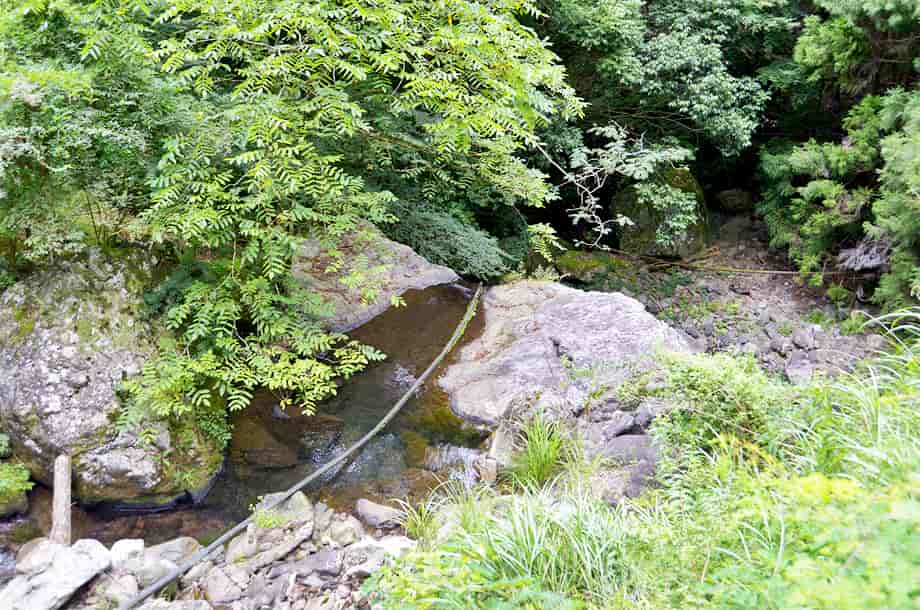 奈良県川上村にある「蛇滝」は、武木地区を流れる吉野川の支流・武木川に流れ落ちている。 全体は10~12m程の段瀑で、水の流れは、見る角度によっては「く」の字ようにも見える。 その様子が名前の由来のようだが、残念ながら、この時はその様子をよく見ることができなかった。 掲載している写真のように、この時は植物がよく繁茂していて、ほとんど葉隠れのようになってしまっている。 滝下へは、落ち口の辺りから降りることができるのかもしれないが、下流側からでは、まったく足元が見えない状態にもなっている。 この滝を見るには、春先か晩秋辺りがよいのだろうが、下流側の沢の様子なども全く見ることができなかったのは残念ではある。 ところで、この蛇滝の落ち口辺りには祠が建てられているので、何か謂れがある滝なのかもしれない。 祠は林道脇に立てられていて、上流側のすぐの所には、小さな堰堤も見られる。 この祠から道路を挟んで蛇滝の落ち口の様子を見ることができるが、この辺りから滝下へ降りることができるのかは分からない。 落差があり、流れにも変化がある滝なので、滝下辺りから眺めれば、おもしろい景観を楽しめるのかもしれない。 蛇滝への交通・アクセス さて、蛇滝の上流には「二又の滝」があるが、付近までの交通はそのページで紹介しているので、国道169号線の分岐からだと、橋を渡った先を「武木」方面へ向かう左へと進む。 林道を700~800m程進むと、右手に小さな祠が祀られているのが目に入る。 この祠の辺りが「蛇滝」の落ち口になっていて、蛇滝は、林道をやや戻っていくと遠望できる。 植物が繁茂していない時期なら、下流側から上ってくるときにもはっきり遠望できそうだが、植物が多いと、注意していないと見落としてしまうかもしれない。 尚、二又の滝は、ここから林道を更に進んで行くと、林道の右手に見える。 ただ、滝前には急な斜面を降りなければならないので、ロープなどを用意しておいた方がよい。 |