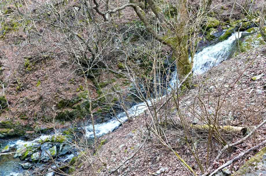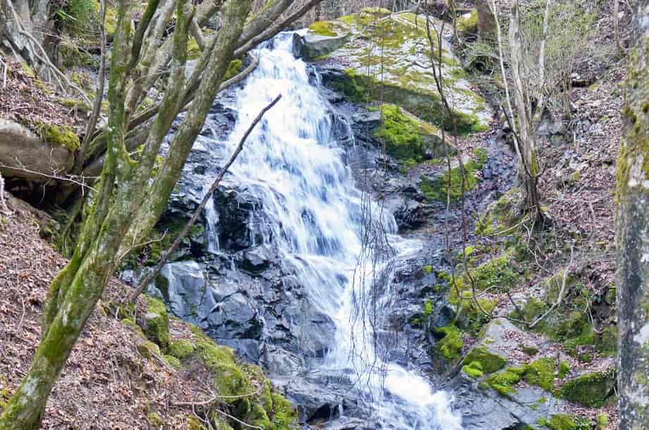 奈良県宇陀郡御杖村にある「魚止滝」は、神末地区に流れる神末川の枝沢に流れ落ちている。 「魚止滝・魚止めの滝」などと聞くと、あまり大きな滝という印象がないのだが、御杖村にある魚止滝は、思っていた以上に大きい。 落差は15m程で、斜瀑でもあることから奥行きもある。 道路から見える滝でもあるが、滝前辺りから眺めると、ずっと落差が感じられる。 道路から少し斜面を降りて眺めても、魚止滝は落差だけでなく、長さのある滝であることも分かる。 普段の水量は分からないが、この時の水量はちょうどよいくらいで、下段部分の流れがふた筋に分かれているのもよく分かった。 ただ、滝近くにはやや急な斜面を降りていかなければならず、この時は沢までは降りなかった。 その為、足場は限られたところにはなったが、道路から見るよりは落差があり、魚止滝はなかなか立派な滝だと感じられた。 魚止滝への交通・アクセス さて、魚止滝へは、神末地区にある「みつえ青少年旅行村」を目指すと分かりやすい。 その付近までの交通は「不動の滝(三峰山不動の滝)」のページで紹介しているので、魚止滝へは、みつえ青少年旅行村のゲートを過ぎて、不動の滝との分岐になる「三峰山登山口」の分岐もそのまま直進する。 直進すると旅行村のテントサイトや管理錬が右手にあるが、ここも通り過ぎて、更に道なりに進んで行く。 しばらくすると直進と左への分岐があるが、そのまま直進する。 少し行くと道が大きく左へと曲がるところに橋が架かっているが、魚止滝はこの橋のところに流れ落ちている。 自動車の場合、不動滝との分岐から5~6分程だが、自動車は付近の邪魔にならないところに駐車することになる。 滝は道路からでも見ることができるが、滝下へは、踏みあと程度の道を探して、急な斜面を降りなければならない。 |