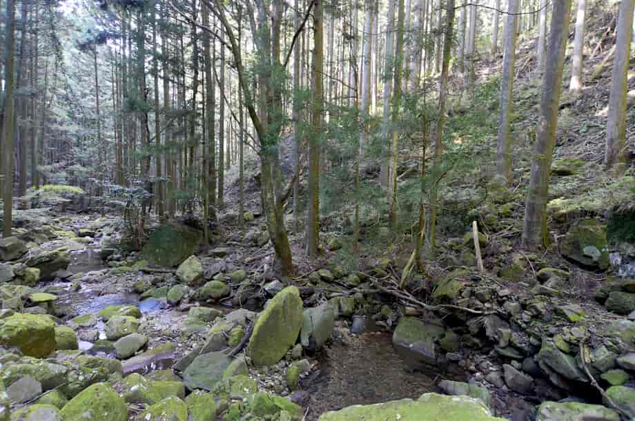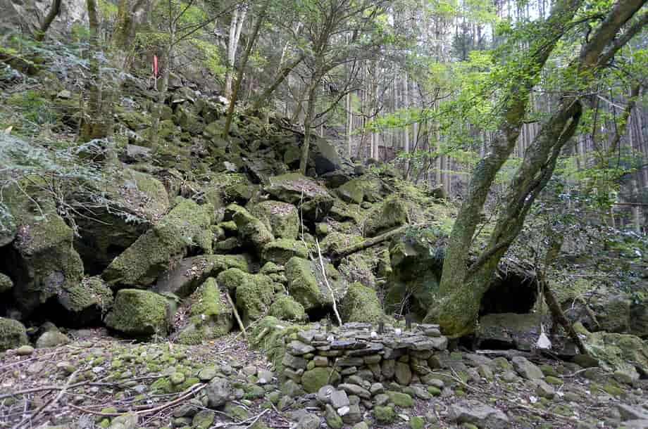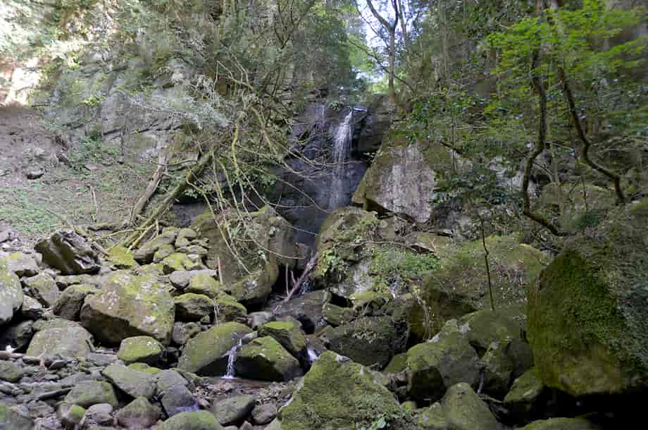 奈良県曽爾村にある「不動滝」は、伊賀見地区を流れる青蓮寺川の枝沢に流れ落ちている。 他の不動滝との混同を避けるため、普通は「伊賀見不動滝」と呼ばれていて、落差は8~10m程だろうか。 全体は段瀑のようにもなっているが、主瀑は上段の滝で、水はまっすぐに流れ落ちている。 名前のように、信仰の滝でもあり、やや離れた斜面に日蓮宗の題目が彫られた石柱が建てられている。 また、斜面下の河原には、しっかりとした石組みの祭壇も設けられていて、この滝が地域から大切にされていることがよく分かる。 この時の水量は少ないようだったが、それでも、上段の滝にははっきりとした滝壺が見られる。 下段部分も僅かに水が別れて流れ落ちているので、水量が多いと、幾筋かの流れを見ることができるのかもしれない。 しかし、倒木があったりもするが、不動滝は周辺の景観と共に落ち着きを感じさせる滝で、閑静な中、信仰の滝に相応しくも感じられる。 ところで、不動尊は、ふつう真言宗によって祀られていると思うのだが、不動尊の近くには、日蓮宗の題目が彫られた石柱も建てられている。 詳しいことは分からないが、いずれにしても、この不動滝が、多くの人たちの信仰の集めていることが窺える。 伊賀見不動滝への交通・アクセス さて、伊賀見不動滝の上流には「梯子滝」があるが、梯子滝までの交通はそのページで紹介しているので、梯子滝からだと林道を150m程戻ることになる。 梯子滝の上に架かる橋から150mほど林道を下って行くと、道が左へと曲がるところがあるので、不動滝へは、この辺りから斜面を降りていくことになる。 自動車は、このカーブのところが少し広くなっているので止めることができるが、駐車位置には注意する必要がある。 梯子滝の所にある橋から戻ってくると、このカーブの手前に尾根のようにも見える斜面があるので、滝へはこの辺りから入って行くことになる。 少しばかり斜面を降りていくと沢が見えてくるので、沢が見えた辺りから左へ向かって降りていくと滝音が聞こえ、不動滝を遠望できるようになる。 沢に降りると周辺はよく開けていて、対岸には、石組みの祭壇があるのが目に入る。 ここから祭壇前の斜面を見上げると赤い幟が目に留まり、石柱が建てられている。 この祭壇辺りからでも不動滝の全景を見ることができるが、滝前にもすぐにたどり着くことができる。 ただ、上段の滝へは少しばかり岩を登らなければならず、滝前には倒木もあるが、苦労するほどではない。 また、林道から沢までの斜面は、やや急な所や倒木があったりするが、特に危険なようなところはなく、駐車位置から10分もあれば滝前に着く。 ところで、祭壇辺りから対岸を見てみると、ほぼ平坦に見える山道が延びているのが分かる。 この山道は、不動滝への参道になっているようにも見えるので、下流側のどこかに参道口があるのかもしれない。 この時は斜面を降りてきたので、その山道を歩いていないが、しっかりとした祭壇があることからも、参道としての山道があるように思える。 その様な参道があれば、斜面を降りることもないので、再訪する時には、その様な道を探してみたいと考えている。 |