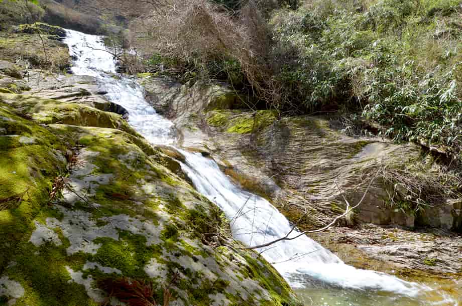 奈良県曽爾村にある「済浄坊の滝」は、今井地区を流れる青蓮寺川の支流・横輪川に流れ落ちている。 落差18m程の段瀑で、上段の滝は「二の滝」、下段の滝は「一の滝」とも呼ばれている。 残念ながら、この時は上段の滝へ向かう遊歩道の途中が倒木で塞がれてしまっていて、この下段の滝だけしか見ることができなかった。 しかし、この下段の滝は素晴らしい。 落差は10m程で、途中で隆起した岩の様子もおもしろく、水は二筋か三筋になって流れ落ちている。 それに、傾斜も緩やかなので、どこか雅やかな感じがしないでもない。 滝前は広く開けていて清々しく、滝壺も広くて、水は澄んでいる。 付近は「済浄坊渓谷」と呼ばれ、上段の滝から更に上にも、幾つかの淵や滝があると聞いている。 「済浄坊の滝」とは、この渓谷に流れ落ちている滝の総称でもあり、この下段の滝を一の滝として、上流側に向かって二の滝、三の滝と続いているのだろう。 この下段の滝(一の滝)の様子から察すると、さぞ綺麗な景観が続いているのだと思うが、上流側を散策できなかったは残念だが、機会を見つけて、再び訪れてみたい渓谷である。 ところで、「済浄坊」という名前は、「かつてこの辺りに済浄坊という寺があり、修験者が行水をして身を清め、水煙大不動明王の霊を仰いだと伝えられる」ことから付けられているとのことだが、「坊」というのだから、 寺ではなく僧侶の居所のようなものだったのだろう。 また、この「坊」は、むしろ不動明王の霊を仰いだと伝えられる修験者の名前から付けられているようにも思うが、確かなことは分からない。 済浄坊の滝への交通・アクセス さて、済浄坊の滝へは、曽爾村役場辺りを目指せば分かりやすいが、下流側にある「長走りの滝」も済浄坊渓谷の滝のひとつと言われている。 長走りの滝までの交通はそのページで紹介しているが、長走りの滝から済浄坊渓谷の入り口までは近く、渓谷の入り口へは、長走りの滝の案内板を越えて少し上流側へ向かう。 5分程歩けば小さな橋が架かっているので、この橋を渡った道路左側に渓谷への入り口がある。 ここには「 済浄坊の滝」の案内標識も立てられているので、見落とすことはないと思う。 自動車の場合は、案内板付近が少し広くなっているが、辺りの邪魔にならないところに駐車するように注意する。 遊歩道はよく整備されていて、渓流を左に見ながら進んで行くと広場がある。 広場から少し先は、道が崩落しているところがあり、やや荒れた感じがするが、特に問題はない。 更に歩いていくと、石畳の道になり、やがて石の橋がある。 この橋を渡ったところに石垣が崩れたように見えるところがあるが、これは自然の岩で、一見すると石畳みの続きのようにも見えておもしろい。 しかし、この先には大きな倒木が遊歩道を遮っていて、この辺りで、一度川を渡らなければならない。 渡れそうなところを探して渡渉し、少し進むと、対岸に下段の滝(一の滝)が見える。 滝前は開けていて、水も澄んでいるので気持ちがいい。 また、対岸から眺めると、倒木を越えたあたりから遊歩道が続いているのが見えるので、再度渡渉して遊歩道を進んで行くと上段の滝(二の滝)がある。 この時は先に進まなかったが、上流側には幾つか滝があるので、再度渡渉できそうであれば先に進んでみるのもいい。 遊歩道入り口からここまで10分程だが、倒木があって渡渉しなければならないので、時間はもう少しかかるかもしれない。 しかし、現在は整備されていて、遊歩道も歩きやすくなっているようにも思う。 |