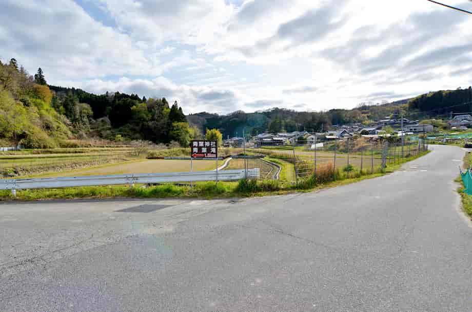 | ▲集落内の標識・反対方向からだと見づらい | ▲入り口にある案内標識・右奥が駐車場 |