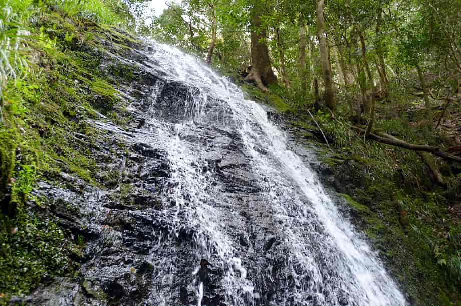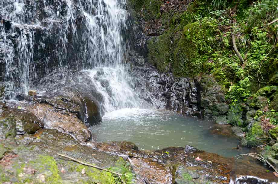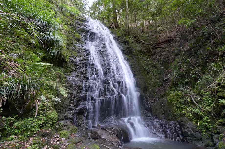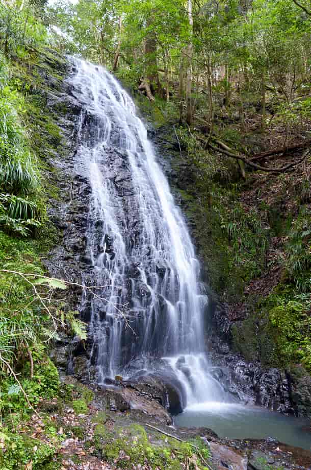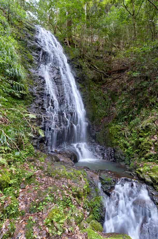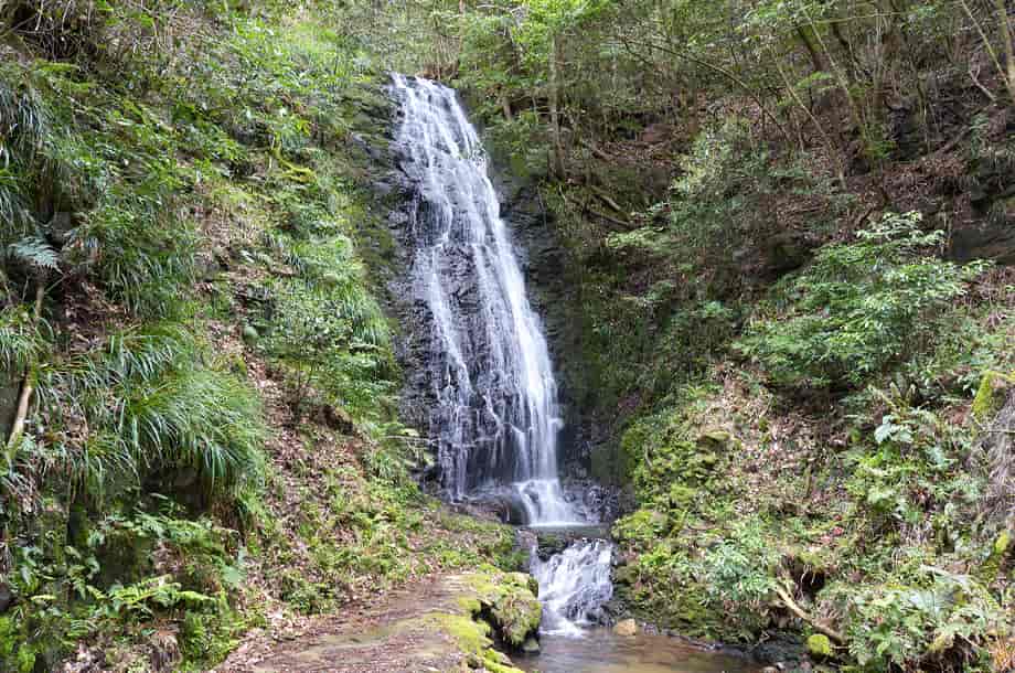 奈良県宇陀市にある「青葉滝」は、室生下笠間地区を流れる笠間川の枝沢に流れ落ちている。 落差は12m程で、この地区にある青葉神社の奥にかかっている。 水は黒っぽい岩を流れ落ちているが、岩肌が粗いので、さざ波を打つように流れ落ちる様子がおもしろい。 滝下近くまで遊歩道が延びているので、間近で見ることができるが、青葉滝は下から見ると思ったよりも落差があり、落ち口から流れる水の様子もよく分かる。 また、滝壺から先にも小さな滝があるので、ここまでを含めれば段瀑のようにも見え、落差もより大きく感じられる。 滝前も開けているので清々しく、伸びやかな空間が広がっている。 滝の様子は水量によって大きく違って見えるが、周りの景観によっても随分と左右される。 青葉滝は奥まったところにあるが、周辺と滝の様子がひとつになって、調和がとれた雰囲気がある。 遊歩道の途中からでも遠望できるが、青葉滝は遠目で見ても素晴らしく、目に入った時には、滝前への期待が膨らむ。 また、青葉滝は手前にある青葉神社・拝殿前からそれほど離れていないが、ここまでの遊歩道も整備されていて気持ちがいい。 神社や滝周辺もよく整備されているので、地域から厚い信仰を受けていることが伺える。 ところで、宇陀市には近くの三本松地区にある青葉寺に「青葉の滝」と呼ばれる名前のよく似た滝があるが、いずれも滝の形や趣が違っている。 どちらの滝も素晴らしく見応えするが、青葉の滝は階段状のはっきりとした段瀑になっているので、それに比べると、この青葉滝は穏やかな滝に見える。 また、青葉滝は、御杖村にある「三峰山不動の滝」にどこが似ているようにも感じられる。 どちらの滝も、主瀑の先に小さな滝があるからだろうか。 青葉滝への交通・アクセス さて、青葉滝へは、自動車の場合、奈良方面からの国道25号線(名阪国道)・「小倉」インターからだと、インターを降りた突き当りを「月ヶ瀬」方面へ右折する。 右折した先には「室生・やまなみロード →」との道路標識があるので、この分岐を右へ曲がる。 名阪国道の高架を潜るように右折したのちは、しばらく道なりに走っていく。 この道は「やまなみロード」で、やがて橋を渡るようになるが、この手前に「← 音楽の森・ふれあい館 2km」、「← 室生山上公園・芸術の森 13km」などの道路標識が左にあるので、この分岐を「音楽の森」へ向かって左へ入る。 左折するときは逆戻りするようになっているが、すぐに大きく右へ曲がる。 曲がり切ったところは突き当りになるので、ここは左への道をとる。 左折した道は県道781号線で、しばらくは道なりに進んで行く。 やがて、県道781号線は右へ曲がって「名張」方面へ向かうが、この分岐には標識が立てられているので、「山添・神野口IC ↑(県道782号線)」の指示に従って、山添方面へ向かって直進する。 ここからは道が細くなるが、舗装もされているので特に問題はない。 但し、途中で集落内を通ったりもするので、注意しながら走っていく。 しばらく走っていくと、集落を抜けた辺りに「大沢団地青葉ノ滝 →」と書かれた道路標識がある。 この標識は小さいので見落としやすいが、分岐の右にも「青葉神社・青葉滝 1.5km」の案内表紙が立てられている。 この標識のところが分岐になっていて、右の道へと入っていくが、手前から見ると、この分岐のすぐ先には小さな橋が架かっているので、この橋にも注意するとよい。 右に入ってからの道も細いが、舗装されているので特に問題はない。 ただ、離合する時には注意する必要がある。 そのまま走っていくと、道路右に「青葉神社・青葉滝」と書かれた案内標識があるので、ここが神社の入り口になる。 この入り口は道が左へと曲がるところにあるので、案内標識は、走っていると正面に見える。 ここまで、「小倉」インターから20~25分程度で、案内標識のところから入っていくと、すぐ先に駐車場があり、付近には簡易トイレも設置されている。 駐車場からでも、青葉神社の鳥居や拝殿が見えるが、本殿は拝殿奥の斜面に建てられている。 この本殿は近年に建て替えられたようで、新しい。 しかし、石灯篭などは随分古いもののようで、この神社が古くからあるものだと分かる。 拝観などを済ませたのち、鳥居の前から伸びている遊歩道歩いて行くと、ほどなく青葉滝が見えてくる。 遊歩道は舗装もされていて歩きやすく、滝前まで続いている。 |