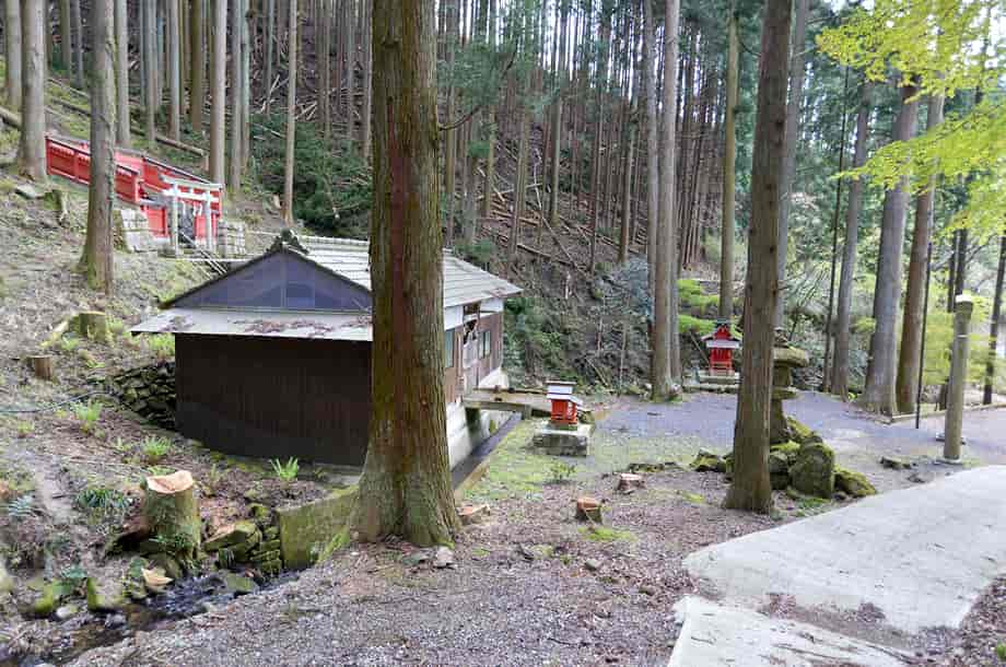 | ▲青葉滝へ向かう遊歩道から見た神社の様子 | ▲青葉滝 |