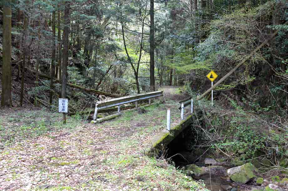 | ▲林道手前にある橋 | ▲案内板付近の様子 |