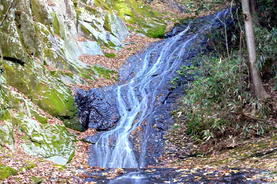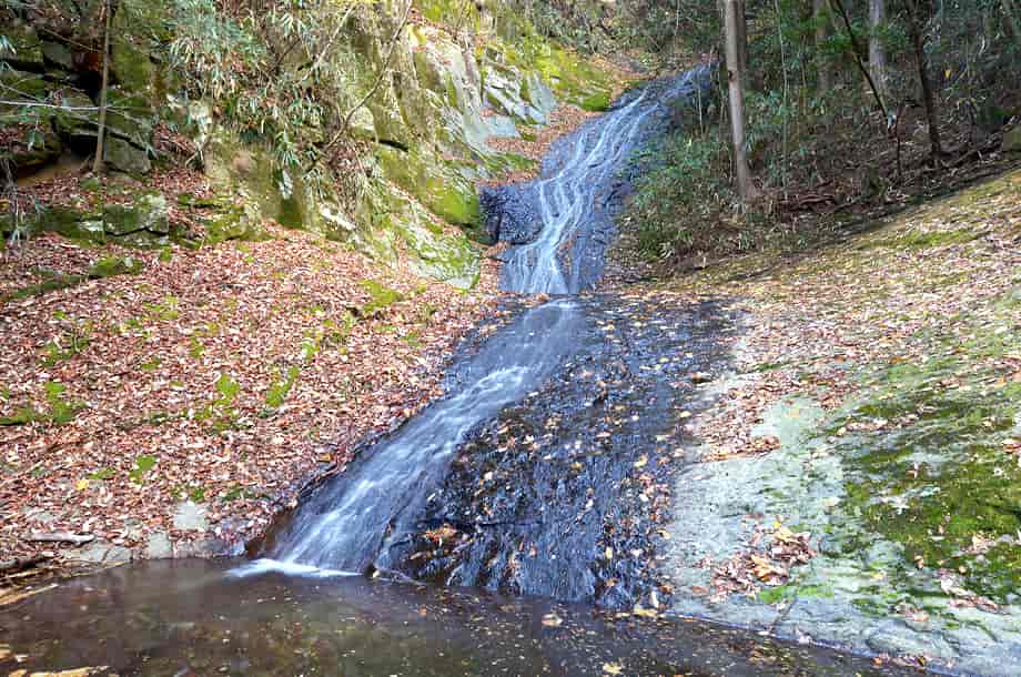 奈良県宇陀市にある「布引滝」は、下田口地区を流れる宇野川に流れ落ちている。 「南松の滝」の上流側にある滝で、上段の滝の落差は20m程度、下段の滝は5m程の立派な滝で、段瀑でもあり斜瀑でもある。 しかし、「布引」の名前のように、普段は布を引いたように岩の斜面をゆっくりと水が流れ落ちているようなので、滑滝といってもよいのかもしれない。 水量が多いと違った様子を現わすのだろうが、布引滝はその名前に相応しい滝だと言える。 滝前は開けていて、下流にある南松の滝は素晴らしいが、この布引滝も趣があって美しい。 ただ、滝壺も広いが、滝壺の前には大きな岩があるので平坦な場所は少ない。 しかし、この大きな岩の上から滝を眺めると、また違った風情が感じられる。 落差は南松の滝よりも大きく、滝の落ち口には右手の斜面を登って行くことができる。 南松の滝に比べると訪れる人は少ないようだが、落ち着きある滝で、時間はゆっくりと流れているように感じられる。 布引滝への交通・アクセス さて、布引滝は南松の滝の上流部にあるので、南松の滝の左斜面を登って滝上の山道に出て、そこから山道を右へ進んで布引滝へ行くこともできるらしいが、このルートはどうも分からなかった。 実際に斜面を登ってみると、かなりの急斜面になり、季節のせいか、藪のように繁茂する植物に行く手を遮られてしまった。 結局、上にある山道まで登れそうになかったので、南松の滝の入り口になる広場まで戻り、林道を更に進んで行ってから、南松の滝上を通る山道を通ることにした。 少しばかり距離は長くなるが、このルートの方が分かりやすく、安全であったとも思う。 広場から先のルートは、しばらく林道を歩いていくことになるが、道はやはりよく整備されている。 やがて左手の斜面に作業小屋があるのが目に入る。 ここまで、先ほどの広場の分岐から15~20分近くかかるが、右手のすぐ下が沢になっている。 この辺りから、沢向こうの斜面に山道が延びているのが見える。 作業小屋の少し手前に、よく見ると沢へ降りる道がついているので、沢までは簡単に降りることができる。 沢を渡るのも簡単で、あとは対岸の山道を進んで行く。 山道は、最初は急な登りになっているが、登り切った辺りで道は左へと曲がり、あとは平坦になったり下りになったりしていて、道もしっかりしている。 右手は谷になっていて、下には川が流れている。 しかし、この山道は南松の滝の上を通っているはずだが、滝などを見ることはなかった。 山道に入ってから20分ほど歩いていくと、沢が近くなり、小さな滑滝のような渓流滝がある。 そこから少し進むと沢に合流するようになるが、ここは沢を渡らずに右岸、向かって左の道を進んで行く。 先には大きな岩があり、行く手を阻まれているように見えるが、この岩は裏を簡単に通り抜けることができる。 ここまで林道にある作業小屋から20~25分程度で、岩の裏を通り抜けると、少し先に大きな岩の斜面がある。 この辺りから布引滝の一部が見えるので、斜面を越すと滝前に着く。 |
