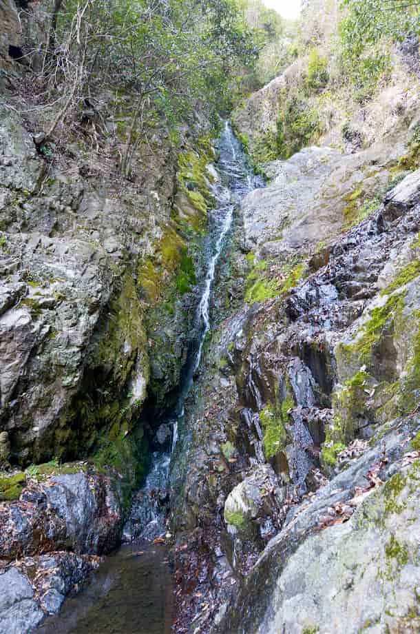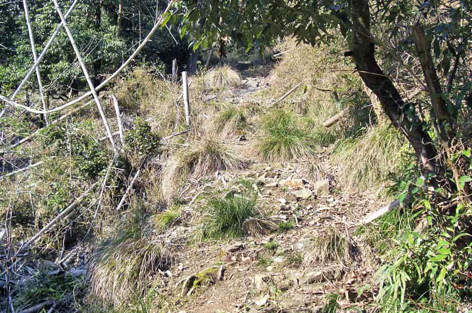 | ▲坑道跡の横にある小滝 | ▲整備された竹林跡の山道 |