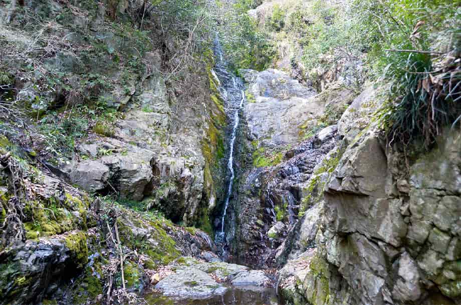 大阪府池田市にある「石澄の滝」は、畑地区を流れる石澄川の上流部に流れ落ちている。 山道を歩いて来ると、行く手を阻むように絶壁が立ちはだかっていて、滝はその崖を流れ落ちている。 落差25m程の大きな滝で、遠望した時には、思わずハッとする。 この時の水量は少ないようだったが、辺りの景観と共に、堂々とした印象を受け、清々しくもある。 住宅地からそれほど離れていないのに、このような滝があるとはやや驚きでもあり、落差も25mを超えているようにも見える。 水量が多いと、さぞかし見事な様子を現わすのだろう。 やや下流側にも小さな滝があるので、この辺りまでを含めると、落差はより大きく、石澄の滝は奥行きのある滝でもある。 近くには「箕面の大滝」があるが、石澄の滝は自然の様子もよく残していて、箕面の滝にも劣らない見事な滝だと思う。 ところで、付近の様子を見ると、右手の崖からロープが垂れ下がっているのが見える。 多分、上から降りてくるときの為なのだろうが、よくこのような崖を降りてきたものだと思う。 石澄の滝は訪れる人が少ないのか、近年までの山道は荒れていて、滝前に辿り着くには随分苦労したようなので、このロープは山道が荒れていた時に使われていたのかもしれない。 山道はやや歩きづらいところもあるが、最近は整備されていて、道ははっきりとしていて、全体に歩きやすくなっている。 いずれにしても、石澄の滝は見事な滝で、堂々とした様子が清々しい。 石澄の滝への交通・アクセス さて、石澄の滝へは、大阪方面から自動車で国道176号線を利用する場合、「豊中・池田」方面へ向かって北へ向かう。 中国縦貫自動車道を越え池田市へ入ると、国道171号線の高架を越えた少し先に「荘園口東」の交差点があるので、ここを右折する。 右折して6~7分程で「東畑」の交差点があるので、自動車はこの付近の駐車場を利用する。 石澄の滝へは、「東畑」の交差点を更に直進していくが、ここから先は住宅地になっていて、駐車場などもないので、「東畑」付近の駐車場を利用した方がよい。 「東畑」の交差点からは、そのまま山の方へ向かって直進し、住宅街を抜ける。 そのまま道なりに進んで行くと、5分程で山道の入り口に着くが、「東畑」の交差点からは、ずっと登りが続くので、もう少し時間がかかるかもしれない。 「東畑」の交差点から歩いて来ると、道は突き当りのようになるが、正面に車止めのある山道が延びているのがすぐに分かる。 石澄の滝へは、ここから山道を歩いて行くが、よく整備された道を5分ほど歩いて行くと地蔵尊が祀られている祠がある。 その脇に丸太橋が架かっているので、滝へはその橋を渡っていく。 但し、この丸太は古くなっているので、沢へ降りて渡る方がよい。 沢と言ってもほとんど水がないので、河原のように容易に越えることができる。 山道はここから先もはっきりとしていて、そのまま歩いて行く。 途中、右手の川へ降りることができそうな分枝があるが、ここを降りていくと「不動滝(石済不動滝)」があるが、石澄の滝へは、そのまま山道を進んで行く。 やがて「一心寺跡」や廃墟になった建物があるが、その先はやや広場になっていて「石澄の滝 0.7km →」と読める古い案内板が立てられている。 ただ、この案内板はかなリ古く、なくなっているか、新しいものになっているかもしれない。 先へ進むと、洞窟がある大きな岩があるが、この洞窟は廃坑となった坑道のように見える。 また、この岩の横には段瀑が流れ落ちていて、「石澄下の滝」とでも呼べそうな趣がある。 ここを過ぎ、案内板に従って右手へ向かうと、伐採された竹林跡があり、その先に竹や石で造られた階段状の山道が続いている。 ここを登り切るとやや開けていて、その先の沢を渡るが、ここもほとんど水がないので、容易に渡ることができる。 沢を越えるとまた廃墟の様な建物があるが、よく見ると、建物横に不動尊が祭られている。 ここから更に歩いて行くとちょっとした休憩所があり、ベンチが設置されている。 石澄の滝は、ここから左手に流れ落ちていて、そのまま進んで行くと右手にロープが張られている。 滝前には、このロープがあるので迷うことはないが、一度ロープは途切れてしまう。 しかし、ちょうどその辺りから石澄の滝を遠望できる。 滝前には、左手の大きな岩にロープがあるので、これを使って岩を登り切ると滝前に着く。 ここまで、山道の入り口から20~25分程で、道は全体にはっきりとしていて、歩きやすくなっている。 |