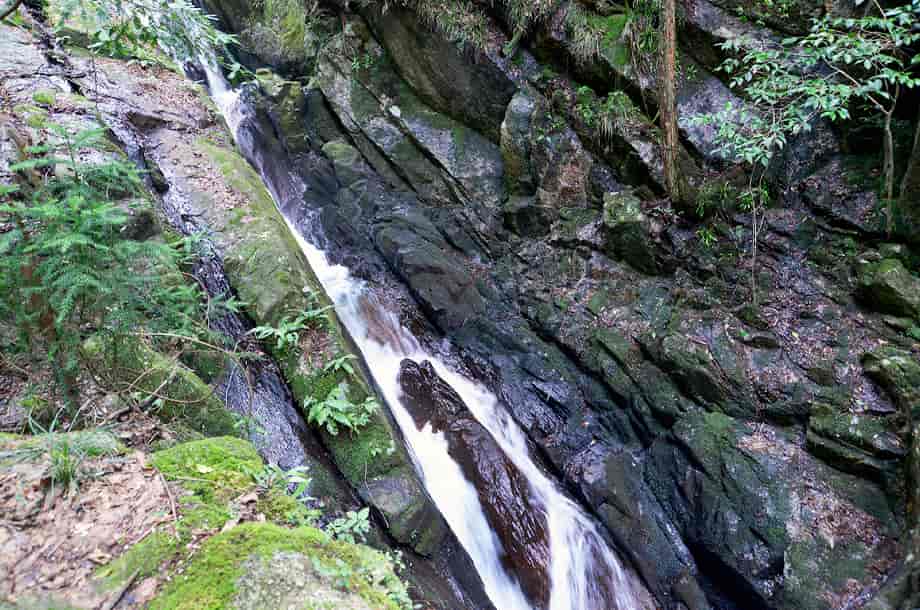 滋賀県甲賀市にある「白蛇の滝」は、信楽町神山地区を流れる大戸川の支流・神有川に流れ落ちている。 付近にある「鶏鳴の滝」などと共に「鶏鳴八滝」と呼ばれる内のひとつで、周辺は「鶏鳴の滝公園」としてよく整備されている。 白蛇の滝は、主瀑となる鶏鳴の滝の少し上流側にあり、10m程の落差はある。 段瀑のようでもあり、上段の部分は岩を深く削るように流れる斜瀑で、水は一気に流れ落ちている。 この部分の岩の様子には特徴があり、岩は長い板のようにも見えておもしろい。 下段部分では、小さな段瀑のようにもなっていて、深く見える滝壺をつくっている。 また、滝の名板は、下段の滝壺と思われる辺りに立てられているが、滝壺からの流れは、更に渓流滝をつくっている。 その下流側の渓流滝までを白蛇の滝としてとらえると、落差は10mを越えていて、長くて奥行きのある滝でもある。 いずれにしても、白蛇の滝は鶏鳴八滝の中でもやや違った景観をもっている。 「白蛇」の名前も妙を得ていて、全体の様子をうまく言い表している。 白蛇の滝への交通・アクセス さて、白蛇の滝は、「鶏鳴の滝公園」の中にあるが、そこまでの交通はそのページで紹介しているので、白蛇の滝は、公園の駐車場から遊歩道を歩いて行くと、5~6分程で滝前に着く。 他の滝と同様、近くには名板のタヌキの焼き物があるので見落とすことはない。 ただ、下流側にある鶏鳴の滝からすぐだが、ここまでの道はやや足元が悪いところもあるので、注意して進んで行く方がよい。 |