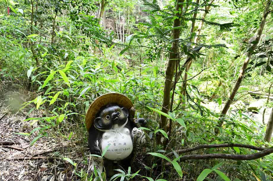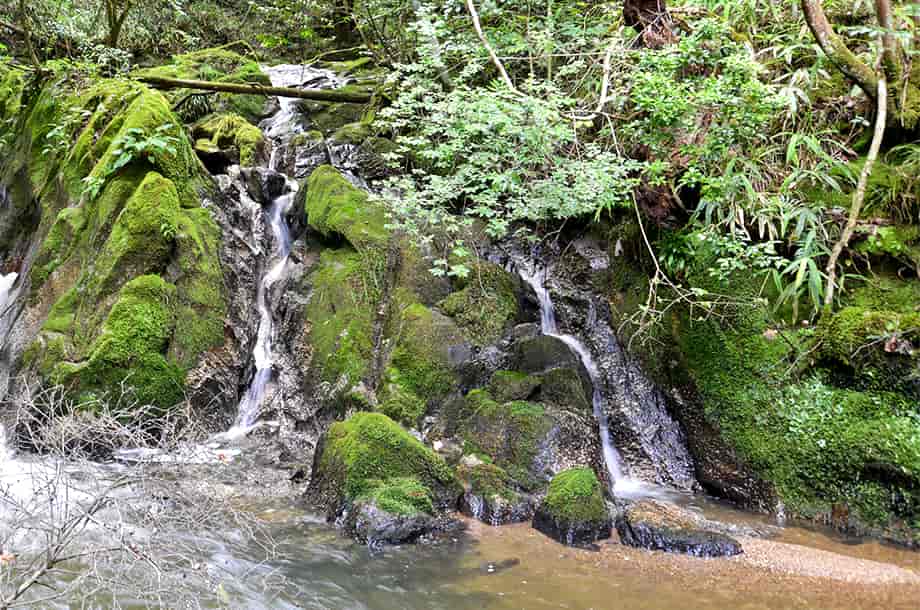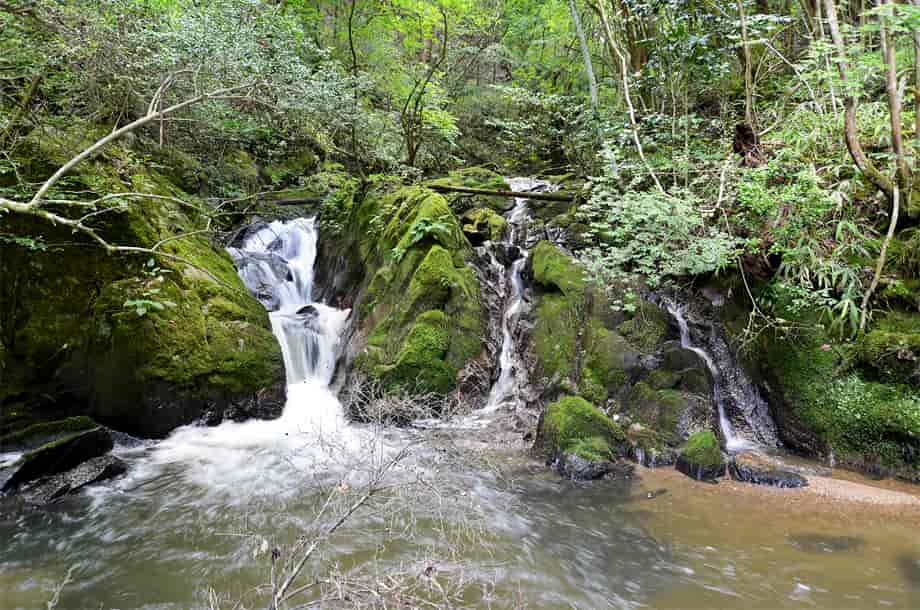 滋賀県甲賀市にある「神有の滝」は、信楽町神山地区を流れる大戸川の支流・神有川に流れ落ちている。 下流側にある「鶏鳴の滝」などと共に「鶏鳴八滝」と呼ばれる内のひとつで、周辺は「鶏鳴の滝公園」として整備されている。 神有の滝は、八滝の中でも主瀑となる鶏鳴の滝からはやや離れた上流側にあり、八滝の中でも最後の滝となっている。 落差3~4m程の小ぶりな滝で、水は三筋になって流れ落ちているように見えるが、神有の滝には、二つの滝が流れ落ちている。 左側の滝はやや奥まったところにあり、段瀑のようにもなっている。 これに対して右の滝は大きな岩を流れ落ちているが、この岩はよく突出していて、水は途中からふた筋に別れて流れている。 これが全体を三筋に見せているが、左右の流れの様子が異なっていて、味わいがある滝と言える。 大きい滝ではないが、どちらか一方だけを見てもおもしろく、二つの滝がつくる滝壺も広く、半ば淵のようにも見える。 神有の滝への交通・アクセス さて、神有の滝は「鶏鳴の滝公園」の中にあるが、そこまでの交通はそのページで紹介しているので、神有の滝は、遊歩道の最も奥になる。 公園の駐車場から遊歩道を歩いて行くと、やがて大きな堰堤を越えるようになる。 堰堤の上は大きな池が広がっていて、その縁に沿って遊歩道が続いているので、そのまま進んで行く。 堰堤までは登り坂が続くが、堰堤を越えてからの道は平坦になり、渓流の流れも緩やかになっている。 しばらく歩いて行くと「白布の滝」、少し先に「岩しだれの滝」があるので、これを過ぎると、遊歩道左に、名板となるタヌキの焼き物が置かれている。 神有の滝は名板付近にあるが、その辺りからだと樹木に隠れてよく見えないが、付近のやや急な斜面を降りていくと、正面近くから見ることができる。 |