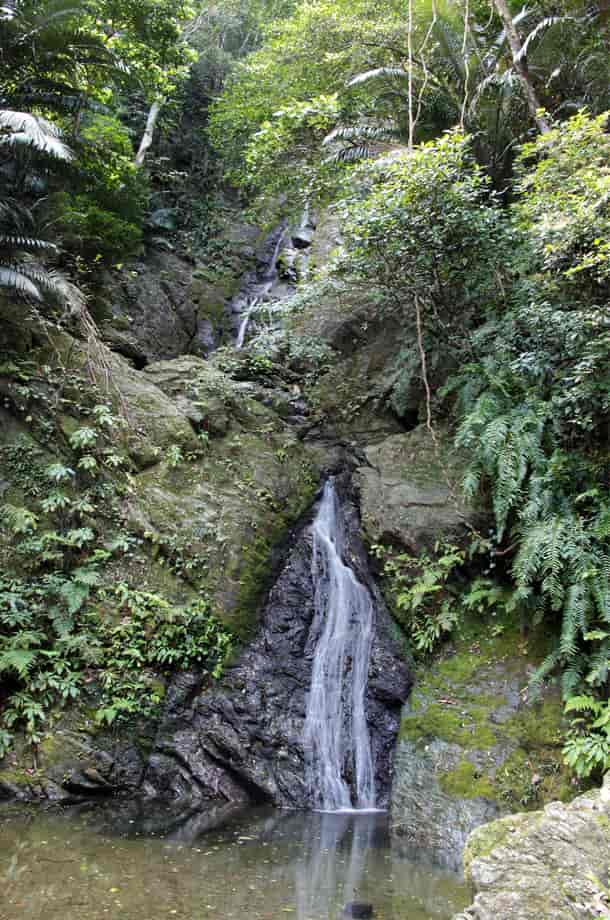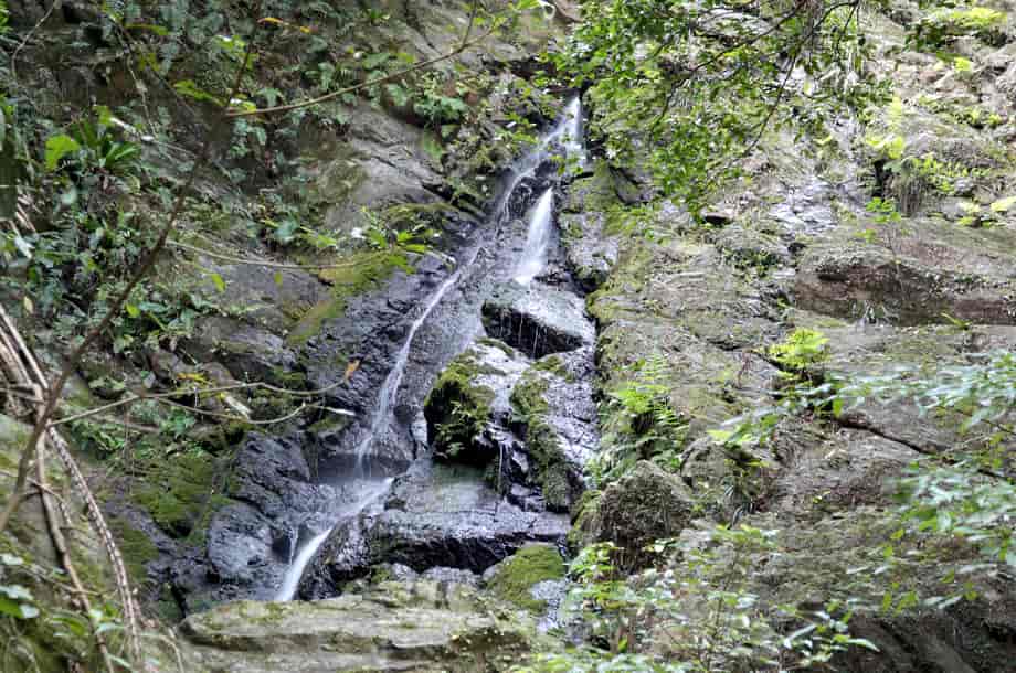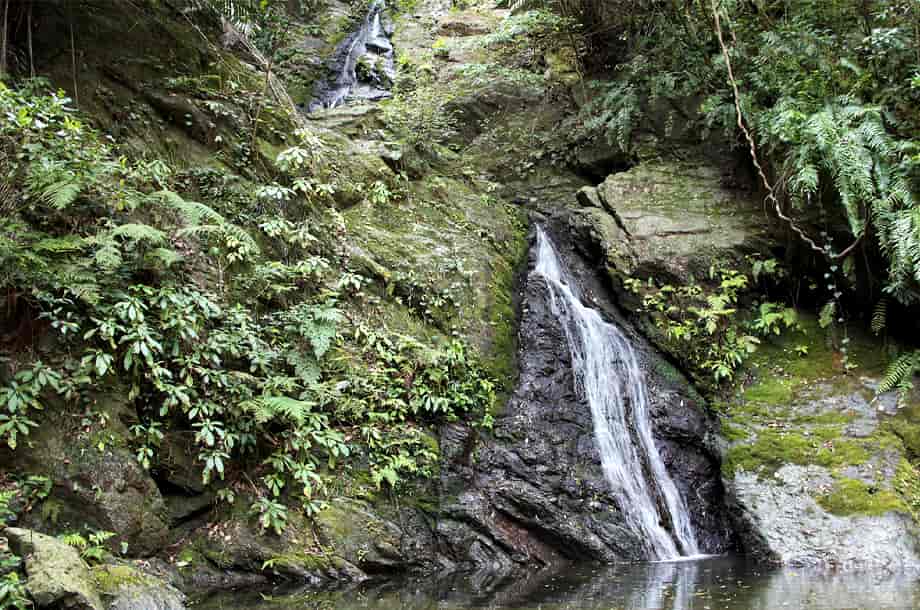 沖縄県大宜味村にある「七滝」は、喜如嘉地区を流れる幸地川に流れ落ちている。 全体は20m程の落差があるとされている段瀑で、水は途中で流れを変えて滝下に至っている。 「喜如嘉の七滝」とも呼ばれていて、「七滝」の名前は、この水の変化から付けられていて、流れ落ちるまでに七回の変化があるとされている。 上方部分の様子はよく見えないのだが、恐らく、全体は小さな七つの段瀑になっているのだろう。 成程、水の流れに変化があっておもしろい。 また、滝周辺はよく開けているが、自然の様子もよく残していて、浅いながらもはっきりとした滝壺をもっている。 滝壺からの水は、緩やかな小川のような流れに続いているが、水量が多いと、淵のような広い滝壺をつくるのかもしれない。 ところで、喜如嘉の七滝は、信仰の対象にもなっている。 滝は七滝拝所内にあって、鳥居を潜った先の神域に流れ落ちている。 その為、周辺はよく整備・管理されているようで清々しく、時折、鳥の声も聞こえてくる。 かつての琉球王府により編纂された『琉球国由来記』(1713年)にも記述があるとされていることから、この滝が古くから大切にされてきたことが伝わってくる。 また、滝の水を利用して水車を回していたとも伝えられているほか、現在の拝所は、昭和10年に現在の位置に移されている。 以前の拝所は、滝壺の東側に石を積んだものであったらしいが、拝所内の石組みなどを見ると、その様子が偲ばれる。 辺りは閑静で、ゆったりとした時間の流れが感じられる滝でもある。 七滝への交通・アクセス さて、喜如嘉の七滝へは、自動車の場合、名護方面からだと国道58号線を大宜味村方面へ向かう。 大宜味村へ入り宮城島を過ぎると、やがて道路右に「親川の滝」が流れ落ちる「道の駅 おおぎみ」があるが、ここも過ぎて更に進んで行く。 やがて、道路右に「大宜味村営・火葬場」と書かれた標識と駐車場があるので、ここを過ぎて少し行くと右へ向かう「Y」字路の分岐があるので、ここを右の脇道へ進む。 この分岐の正面には、「芭蕉布会館 150m →」の案内標識が立てられているので、それにも注意するとよい。 右へ入ると、すぐに「大宜味村農村環境改善センター」があり、その前の道路から右への分岐があるので、滝へはここを右へ入る。 分岐のところには「芭蕉布会館 150m →」の案内板も立てられているので、見落とすことはない。 あとは集落の中を道なりに走って行くが、途中、右への脇道に入って行く。 ここも「Y」字のような分岐で、分岐のところの建物には「七滝 300m →」の案内板が架けられているので、それにも注意しておくとよい。 また、この分岐の先で道は大きく左へと曲がり、途中には小さな橋が架かっているので、七滝へはこの橋を渡る手前の分岐を右へ入る。 道は細くなるが特に問題はなく、そのまま進んで行くと、滝への入り口となる鳥居があり、自動車は付近が広くなっているので駐車することができる。 ここまで、名護市役所辺りから35~40分程で、鳥居は七滝拝所の鳥居になっている。 滝は鳥居の辺りからでも遠望することができ、滝前までも容易に行くことができる。 但し、滝周辺を含め、鳥居から先は神域になっていることを忘れないように注意したい。 |