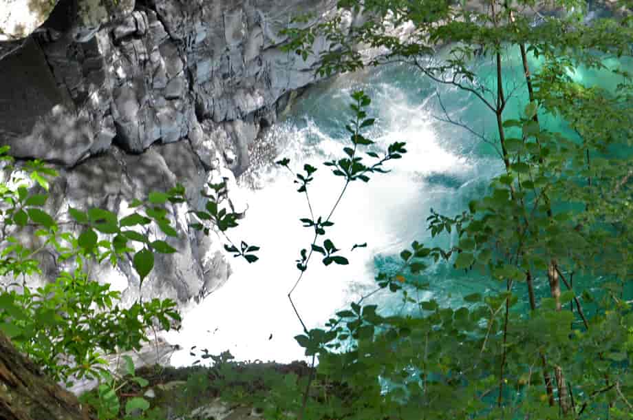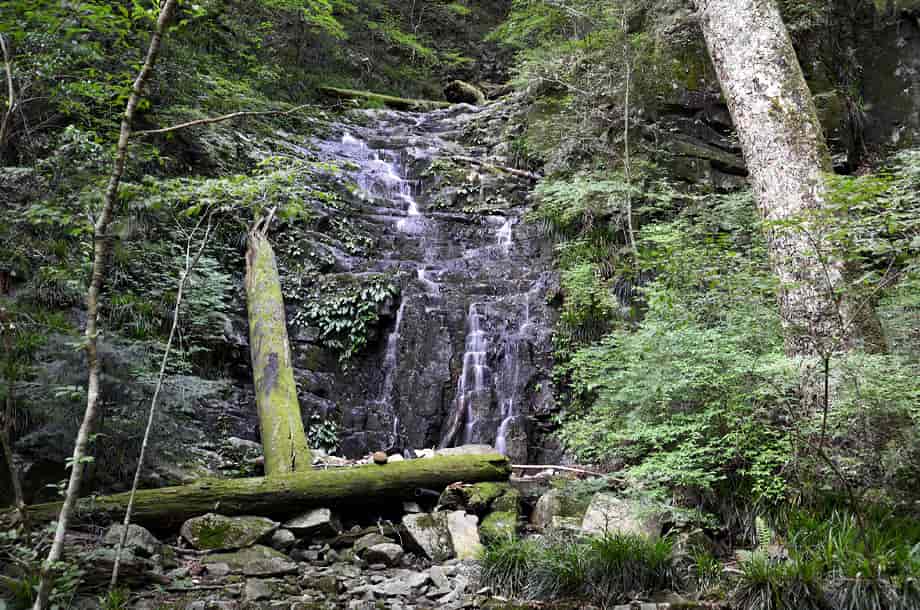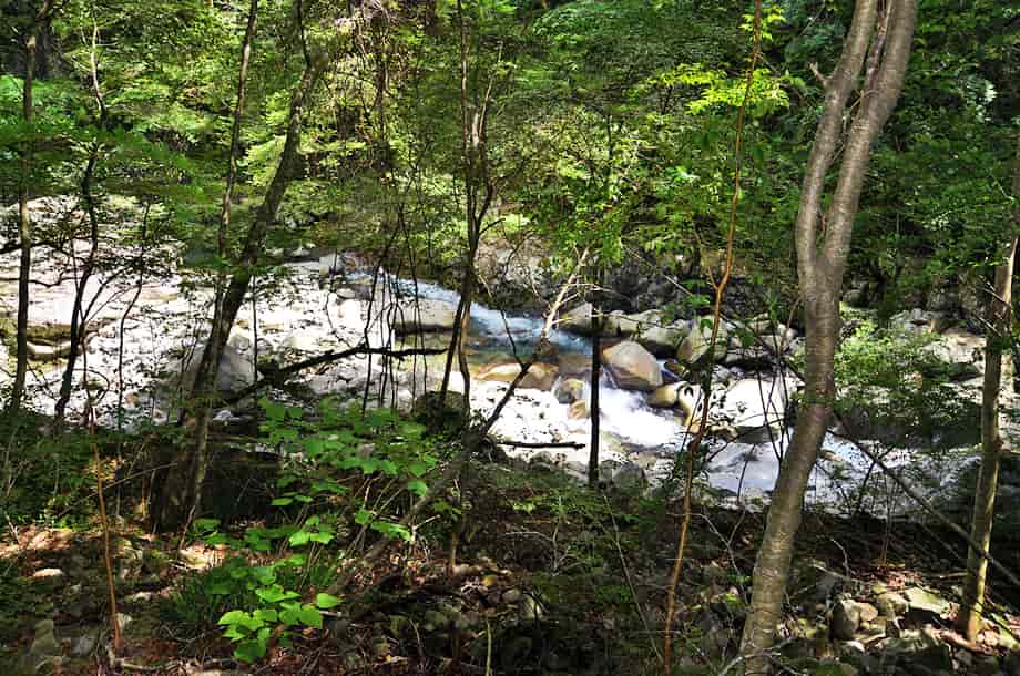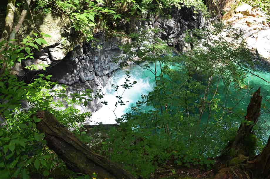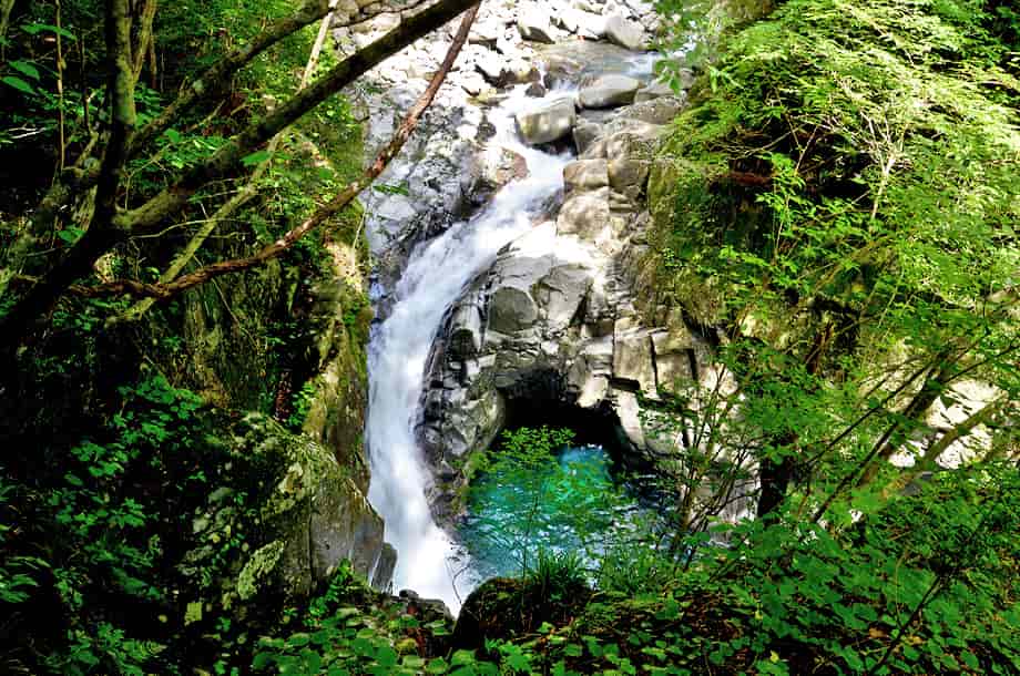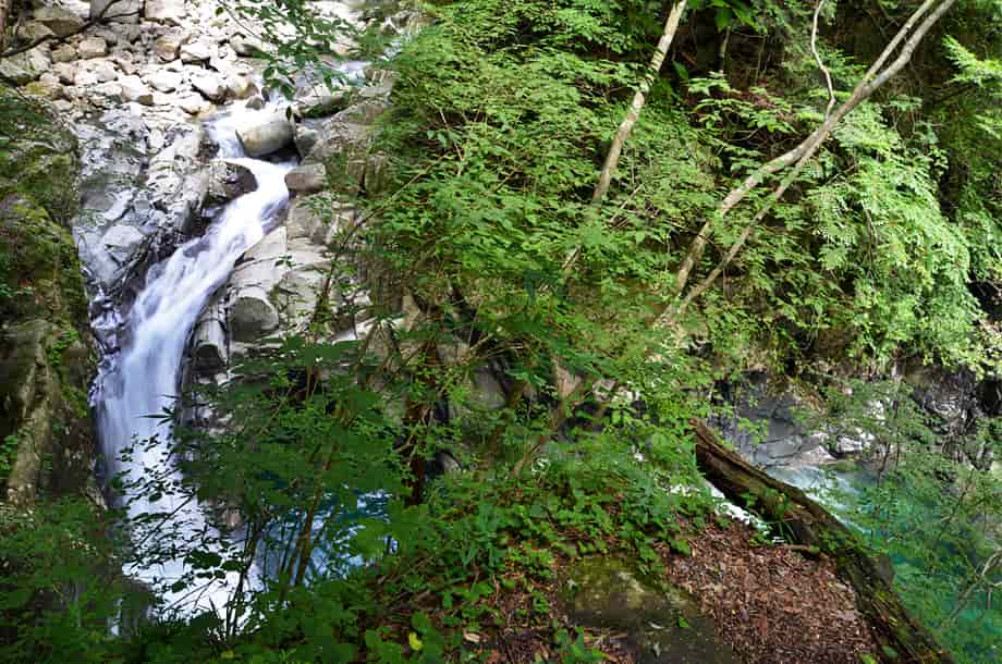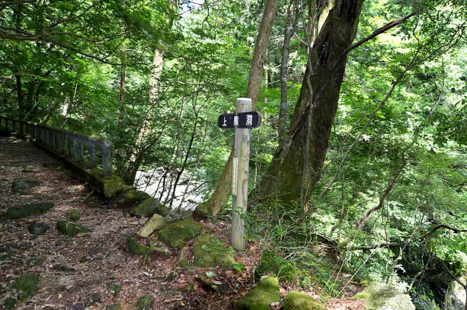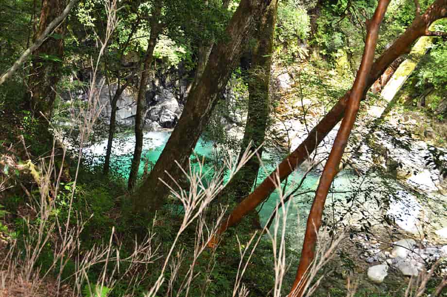 愛媛県久万高原町にある「上熊淵」は、若山地区にある「面河渓」の中にある。 面河渓は本流の面河川と、その支流である鉄砲石川からなる渓谷で、愛媛県の中でも有数の渓谷として知られている。 上熊淵は、本流の面河川にある淵で、下流側にある「下熊淵」から少し先にある。 下熊淵と同様、上熊淵も遊歩道から眺めることになり、この辺りの面河川も、遊歩道から随分下に流れている。 上熊淵もきれいな水を湛える大きな淵だが、淵をつくる水の流れがおもしろい。 しかし、この流れをつくっている滝の流れを含めた全体の様子は、樹木などに隠れてしまっていて、一望することができない。 残念ながら、滝や淵の様子などは限られた場所から眺めることになるが、落差のある滝から流れ落ちる水は滝下で大きく曲がり、淵のようにも見える滝壺は美しい水を湛えている。 この滝壺からからの水が、溢れ落ちるようにして上熊淵をつくっているが、水はやはり美しく、淵を取り巻く岩肌の様子もおもしろい。 ただ、滝の下方部分は見えづらいが、上下二段の滝としてとらえると、全体の落差は10m程はあるように見える。 しかし、上から眺めるだけなので、落差はもう少しあるのかもしれない。 また、この上段とも言える滝がつくる滝壺も美しく、こちらが上熊淵かもしれず、下段の滝がつくる淵を含め、両方の淵を上熊淵と呼ぶのかもしれない。 いずれにしても、上熊淵は素晴らしい淵だが、この淵をつくる滝を含め、全体の景観を捉えた方が味わいがあり、その形や規模も印象に残る。 尚、上熊淵をよく見ようとすれば、名板から少しばかり先に出なければならないが、周辺は急な断崖になっているので、あまり近づきすぎないようした方がよい。 下流側の下熊淵もそうだが、上熊淵は更に断崖で落差もある。 それに、下熊淵の名板辺りには柵が設けられているが、この上熊淵には柵がないので、名板辺りから見るにしても、足元には充分に注意する必要がある。 とにかく急な断崖なので、名板の所から先には出ない方がよい。 上熊淵への交通・アクセス さて、面河渓までの交通はそのページで紹介しているので、上熊淵へは、本流の面河川コースを進んで行く。 駐車場近くにある「亀腹」の先にある鶴ヶ瀬橋を渡ると、すぐに「面河四国カルスト自然休養林案内図」が立てられているので、この案内図に目を通しておくとよい。 ここから「紅葉河原」などを過ぎて歩いていくと、遊歩道の右に「下熊淵」の名板が立てられている。 上熊淵は、この下熊淵から少し先、距離にして240mm程なので、下熊淵からだと3〜4分もあれば上熊淵に着く。 亀腹の先にある鶴ヶ背橋からだと1140m程度で、歩いて15分程の距離にある。 遊歩道の脇に名板が立てられているので、見落とすことはないが、樹木に遮られてしまうので、眺める場所は限られてしまう。 |