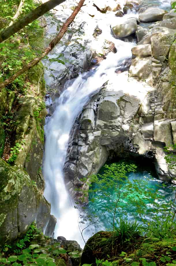 | ▲付近の遊歩道にある小滝 | ▲上熊淵をつくる上段の滝 |