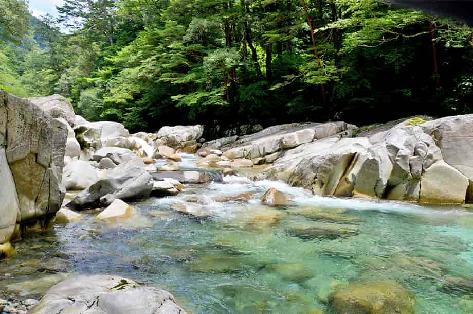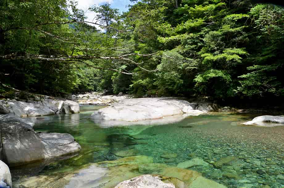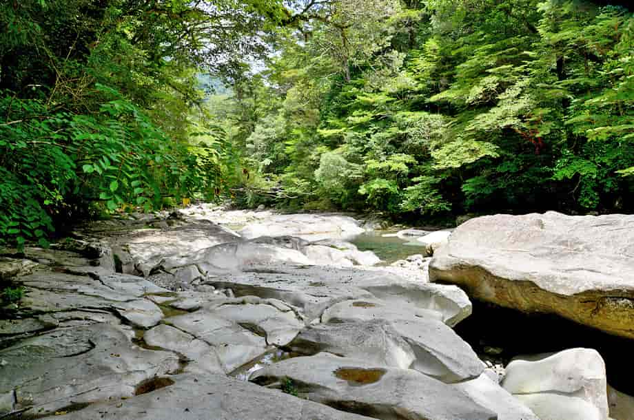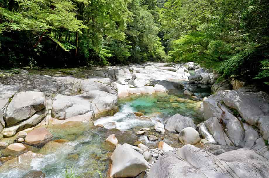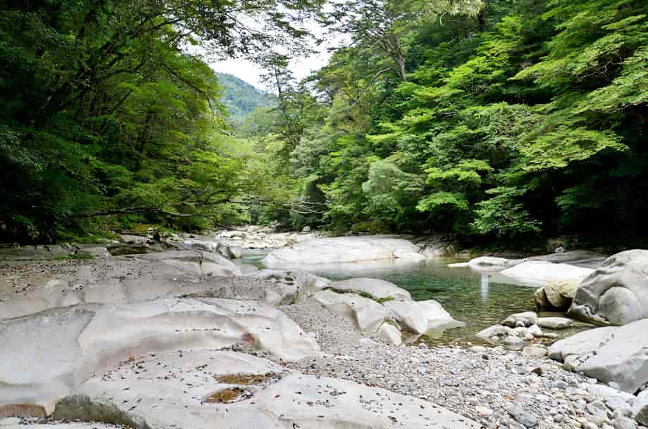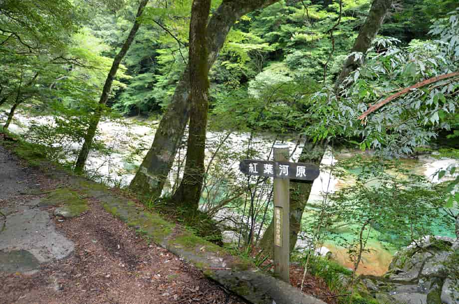愛媛県久万高原町にある「紅葉河原」は、若山地区にある「面河渓」の中に流れ落ちている。 面河渓は本流の面河川と、その支流である鉄砲石川からなる渓谷で、国の名勝にも指定されているだけあって、渓谷全体に渡って、その景観は素晴らしい。 紅葉河原は、本流の面河川にある広い河原で、遊歩道からでも眺めることができる。 しかし、河原へは容易に降りることができるので、遊歩道を逸れて河原へ降りて見ると、辺りの景観に少しばかり感嘆する。 河原と言っても砂利河原ではなく、紅葉河原は大きくて平らな岩が目を引く。 それに、この辺りは面河川でもかなり上流部になるが、辺りの岩を見ると、研磨されたように角が丸くなっている。 岩質にもよるのだろうが、この様に丸くなるには、水量も豊富で、さぞ長い年月を必要としたのだろう。 水もよく澄んでいて、名前のように、辺りには楓が多いので、紅葉の時期にはさぞかし美しい景観を現わすことだろう。 視界が開けているので周辺の様子も清々しく感じられ、紅葉河原は下流側にある「五色河原」と共に、面河渓らしい景観が印象に残る。 この紅葉河原から先には「下熊淵」や「上熊淵」、「虎が滝」なども流れ落ちているが、この紅葉河原を見ると、それらへの期待も膨らんでいく。 紅葉河原への交通・アクセス さて、面河渓までの交通はそのページで紹介しているので、紅葉河原へは、「亀腹」の先にある「鶴ヶ背橋」を渡って上流側に進み、本流の面河川コースを進んで行く。 橋を渡ると、すぐに「面河四国カルスト自然休養林案内図」が立てられているので、この案内図に目を通しておくとよい。 案内図では、ここから紅葉河原まで350m程で、途中には第一キャンプ場があるのが分かる。 また、この辺りは「蓬莱渓」と呼ばれていて、鶴ヶ背橋からでもその一部を眺めることができる。 案内図からそのまま遊歩道を進んで行くと、右手にある第一キャンプを過ぎて、しばらく行くと遊歩道の左右に「紅葉河原」の名板が立てられている。 ここまで鶴ヶ背橋から4~5分程で、キャンプ場の中を通り抜けたり、右手に見える渓谷の景観などを楽しみながら歩いて来ると、ほとんど時間がかかったようには感じられない。 河原へも簡単に降りることができ、ひと休みするほどの距離ではないが、しばらく時を過ごすのもよい。 上流側、下流側の眺めも素晴らしく、時折、鳥の声も聞こえてくる。 |