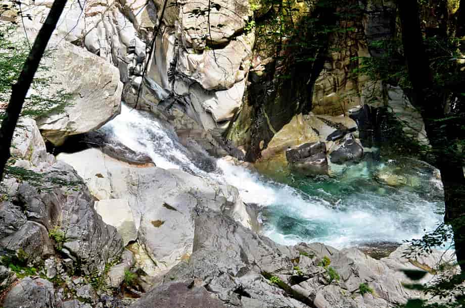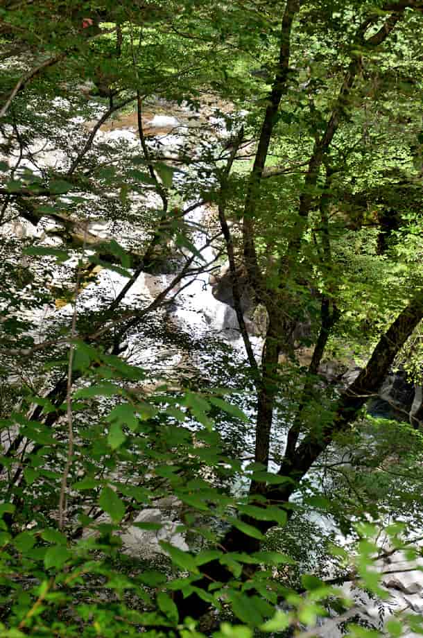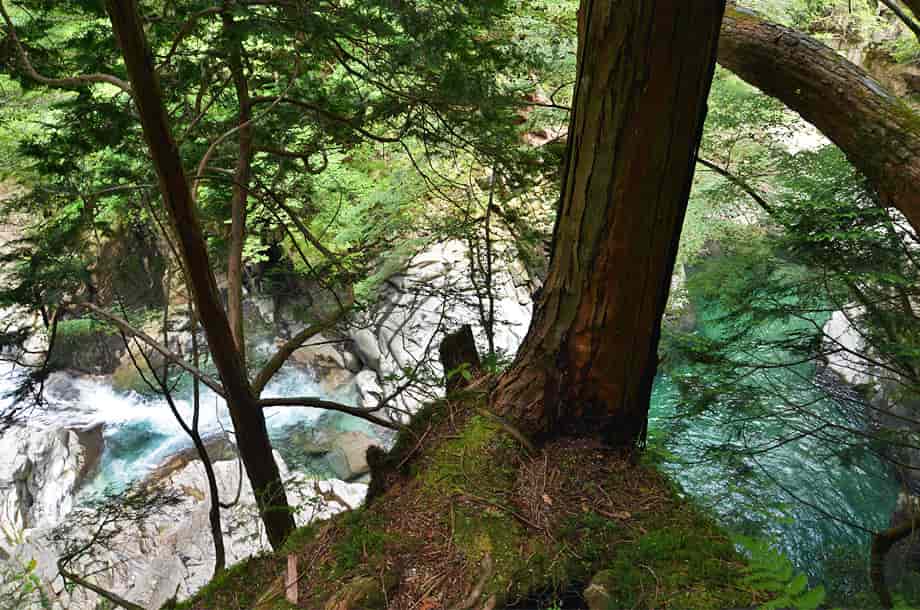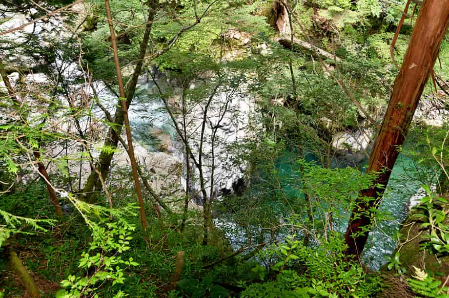 愛媛県久万高原町にある「下熊淵」は、若山地区にある「面河渓」の中にある。 面河渓は本流の面河川と、その支流である鉄砲石川からなる渓谷で、下熊淵は本流の面河川にある。 透き通ったきれいな水を湛える大きな淵で、その様子は遊歩道から眺めることができる。 ただ、植物が繁茂する時期などは葉隠れしてしまい、全体の様子はよく見ることができない。 また、この辺りの面河川は遊歩道から随分下の方に流れているので、下へ降りてみることもまずできない。 それでも、遊歩道から見る下熊淵は美しい水を湛えていて、淵の形もおもしろい。 一方、この淵をつくる滝の流れは急で、大きな滝音が聞こえてくる。 この滝は大きくはないが、6~7m程の落差はあるだろうか。 上から見ているのでよくは分からないが、段瀑になっているようで、中程には滝壺も見られる。 滝下から見れば、落差は6~7mを超しているかもしれず、迫るものもまったく違っているのだろう。 普段の水量は分からないが、この日は力強い滝の流れと、静かに広がる淵の様子が印象に残った。 尚、下熊淵の名板のところには柵が設けられているが、この柵は乗り越えない方がよい。 柵から先は断崖になっていて、落差もあるので、名板辺りからの眺めにとどめておく方がよい。 下熊淵への交通・アクセス さて、面河渓までの交通はそのページで紹介しているので、下熊淵へは、駐車場から「五色橋」を渡って上流側へ向かい、「鶴ヶ背橋」を渡って本流の面河川コースを進んで行く。 「鶴ヶ背橋」を渡ると、すぐに「面河四国カルスト自然休養林案内図」が立てられているので、この案内図に目を通しておくとよい。 ここから第一キャンプ場や「紅葉河原」、第二キャンプ場を過ぎていくと、遊歩道の右に「下熊淵」の名板が立てられている。 淵はこの辺りから下の面河川にあり、鶴ヶ背橋から900m程度、手前にある紅葉河原からだと550m程なので、7~8分もあれば下熊淵に着く。 |