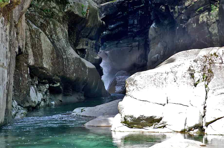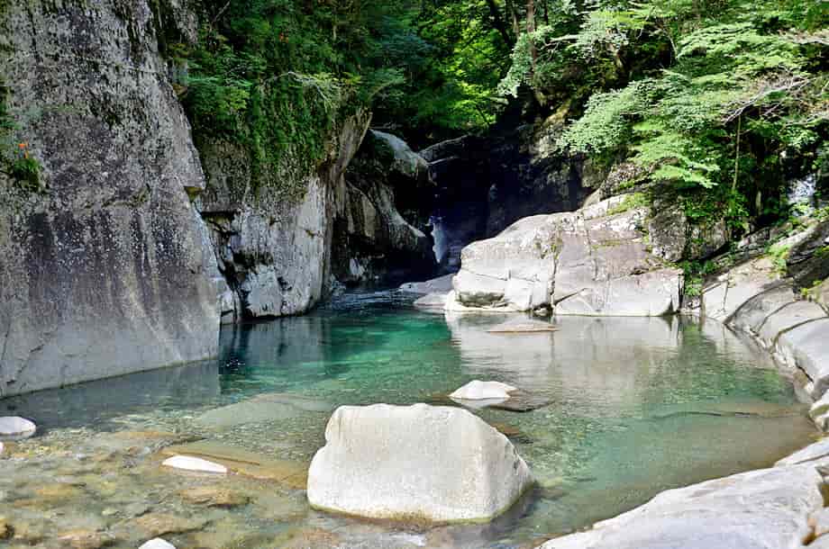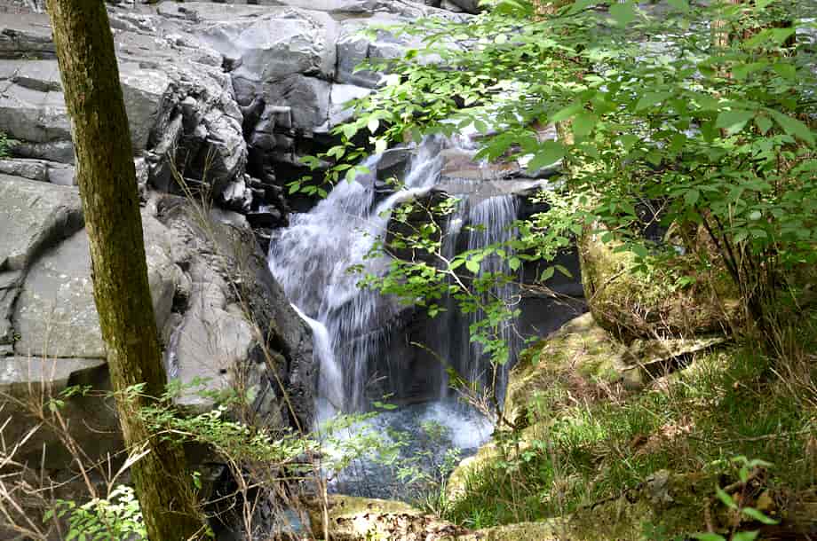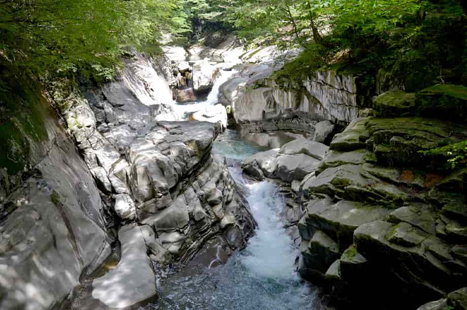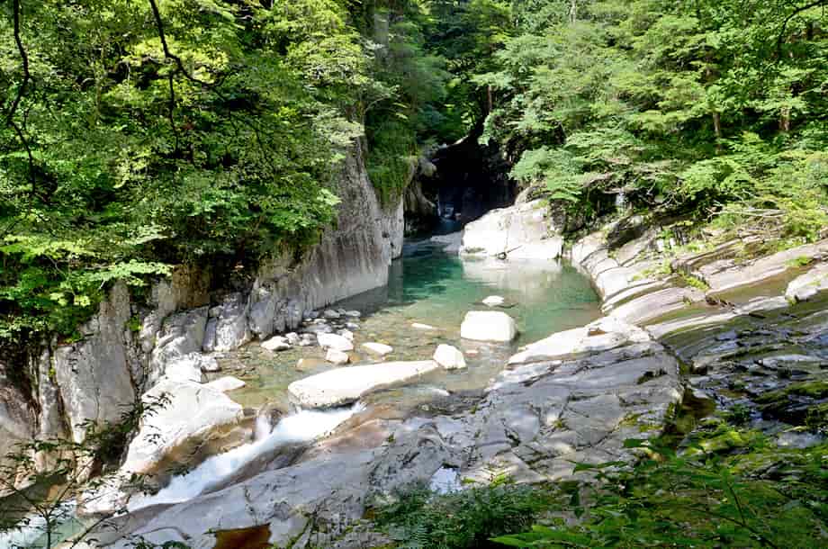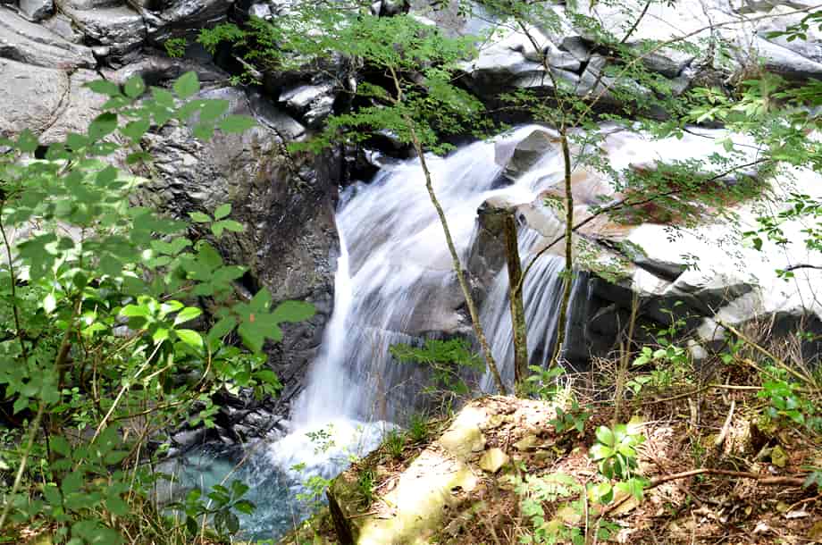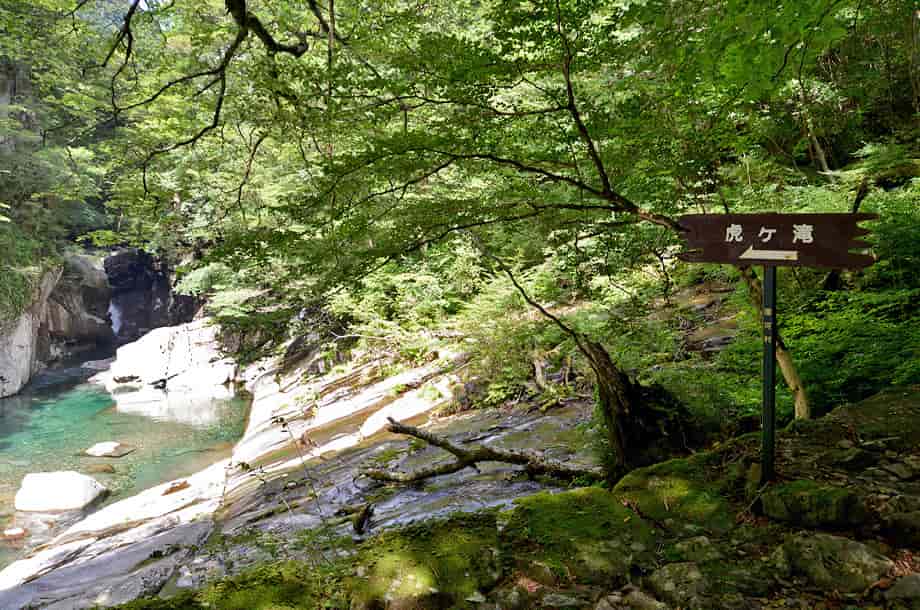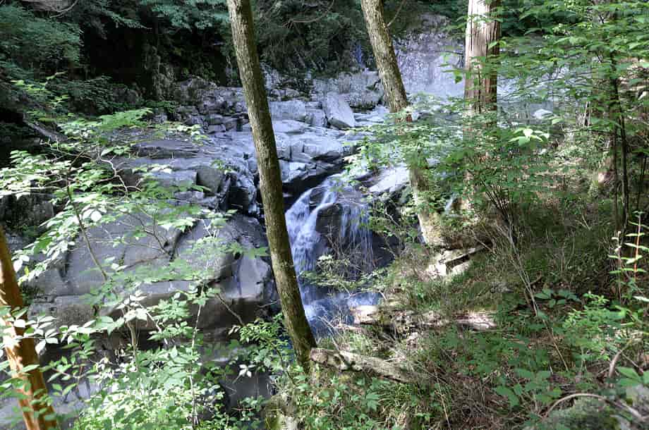 愛媛県久万高原町にある「虎ヶ滝」は、若山地区にある「面河渓」の中に流れ落ちている。 面河渓は本流の面河川と、その支流である鉄砲石川からなる渓谷で、愛媛県の中でも有数の渓谷として知られている。 国の名勝にも指定されているだけあって、渓谷全体に渡って、その景観は素晴らしい。 虎ヶ滝は、本流の面河川コースの遊歩道の終わりに流れ落ちているが、遊歩道最後にある滝として相応しい印象を受ける。 滝は遊歩道辺りから遠望することになるが、その手前に広がる淵と河原の様子は素晴らしく、辺りは美しい景観をつくり出している。 しかし、残念ながら、この時は樹木や岩の陰になってしまい、川にでも入らない限り、虎ヶ滝の全体を見ることはできなかった。 それでも、それも味わいのひとつとして、周辺の様子と共に、全体の景観は楽しむことができた。 遠望しているのでよくは分からないが、虎ヶ滝は10m程の落差はあるのだろうか。 ただ、遊歩道の終わりまで行くと上段部の様子が見えるので、虎ヶ滝は段瀑になっていることはよく分かった。 それにしても、この滝の手前になる河原の様子は素晴らしい。 下流側にある「唐獅子橋(熊淵橋)」から先は「水吞の獅子」と呼ばれる渓谷美を楽しむことができるが、ここを過ぎると視界が開け、大きな河原が目に飛び込んでくる。 その景観には思わず感嘆するが、よく見ると、もっとも奥に虎ヶ滝が流れ落ちているのが分かる。 滝自体は更に歩いて行かないと見ることができないが、この辺りの景観は実に印象に残る。 虎ヶ滝への交通・アクセス さて、面河渓までの交通はそのページで紹介しているので、虎ヶ滝へは、「亀腹」の先にある「鶴ヶ背橋」を渡って本流の面河川コースを進んで行く。 橋を渡ると、すぐに「面河四国カルスト自然休養林案内図」が立てられているので、この案内図に目を通しておくとよい。 ここから「紅葉河原」や「下熊淵」などの景観を楽しみながら歩いて行くと、やがて「唐獅子橋(熊淵橋)」を渡って休憩所に着く。 この橋の上流側は「水吞の獅子」と呼ばれる峡谷のような景観で、その眺めも素晴らしい。 虎ヶ滝へは、ここから更に遊歩道を歩いて行くが、橋を過ぎてからは面河川を左に見るようになる。 橋を渡って少しばかりで、「水吞の獅子」の名板が遊歩道の両側に立てられているが、ここを過ぎて更に歩いて行くと、視界が開け、広い淵が広がっているような光景が目に入る。 虎ヶ滝は、この淵の奥に流れ落ちていて、遊歩道からでも遠望することができる。 そのまま少し先に進んだ遊歩道右には「← 虎ヶ滝」の案内標識も立てられているので、その辺りから眺めるのがよいかもしれない。 ここまで、鶴ヶ背橋から20~25分程度で、手前の休憩所からだと5分程で遠望できる。 河原に降りて眺めることもできるが、河原と言っても大きな岩が斜面のようになっている。 この岩は見た目よりも傾斜が強いので、川に降りる時には注意した方がよく、遠望するに留めておいた方がよいようにも思う。 また、名板の先へも遊歩道が延びていて、先へ進むと、虎ヶ滝の上段部分を見ることができる。 残念ながら全体の様子は見ることができないが、遠望では分からない上流側の様子などを見て取れる。 尚、面河渓の遊歩道はここで終わりになる。 右の斜面には木組みの階段が延びているが、この先は石鎚山へと向かうのだと思うが、先の様子などは確認していない。 |