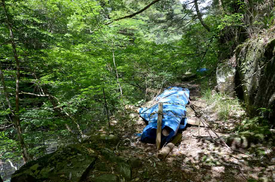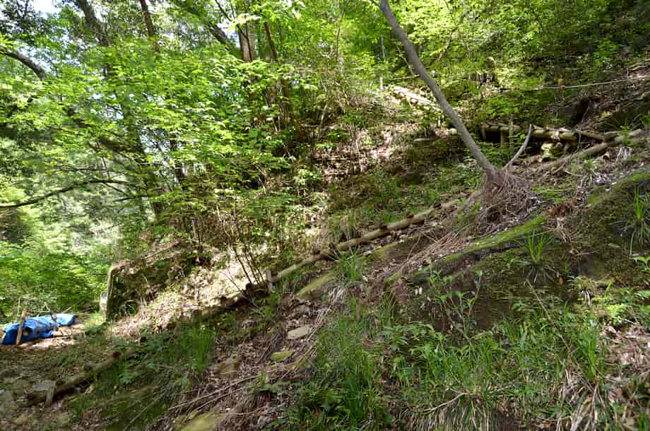 | ▲右へと続く山道 | ▲遊歩道終わり辺りから見る虎ヶ滝・部分 |