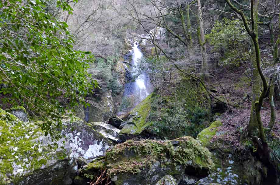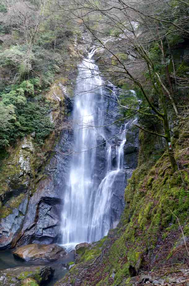 愛媛県新居浜市にある「魔戸の滝」は、種子川山地区を流れる西谷川の上流部に流れ落ちている。 落差40mと言われている大きな滝で、山道を歩いて来てこの滝を見た時には、少なからず驚きがある。 但し、滝見台辺りから見ることのできるものは、この滝の下段部分で、中・上段部分の滝は、更に山道を登って行かなければならい。 残念ながら、この時は時間の都合もあって、上・中段の滝へは向かっていないが、ここからの山道は険しくなるようではある。 しかし、この下段部分だけでもかなりの落差があり、大きな黒っぽい岩肌を水が流れ落ちる様子は素晴らしい。 広くはないが、はっきりとした滝壺も見られ、水の流れにも変化があって味わいがある。 よく見ると、下段の滝の上方部分にも流れがあり、この部分を入れると、下段の滝の落差は40mを超しているようにも見える。 ところで、「魔戸の滝」とは珍しい名前だが、この滝は、元々は「樽滝」と呼ばれていたようで、後になっては「窓の滝」と呼ばれている。 それが、どうしたものか「魔戸」と表記されるようになって、入り口にある説明板にも「魔戸の滝」と表記されている。 名前が変遷したことの理由などは分からないが、「樽」は「淵」のことで、この滝の樽は三つあるので、滝見台から見えるものが下の樽(下段の滝)と呼ばれるものになる。 また、説明板には「どのような日照りでも水が枯れることがない」と記されているが、この滝には雨乞伝説も残されている。 「昔、幾につも日照りが続き、遂には田畑もすっかり枯れてしまった。困った村人たちは、この樽淵に棲む竜王に若い娘・お百合を差し出すことにした。差し出されたお百合は、竜王と共に中の樽に姿を消すが、まもなく大雨が降り、田畑も潤った。」と、説明板には概ねそのように記されている。 中の樽(中段の滝)には龍王を祀り、その脇には「百合姫大明神」という祠も建てられているということだが、これについては、中段の滝へ向かっていないので確認していない。 いずれにしても、下段の滝だけしか見ていないが、魔戸の滝は素晴らしい滝で、周辺も自然の様子をよく残している。 上の滝、中の滝もさぞかし見事な景観をつくり出しているのだろうから、いつか機会をつくって眺めてみたいと思っている。 魔戸の滝への交通・アクセス さて、魔戸の滝へは、自動車の場合、松山自動車道・新居浜インターからだと、インターを降りて左折し、「別子山」方面へ向かう県道47号線へ進む。 しばらく道なりに走って行くと種子川を越えるが、更に走って行くと、道路左に「水利記念碑の履歴」と刻まれた石柱のほか、「植木組合記録」などの石碑が三基建てられている。 このところに左への分岐があり、逆戻りするように左の脇道に入って行くが、この分岐は反対方向からだとよく見えるが、進行方向からだと分かりづらい。 ここを過ぎて少し行くと、左に広い山根公園があるので、そこまで行けば行き過ぎている。 ただ、分岐の手前には「+形道路・交差点あり(+)」の道路標識と、分岐のところには横断歩道があるので、それにも注意しておくとよい。 分岐を左へ入ると、道が狭くなって住宅地の中を通るが、程なく一旦停止の標識と、その先の右角にはカーブミラーが設置されている十字路がある。 ここはそのまま直進するが、よく見ると、カーブミラーの横に「← 魔戸の滝」と書かれた案内標識が立てられている。 十字路を直進すると「新高神社・中野神社」と彫られた石柱のところで道はふたつに別れるが、ここは左の道へ進む。 左へ進むとすぐに松山自動車道の高架下になり、ここに「← 7km 名勝・魔戸の滝」と書かれた案内標識があるので、案内に従って、直進するように林道へ入って行く。 あとは道なりに進んで行くが、舗装されているので特に問題はない。 林道は近年の災害で通行止めになっていたので、一部は荒れたところもあるが、魔戸の滝までの道は修復されている。 ただ、7kmの道のりは思った以上に長く感じられ、ずっと登り坂で、一気に標高を上げていく。 林道を進んで行くと、大きな鉄塔の横を抜けて行き、途中に分岐もあるが、道なりに走って行けば、道路左側に「臨時駐車場」と書かれた案内板が立てられている広場があるので、自動車はそこに止めることができる。 この駐車場は二台ほどの狭いものだが、少し先にも一台分ほどの駐車場がある。 どちらに止めてもよいが、転回場所にもなっているようなので、駐車位置には注意する。 ここまで、新居浜インターから25~30分程だが、林道の状況によっては、もう少し時間がかかるかもしれない。 魔戸の滝へは、駐車場の先から山道が延びていて、ここには説明板も設置されているのですぐに分かる。 入り口付近は階段状になっているが、すぐに山道になる。 しかし、道ははっきりとしていて、所々の樹木には目印のテープも巻かれているので、路に迷うようなことはない。 途中、大きな岩を越