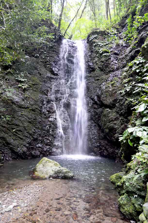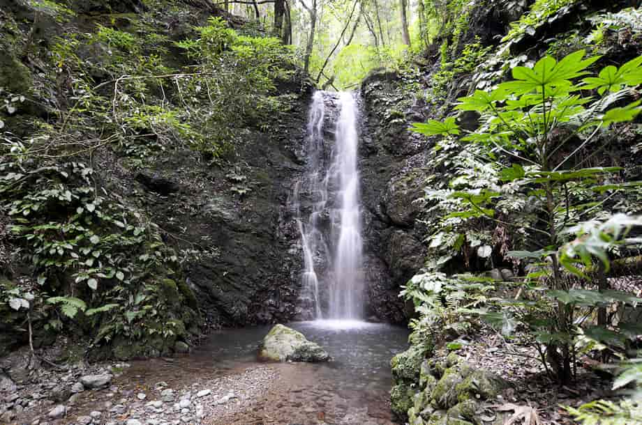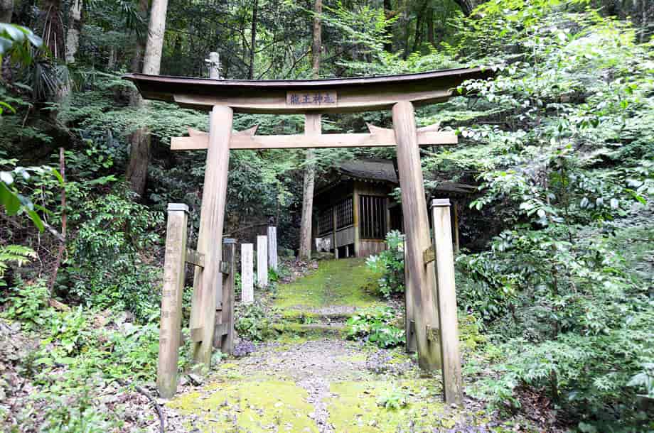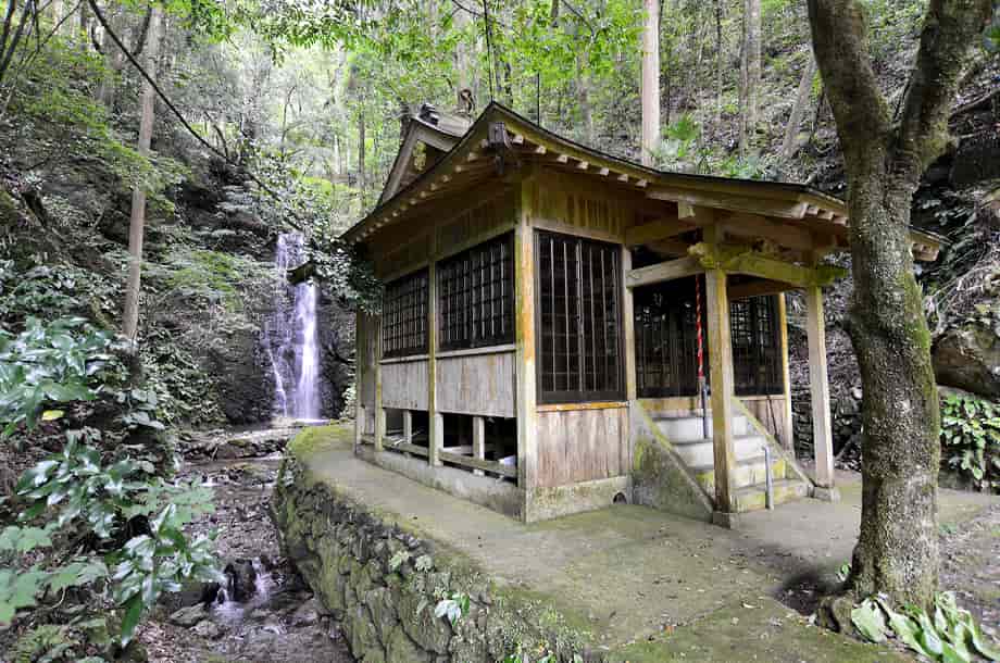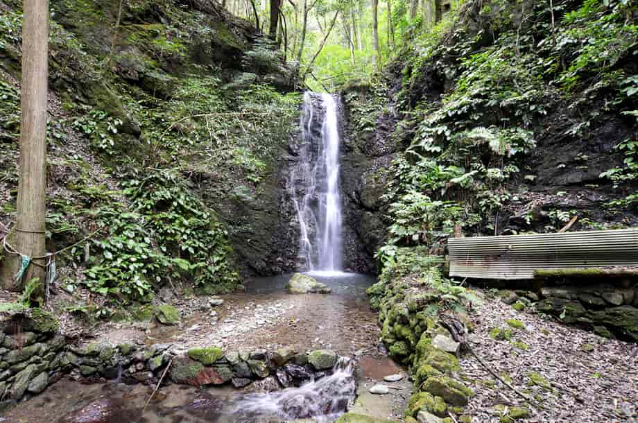 大洲市河辺町三嶋にある「龍王の滝(秋滝)」は、同地区にある秋滝龍王神社の境内にある。 河辺川の枝沢に流れ落ちている落差6~7mの小さな程で、信仰の対象にもなっている。 大きい滝ではないが、神社の中にある滝だけに、落ち着いた感じを受ける。 また、滝前は広くはないが開けていて、周辺はよく整備されている。 滝はやや奥まったところに流れ落ちていて、滝壺の様子などを見ると、かつては修行用の滝になっていたのかもしれない。 この龍王神社の社は近年に建て替えられたようで、社はしっかりと組まれた石垣の上に建てられている。 辺りもよく管理・整備されているので、ここが地域からずっと大切にされてきたことがよく窺える。 駐車場になる広場のところには、秋滝龍王神社への奉納を記念した石碑などが見られるので、かつてはこの辺りに大きな鳥居や灯篭などもあったのかもしれない。 また、この龍王の滝は水が枯れることなく、かつては龍が棲んでいたという伝説が伝えられている。 滝では龍の化身ともいえる二匹の大ウナギが見つかっていて、現在も棲息しているとも言われていて興味深い。 ところで、この滝はふつう「龍王の滝」と呼ばれているが、ここの神社は「秋滝龍王神社」と呼ばれているので、この滝は元来「秋滝」というのかもしれない。 付近には「龍王橋」という、独特の屋根付き橋があるが、この橋を渡ったところに「秋滝橋」という小さな屋根付き橋も見られる。 また、鳥居には「龍王神社」と書かれてもいるので、「秋滝」は他の龍王神社との混同を避けるための呼称のようにも思われる。 地域の方などに尋ねてみればよかったのだが、詳しいことは分からない。 ただ、「秋滝」は、この辺りの古い地名なのかもしれないが、このページの表記は、括弧つきで(秋滝)とも表記している。 しかし、「秋滝龍王の滝」と表記するのがよいのかもしれない。 龍王の滝への交通・アクセス さて、龍王の滝へは、付近にある「河辺ふるさと公園」を目指せば分かりやすい。 自動車の場合、松山自動車道・内子五十崎インターからだと、インターを降りて左折し、少し先の松山自動車道を潜るところで、「肱川・五十崎」方面へ向かう左側道へ入る。 左へ進むと、程なく県道56号線と交差するので、この分岐を「← 肱川・五十崎」方面へ左折する。 左折するとすぐに県道229号線を走るようになるが、道なりに走って行くと再び県道56号線と交わるので、この交差点を「野村・肱川」方面へ向かって左折する。 左折するとすぐに小田川を渡るので、橋を渡ったところで右折して、「内子町役場」の方へ進む。 この道は県道56号線なので、あとはしばらく道なりに進んで行くが、橋を渡って右折した先の「内子町役場」の分岐は、左へ曲がる「北表」方面が県道56号線になる。 県道56号線は、時折右へ向かったり、左へ向かったりするが、道路標識に従って、しばらくの間は56号線を進んで行く。 県道56号線を30分ほど走って行くと、道は県道55号線に突き当たるので、この分岐は左折して「小田」方面へ向かう。 道なりに走って行くと、道路右に「大洲警察署・河辺駐在所」があり、その先に「河辺ふるさと公園」がある。 この公園の手前に橋が架かっているので、竜王の滝へは、この橋を渡る。 橋を渡った先の分岐は右へ向かい、少しばかり走ると、道路左に秋滝龍王神社への参道口がある。 参道口は、道路が右へと曲がる左側にあり、建物があるので見落とすことはない。 自動車はこの辺りが広くなっているので駐車することができる。 ここまで、内子五十崎インターから40~50分程で、内子町役場からだと30~35分程度。 竜王の滝へは、建物の脇から参道口が延びているので、赤い鳥居を潜ると、すぐに社に着く。 駐車場となる広場から滝まで1~2分程で、滝は、この社の裏に流れ落ちているのですぐに分かる。 また、県道55号線に突き当たるまでに、内子方面へ向かう県道245号線への分岐があるので、そちらへ10分も進むと「三杯谷の滝」があるので、時間があれば足を延ばしてみるのもよい。 それに、「ふるさと館」から自動車で7~8分程先に進むと、かなり古くから祀られている天神社があるが、その参道を横切る河辺川には「御幸(みゆき)の橋」という屋根付きの橋が架けられている。 御幸の橋だけでなく、龍王の滝付近にも「龍王橋」や「秋滝橋」などの屋根付き橋がいくつか残っていて、風情を醸し出しているので、少し時間をとって散策してみるのもよい。 |