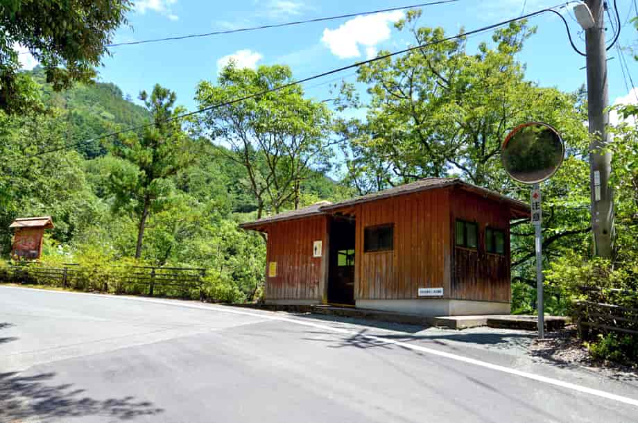 | ▲手前にあるトイレ・案内板(左)の先に入り口がある | ▲遊歩道途中にある休憩所 |