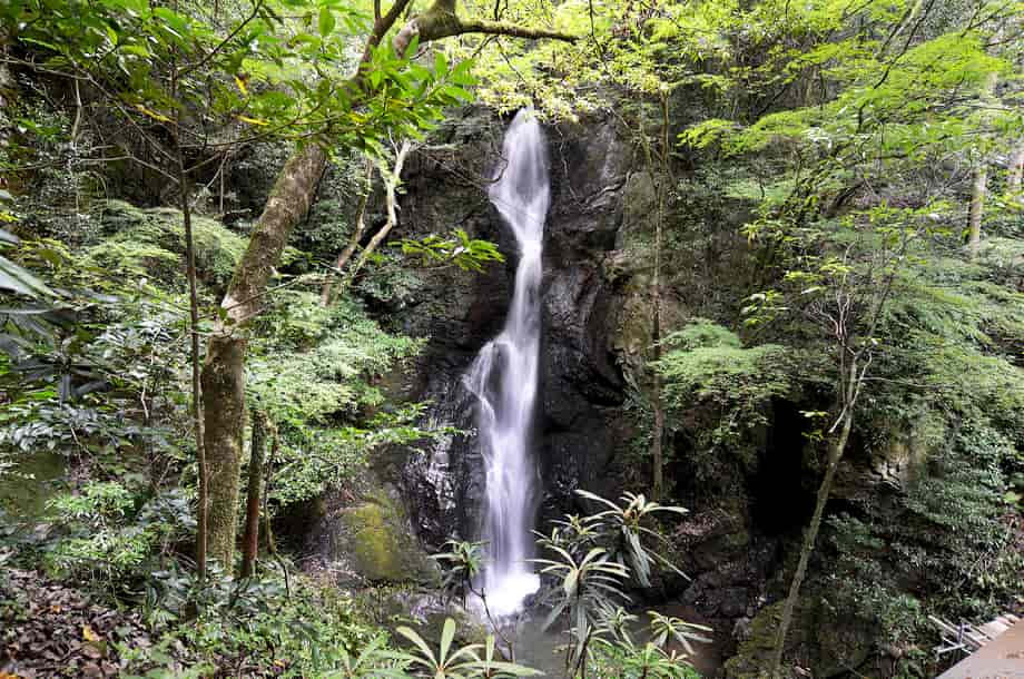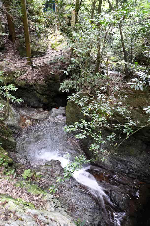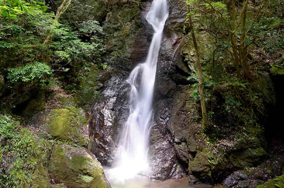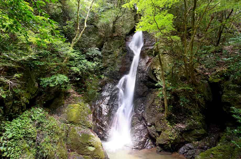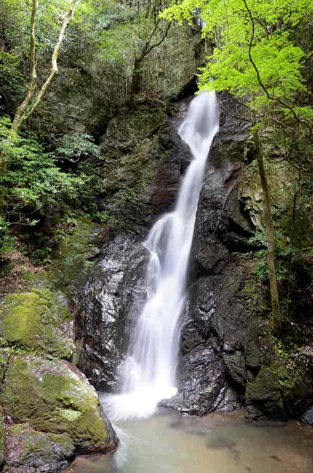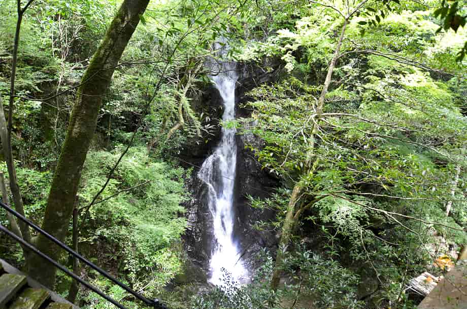 大洲市河辺町にある「三杯谷の滝」は、川上地区を流れる木菱川に流れ落ちている。 やや奥まったように流れ落ちている様子には味わいがあり、辺りの景観と相まって、落ち着きのある風情が感じられる。 また、水は凹凸のある岩肌を半ば段瀑のように落ちていて、水の流れにも変化があって、おもしろくもある。 道路際からよく整備された遊歩道が延びていて、滝は、遊歩道の途中から目に入ってくる。 しかし、三杯谷の滝は道路から随分下にあるので、遊歩道を進むにつれて、滝を上から下へと見ていくようで、この変化の様子もおもしろい。 滝を立体的にとらえながら降りていくと、滝の正面辺りに出るが、滝正面には滝見台ともなる休憩所が設けられているので、ここからだと滝の全体の様子もよく分かる。 落差は15m程と言われているが、それよりも落差があるように感じられ、周辺は自然の様子もよく残している。 この滝見台は休憩所にもなっているので案外広く、ゆっくりと時間を過ごすこともできる。 三杯谷の滝は眺めていても飽きることのない風情があり、辺りも閑静で、散策していると滝音のほか、時折鳥の声が聞こえてくる。 三杯谷の滝への交通・アクセス さて、三杯谷の滝へは、自動車の場合、松山自動車道・内子五十崎インターからだと、インターを降りて右折したあと、少し先にある「内子町内子」の交差点も右折し、「肱川」方面へ向かう県道32号線へ進む。 右折して3~4分程で、県道56号線と交差する交差点があるので、ここを「北表」方面へ左折する。 左折してから30分近く走って行くと、「← 県道245号線 内子(小田)」の道路標識があるので、その先の分岐を左へ進み、県道245号線へ入る。 あとは道なりに走って行くと、道路右側に「龍王神」と彫られた石碑があり、三杯谷の滝へは、ここから入って行く。 石碑の横には「坂本龍馬 脱藩の道」の案内板も立てられていて、やや手前にはトイレも設置されているので、これにも注意しておくとよい。 ここまで、内子五十崎インターから45~50分程度で、県道245号線に入ってからは、所々に案内板も設置されている。 自動車は、石碑から少し先の右側が広くなっているので、その辺りに駐車することができる。 滝へは、石碑の横から遊歩道が延びているので、そのまま歩いて行くと、5分もあれば滝正面の休憩所に着く。 遊歩道はずっと下りになっているが、よく整備されているので歩きやすく、遊歩道に入ってからすぐの所にも休憩所が設けられている。 途中からはやや急な下りになっているが、階段になっていて、手すりも付けられているので、家族連れなどでも気軽に訪れることができる。 滝は途中から遠望することができるが、遊歩道を下って行くにしたがって、滝の様子が上から下へと見えてくるのはおもしろい。 また、滝周辺は公園のようになっていてよく整備されているが、自然の様子もよく残していて、散策していても清々しい。 ただ、帰りは登りが続くので、休みながら登って行くようにすればよい。 |