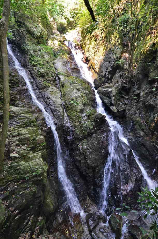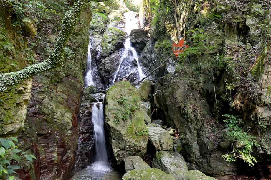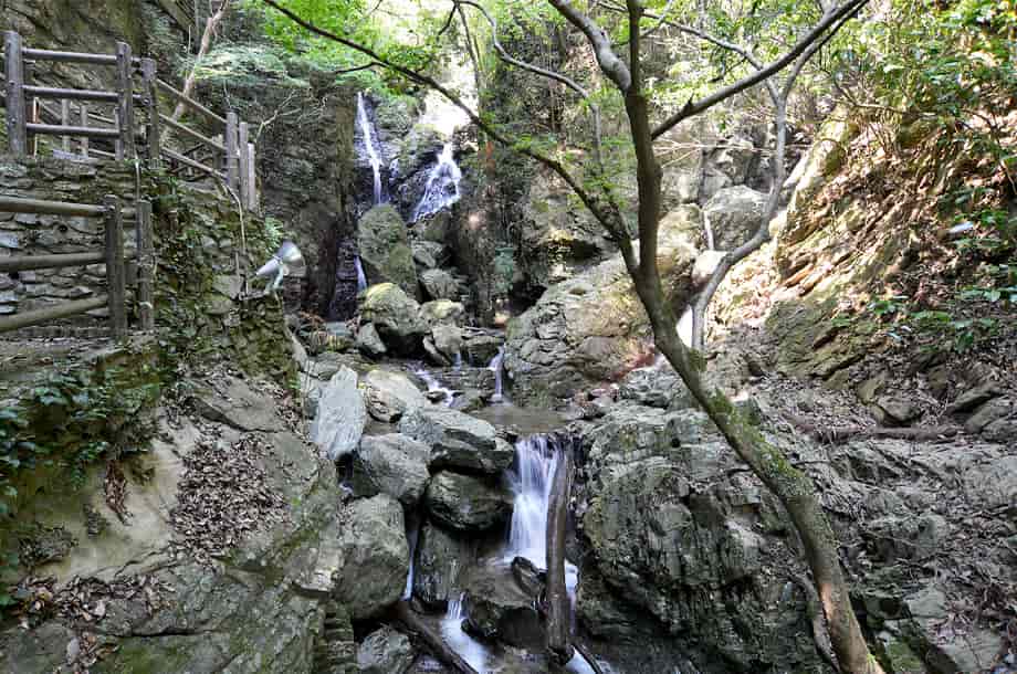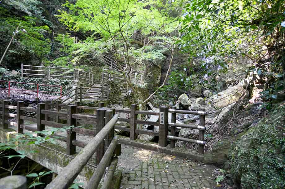 | ▲落合の滝をつくる雌滝の流れ | ▲手前の見返り橋辺りの様子 |