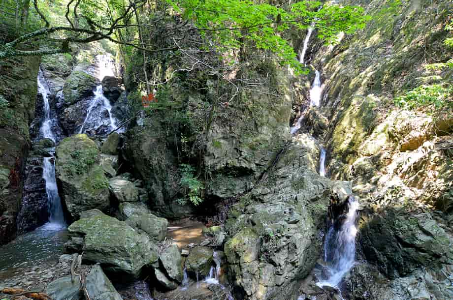 愛媛県大洲市にある「落合の滝」は、白滝地区を流れる滝川に流れ落ちている。 滝川には幾つかの滝が流れ落ちていて、周辺は「白滝公園」としてよく整備されている。 この公園内の滝は、総じて「白滝」と呼ばれていて、落合の滝は、この白滝の内のひとつになっている。 遊歩道を歩いて来ると、「見返り橋」の辺りから正面に見える滝で、落差は5~6m程なのだろうか。 滝前には、流れを隠すように大きな岩があり、滝自体も大きな岩に挟まれて流れ落ちている。 しかし、その様子も景観に立体的な感じを与えていて、味わいが感じられる。 一見すると段漠のように見えるが、この落合の滝は、ふたつの流れがつくり出している。 上方部分ではふた筋になって水が流れ落ちているが、右側のものはすぐに二筋に別れている。 この流れは「雌滝」の最下段部で、上方にその流れが見える。 左側のひと筋に流れ落ちているものは、上流側に「合歓の滝」や「来光の滝」がある流れで、それぞれが違う谷からの流れになっていて、それが、名前のように落ち合ってひとつになっている。 その様子は、遊歩道を少しばかり進んで行き、やや上方辺りから眺めるとよく分かる。 また、上方から見ると、より落差も感じられるので、落合の滝の実際の落差はかなりあるのかもしれない。 また、ふたつの流れがここでひとつになっているが、落合の滝の右には「雄滝」も流れ落ちていて、この辺りの景観は素晴らしく、印象に残る。 この景観も見返り橋の辺りから眺めることができるが、成程、帰りにはこの橋の辺りで、つい振り返ってしまう。 落合の滝への交通・アクセス さて、落合の滝は白滝公園の中にあるが、白滝公園までの交通はそのページで紹介しているので、落合の滝へは、駐車場の奥から延びる遊歩道を歩いて行くと、ほどなく「見返り橋」がある。 この辺りから落合の滝を正面に見ることができるが、滝付近には名板も立てられているので見落とすことはない。 遊歩道の入り口からだと2~3分程度で、右斜面には、落差のある雄滝も流れ落ちていて、この辺りからの眺めは素晴らしい。 更に、落合の滝と雄滝がひとつになって、すぐ先の小滝をつくり出す奥行きのある景観は、強く印象に残る。 |
