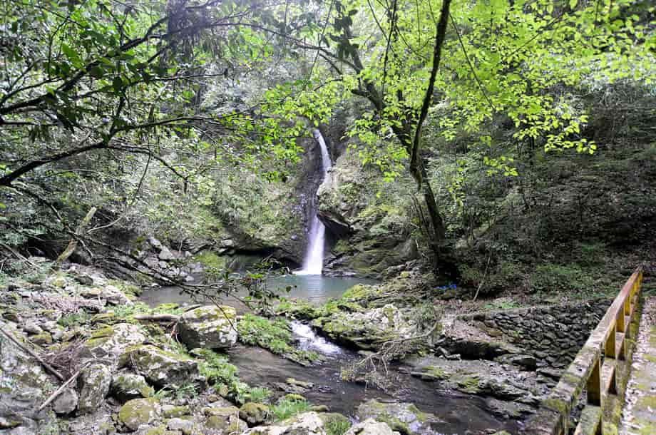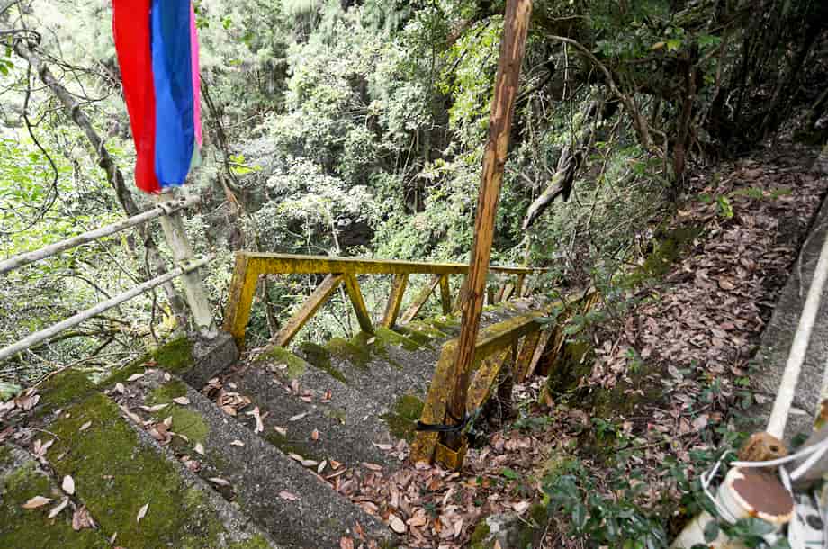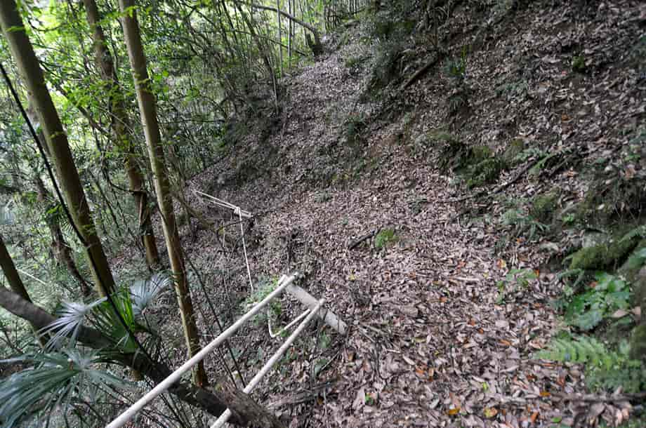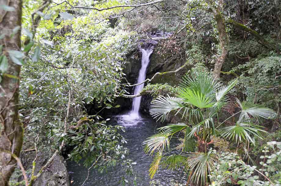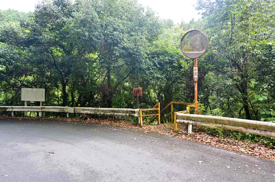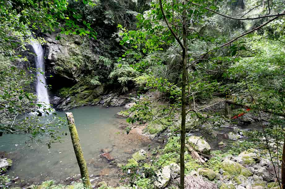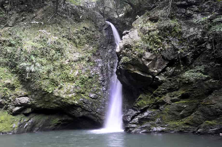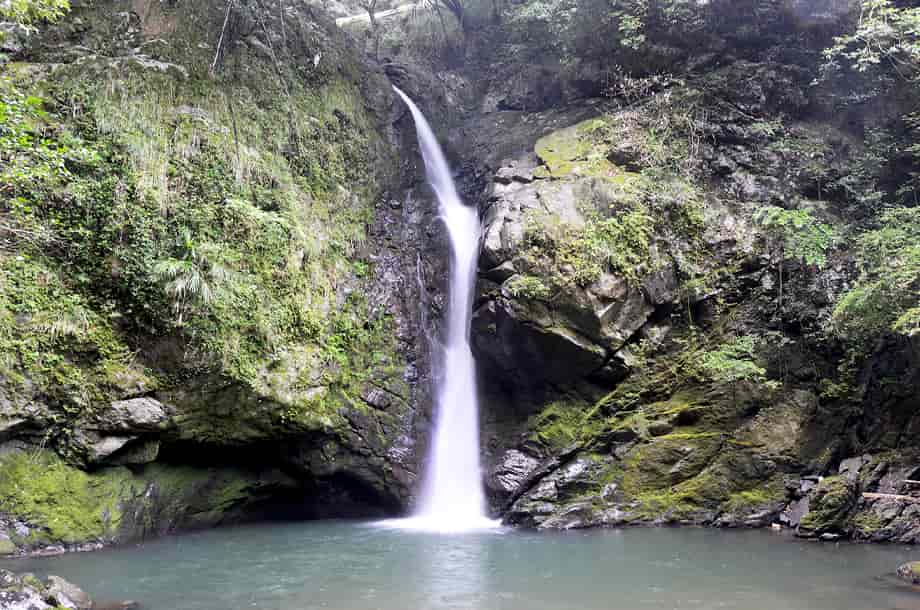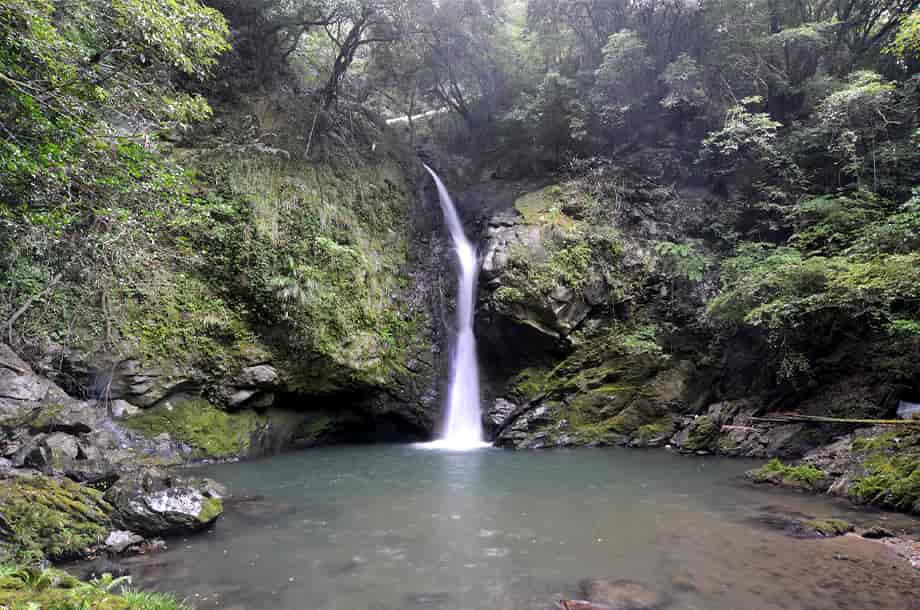 大洲市肱川町大谷にある「轟滝」は、鹿野川湖に流れ込む大谷川に流れ落ちている。 轟竜王神社の中にあるが、遊歩道を歩いて来て滝前に立つと、少しばかりの驚きがある。 落差は15m程はあると思うが、滝壺は淵のように広く、滝前もよく開けていて清々しい。 この時は生憎の小雨模様だったが、それも辺りの景観に相応しくも思われ、山中に隠れるように流れ落ちる様子には深い味わいがある。 滝横の岩が突出しているので、見る位置によっては滝の一部が隠れてしまうが、それも変化があっておもしろい。 また、滝前からだと見ることができないが、轟滝には上段部分があり、全体は二段の段瀑になっている。 この上段の滝は県道から見ることになるが、鳥居から少し先にある「轟竜王に伝わる伝説」と書かれた説明版の辺りから見下ろすことができる。 上段の滝は斜瀑のようになっていて、6~7m程の落差はあるだろうか。 道路から見ているのではっきりとした落差は分からないが、こちらも広い滝壺をもっている。 下段の滝ほどではないが、やはり淵をつくっていて、大きさの割にはかなり広いように感じられる。 どちらの滝も味わいがあり、轟滝は思っていた以上に素晴らしい。 落差も大きく、上・下段を合わせると20~25m、或いはそれ以上になるのだろう。 ところで、道路際にある説明版によると、この滝壺の奥の岩屋には竜が棲んでいて、雨乞いの竜王としても大切にされてきたようである。 また、「轟」は響く滝音から付けられているとも思うが、雨乞いの折、「雷鳴轟かせ大雨が降った」とも書かれているので、それもこの滝名の由来になっているのだろう。 詳細は長くなるので割愛するが、説明版には、その様子が詳しく記されている。 尚、この説明版の横からも遊歩道が延びていて、階段状の道を下って行っても滝前に着く。 轟滝への交通・アクセス さて、轟滝へは、自動車の場合、大洲富士インターからだと、インターを降りてすぐの国道197号線を「須崎・鬼北」方面へ向かう。 しばらく道なりに走って行くと、20分程で「硯・久下 →」の道路標識が左側に立てられているので、ここを右折する。 この標識は小さいので分かりづらいが、その先には「久下トンネル」があるので、その手前を右折する。 また、この分岐には、右後ろに逆戻りするような道もあるが、轟滝へは、右斜め前に下るような道へ進む。 あとは道なりに走って行くと、左の方に県道308号線が見えるようになるので、その先の合流点で左折して県道308号線に入る。 合流するところは道が大きく左に曲がっていて、左角にはトイレが設置されいるので、それにも注意するとよい。 左折してから200m程行くと、右に「轟竜王大神」と書かれた赤い鳥居があるので、轟滝へはここから入って行く。 付近の道路は道幅が狭いので、駐車できるようなところはないが、手前の分岐にあるトイレの辺りがやや広くなっているので、駐車することができる。 但し、分岐の所になるので、駐車位置などにはよく注意する。 ここまで、大洲富士インターから25~30分程度。 また、「久下トンネル」を越えるとその先に「大地トンネル」があるのが見えるが、大地トンネルまでの途中に右に向かう橋が架かっている。 ここを右折して橋を渡り、渡った先を左折すると県道308号線になるので、あとは道なりに走って行ってもよい。 この場合、神社の鳥居は道路左側に見え、駐車位置になるトイレの所の分岐は、鳥居を越えてからになる。 この道からでも大洲富士インターから25~30分程度だが、県道308号線は道幅が狭いので、先述の経路の方がよいかもしれない。 ところで、轟滝へは、鳥居を潜って歩いて行くと程なく社がある。 この時は台風などの被害を受けたのか、修復工事などをしているようだったが、ここから下るようになった階段の遊歩道が延びている。 遊歩道を下っていくと山道が続いているので、そのまま道なりに進んで行く。 途中、ガードレールが曲がったりしているところもあるが、道ははっきりとしていて迷うようなことはない。 この時はしばらく整備されていないようだったが、よく見ると石段が組まれたりしているので、遊歩道として整備されているのが分かる。 遊歩道を少しばかり歩いて行くと轟滝を遠望できるようになるが、滝壺は広く、その前も開けているのが目に入る。 滝付近の遊歩道には鉄製の橋も架けられているので、橋を渡ると滝前に近づくことができる。 鳥居のある入り口から滝前まで5分程で、鳥居から少し先にある説明版のところからも遊歩道が延びているので、どちらからでも滝前に行くことができる。 ただ、遊歩道は整備されているのだが、訪れる人が少ないのか、あまり管理されていないようで、やや荒れた感じを受けるのは残念ではある。 |