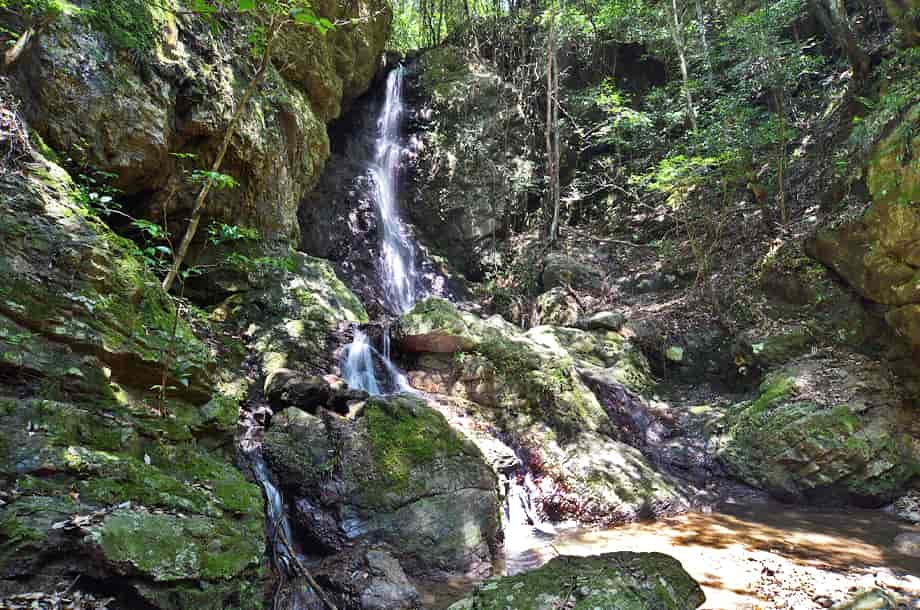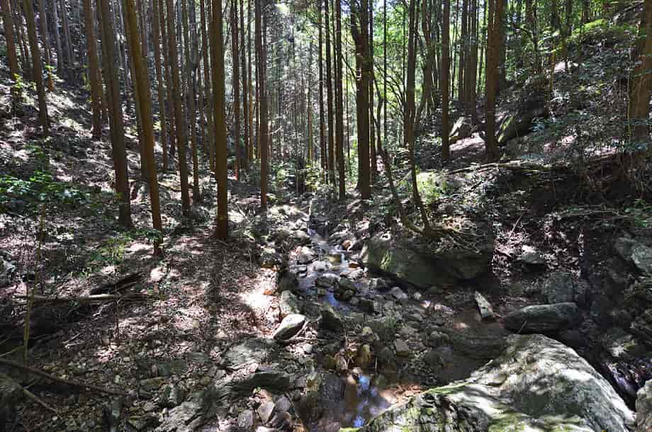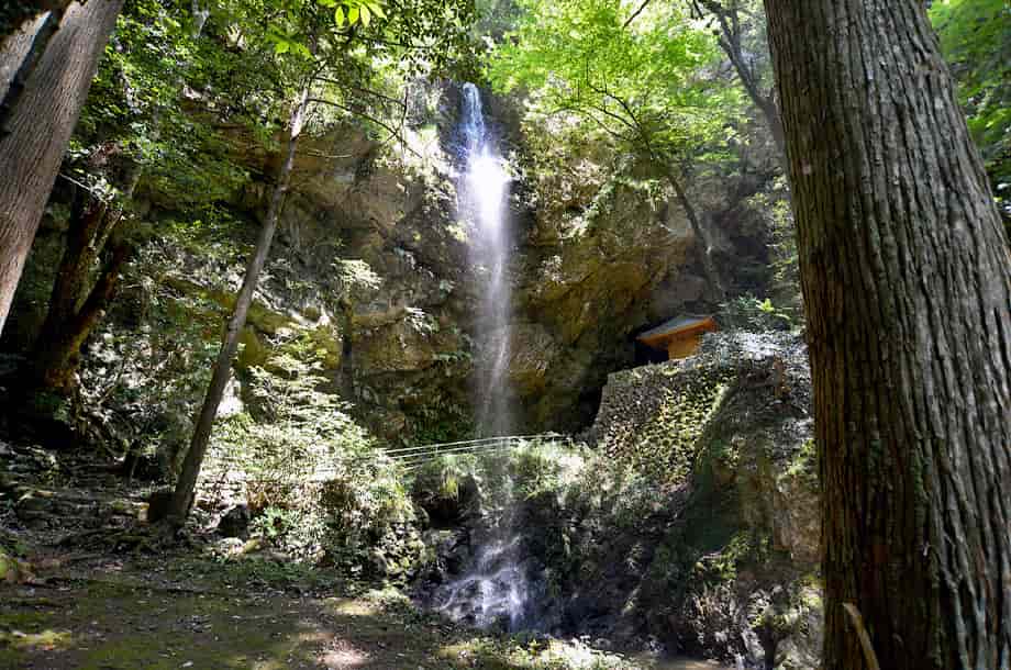 愛媛県西予市野村町にある「小樽滝」は、旭地区を流れる稲生川の枝沢に流れ落ちている。 大きな「樽滝」の下流側にある滝で、両方の滝を合わせて「樽滝」と呼ばれることもある。 この小樽滝は、落差12~13m程はあるだろうか。 全体は三段の段瀑のようで、岩の様子や水の流れに変化があり、それほど大きくはないが、樽滝とは違った味わいがある。 この時は木漏れ日が強く、落ち着きのある滝の様子を見ることができなかったが、小樽滝は奥行きのある滝でもある。 また、小樽滝は、見る位置によって違った印象を受ける。 これは段瀑になっているので、水の流れに変化があるためだろうか。 正面からのほか、右側と左側からでは、違った滝のように見えなくもない。 ただ、上流側にある樽滝と同様、この小樽滝も水量が少なかったようで、滝から続く沢の流れも少ないようであった。 しかし、小樽滝は奥行きのある滝で、やや離れて見ると、その景観にも味わいがある。 水量が多いと、さぞ見応えのする様子を現わすのだろう。 ところで、上流側にある樽滝には「樽滝観音」が祀られているが、小樽滝も、滝近くにある右手の大きな岩の下には石仏が祀られているので、ここも信仰の場になっていることが窺える。 石仏は簡素な石造りの祠の中に安置されているが、この土台部分もしっかりとした石組みがなされているので、樽滝観音と同様、地域から大切にされてきたのだろう。 小樽滝への交通・アクセス さて、小樽滝は樽滝の下流側にあるが、樽滝までの交通はそのページで紹介しているので、小樽滝へは、林道終点からの山道を進んで行くと樽滝との分岐がある。 一方は登りになっていて、一方は平坦になっているのですぐに分かる。 この分岐には「たる滝 ↑・こたる滝・すぐそこです →」の案内板も立てられているので、この分岐を平坦な右へと進む。 あとはそのまま歩いて行くと、ほどなく滝前に着く。 林道終点の入り口からだと6~7分程で、途中の分岐からだと2~3分もあれば滝前に着く。 滝までの山道も整備されているので、歩きやすい。 |