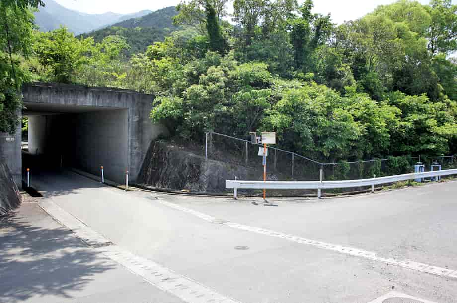 | ▲高速道を潜るトンネル | ▲トンネルの先の分岐・石碑の右の林道へ進む |