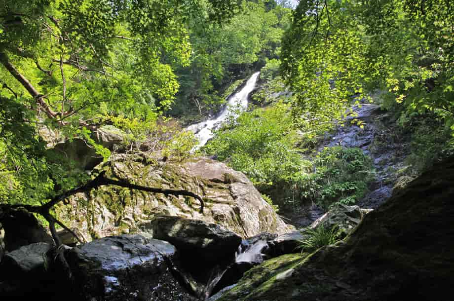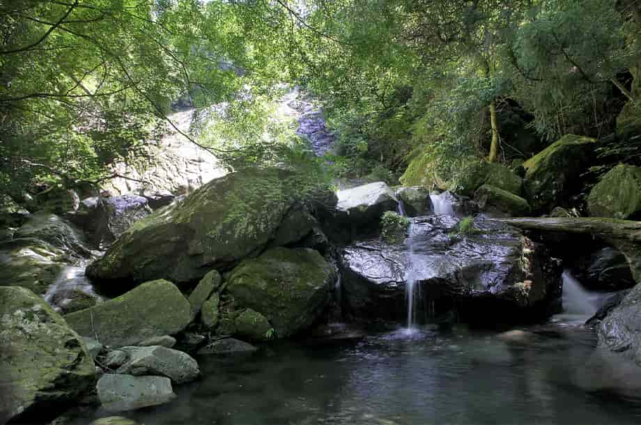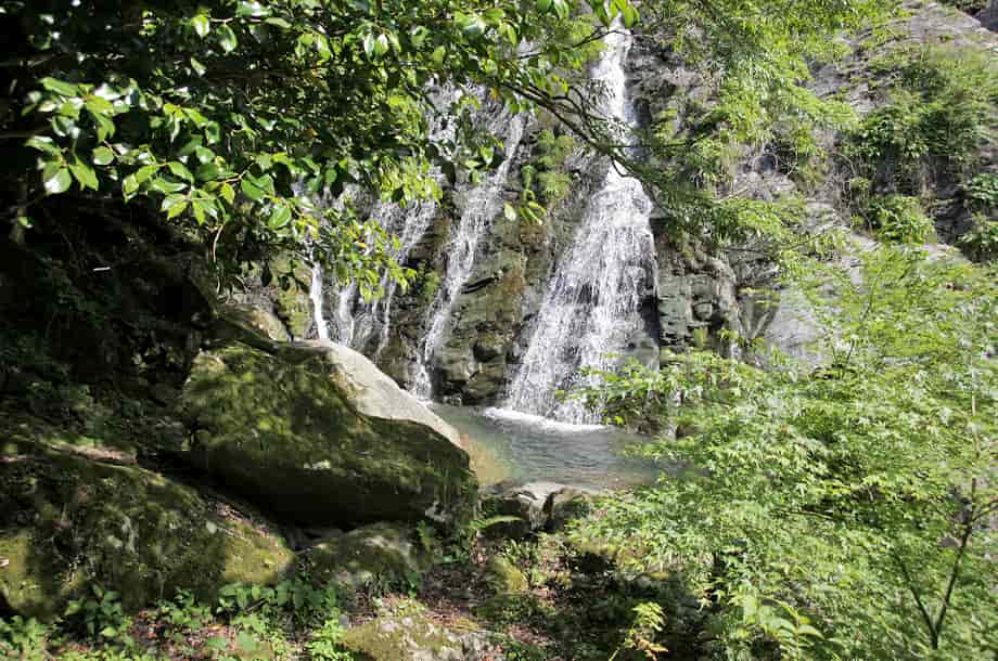 愛媛県四国中央市にある「面白の滝」は、富郷町津根山地区を流れる面白川の上流部に流れ落ちている。 林道に架かる橋の下が落ち口になっているが、水は大きな岩肌を末広がりになって流れ落ちていて、その光景は素晴らしい。 斜瀑でもあるので、水が多いと、幅広い布滝のように見えるのかもしれない。 落差は25m程だが、滝前から見ると奥行きも感じられ、落差も更に大きいように感じられる。 大きな岩には、小さな段が途中にあり、そこから下で水は幾筋にもなって別れ、鮮やかなコントラストを現わしている。 はっきりとした滝壺も見られ、水は実に澄んでいる。 滝壺からの流れは右へ向かい、小さな滝をつくっているが、小滝は更に続いていて、やや下流側では、淵のような広い滝壺をもつ小滝をつくっている。 この淵の辺りからだと、本滝の様子は半ば樹木に隠れてしまうので見えづらいが、この辺りまでを面白の滝として捉えると、落差も40mは超えている。 いずれにしても、面白の滝は堂々とした印象を受ける滝で、周辺には楓も多いので、秋には見事な紅葉を見せてくれそうな滝でもある。 ところで、「面白」は「おもしろ」ではなく「つらじろ」と読まれるが、名前の由来がやや気にかかる。 滝が流れ落ちるこの川の名前は「面白川」だが、どちらが先に名付けられたのかも分からない。 滝だけを見ると、大きな岩を顔に見立て、その面に白い水が流れ落ちている様子から名付けられたように思われるが、それならば、うまい名前を付けたものだとも思う。 また、滝への山道は林道から延びているが、この入り口のところには石仏が安置されていて、山道の所々にも石仏が安置されている。 この石仏群は、四国八十八か所の札場になっている寺院の本尊で、それぞれに寺名と仏名が彫られているので、周辺は、四国ではよく見られる地域的な巡礼場になっているのだろう。 面白の滝への交通・アクセス さて、面白の滝へは、自動車の場合、松山自動車道・土居インターからだと、インターを降りた先の交差点を左折して、国道11号線を「松山・新居浜」方面へ向かう。 左折すると、すぐに左への脇道があるので、この分岐を左へ入る。 この分岐は分かりづらいが、インターから降りて左折すると、先に信号機のある交差点が見えるので、その交差点との間にある。 よく見ると、この分岐の向い、国道の右側には「せとうちバス」の「野田(土居)」バス停がある。 国道から左折して脇道に入ると、松山自動車道に沿うように道が延びているので、そのまま道なりに進んで行く。 しばらく行くと面白川を越える小さな橋を渡るが、その先の左側に高速道を潜るトンネルがあるので、これを潜る。 また、インターを降りて左折して、少し行くと面白川を越え、そこから200mほど進むと横断歩道がある。 ここには信号機や目印などもないが、この横断歩道のところを左折してしても、高速道を潜るトンネルに着く。 この脇道からだと、トンネルまではほぼまっすぐで、トンネルの正面に着くが、左折する分岐は分かりづらいかもしれない。 トンネルを潜り抜けると、左側に「水は宝」と彫られた大きな石碑があるので、面白の滝へは、この石碑の右側の林道へ進む。 林道はS字のように曲がって製材所のような前を通るが、あとは道なりに進んで行く。 途中、左に堰堤があり、その先に分岐があるが、この分岐は、道なりに右へと進んで行く。 林道に入ってからは、途中まで舗装されているが、道が大きく曲がるところ以外は地道になっている。 しかし、特に問題はないので、小さな落石などに注意しながら、ゆっくりと進んで行くとよい。 林道はずっと上りが続き、一気に標高を上げていくが、やがて下りになって行く。 道が下りはじめてしばらく行くと、両脇にガードレールが付いている小さな橋があるので、この橋の先が滝への入り口になる。 ここまで、高速道を潜った先の林道入り口から15~20分程で、自動車は、この橋の手前の両側が広くなっているので、駐車することができる。 橋の上から、滝の落ち口の様子を見ることができるが、橋を渡ると、すぐ左手に石仏が安置されていて、その横に「面白の滝」と書かれた案内板が立てられている。 案内板の脇から山道が延びているので、この山道を下って行くが、道ははっきりとしているので、そのまま山道を進んで行く。 山道の途中から、面白の滝を横から眺めることができるが、樹木が茂っていると見えづらいかもしれない。 山道入り口から、確か石仏を二つほど過ぎた先に、大きな岩の上に安置された「八十一番 白峯寺・千手観音」の石仏があるので、滝へは、ここから沢へ降りていく。 山道の入り口からこの石仏まで5分程で、左脇の樹木には、赤い目印もあるので、その辺りから沢へ向かう。 また、山道は更に下るように続いているので、左側にあるこの石仏は見落とさないように注意する。 沢へははっきりとした道はないので、適当に見当を