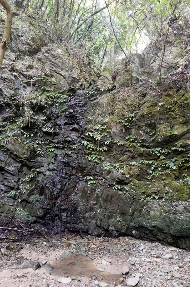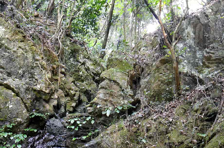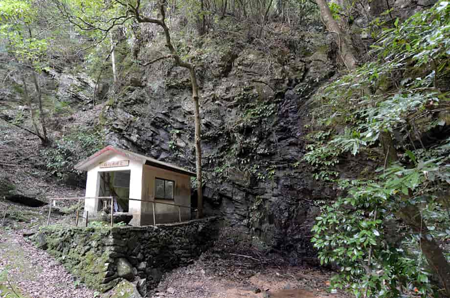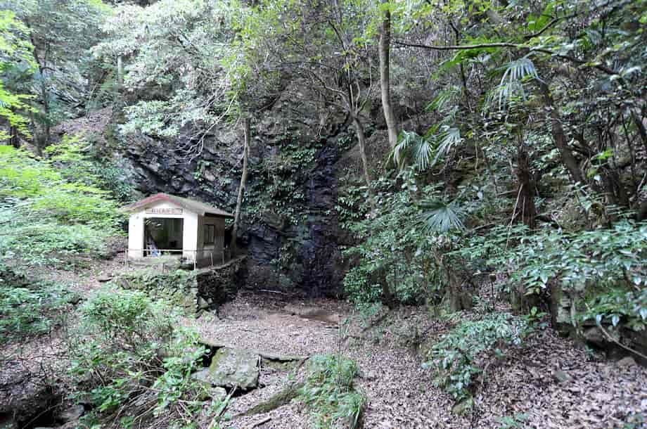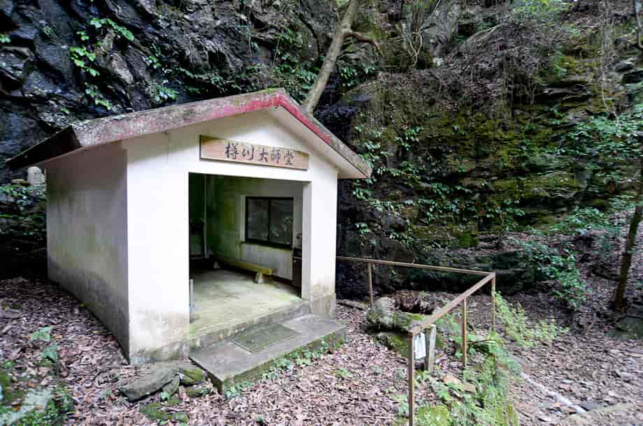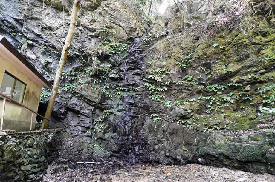 愛媛県砥部町にある「五光の滝」は、川登地区を流れる砥部川の枝沢にある。 落差は8m程はあると思うが、上方部分が奥まっていてよく見えないので、落差はもう少しあるのかもしれない。 五光の滝は、「砥部四国88カ所 第23番・薬王寺」の脇に流れ落ちているので、信仰の滝であることがひと目でわかる。 普段から水量は少ないようで、この時も水が滴り落ちている程度だったが、辺りの様子を窺うと、信仰の滝に相応しいように思える。 滝壺といった程のものもないが、近くには薬師如来の石仏が安置されている。 滝横には「樽川太子堂」も建てられていることからも、ここが地域の人たちから大切にされてきたことが窺える。 周辺は実に閑静で、かつてはここで日々の平安を願い、往来するときの喉の渇きも潤したのかもしれない。 五光の滝への交通・アクセス さて、五光の滝は砥部町の川登地区にあるが、松山方面からだと手前に「かがす淵」のある衝上断層公園がある。 そこまでの交通はそのページで紹介しているので、五光の滝へは、更に国道379号線を走って行く。 断層公園から3~4分程も行くと、道路左に「脇本陣・坪内家 →」の案内標識がある。 この案内板は電柱に隠れてやや見えづらいが、この前に橋が架かってるるので、それにも注意するとよい。 この案内板から更に200~250m程進むと、小さな橋(中村橋だったと思う)が右にあるので、五光の滝へは、この小さな橋を渡って道なりに進んで行く。 橋を渡ってからの道は狭くなるが、舗装もされているので問題はない。 やがて道は突き当りになり、付近は住宅地になっている。 自動車は、この突き当りになったところに止めるしかないので、地域の人に声をかけてから駐車した方がよい。 ここまで、断層公園からだと5~6分程度だが、駐車場所は転回場所にもなっているので、駐車位置にもよく注意する。 五光の滝へは、突き当りに立派な石垣があるので、その石垣の左にある脇道から入って行く。 この脇道はすぐに突き当りで、「← 砥部四国・23・24番札所」、「砥部四国・28番札所 →」の案内標識が立てられている。 五光の滝は第23番・薬王寺のところにあるので、この分岐を左へと歩いて行く。 あとは道なりに歩いて行くと、10分程でお堂に着く。 五光の滝は薬王寺のお堂の横にあるのですぐに分かる。 ここまでの道はよく整備されていて、歩きやすく、途中で分岐などもないので、そのまま歩いて行けばよい。 また、薬王寺は「樽川大師堂」とも呼ばれていて、お堂もよく管理されている。 あと、国道からの分岐になる橋から、そのまま4km程先に国道を進んで行くと「銚子滝」もあるので、時間があれば寄ってみるのもよい。 |