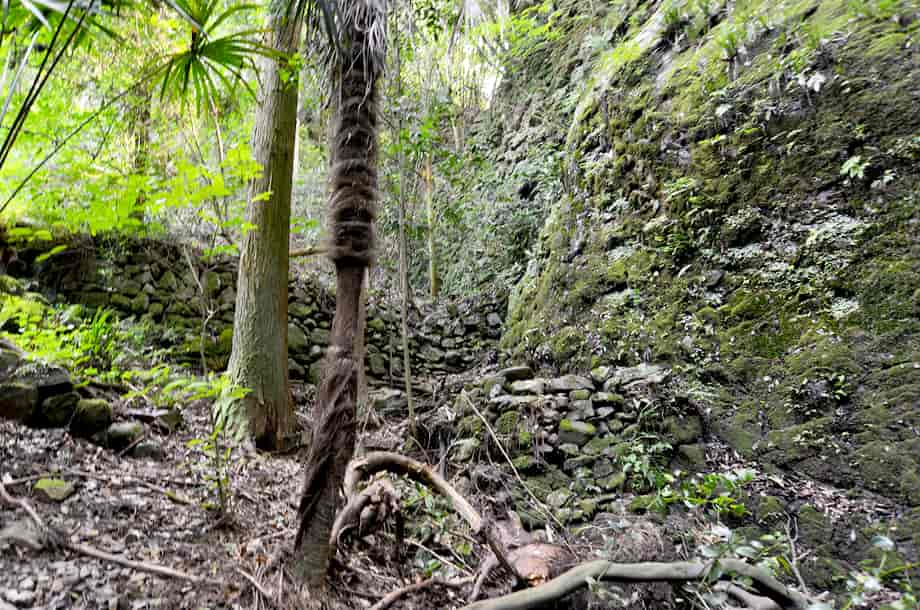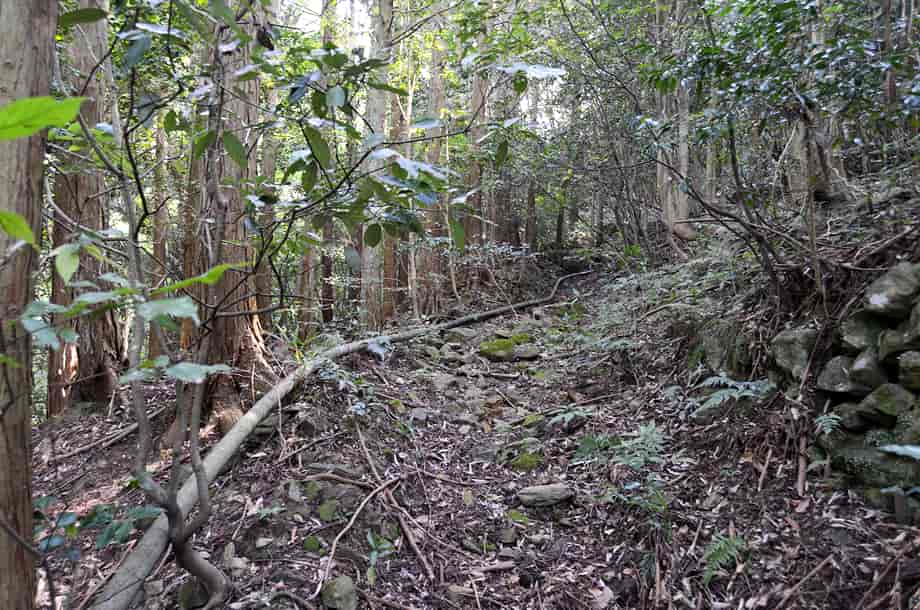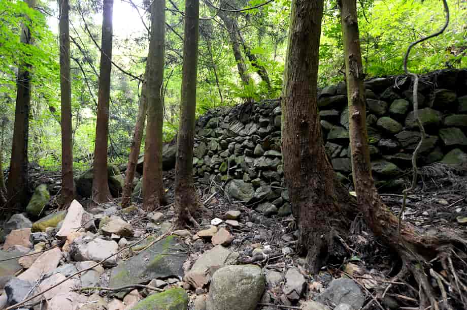 | ▲滝付近に見られる石垣 | ▲寺社跡のような石垣 |