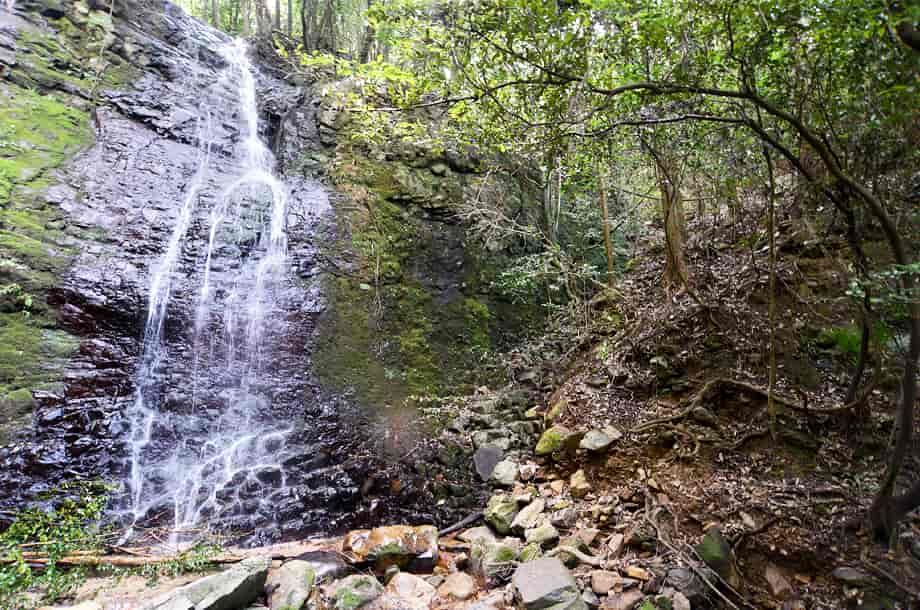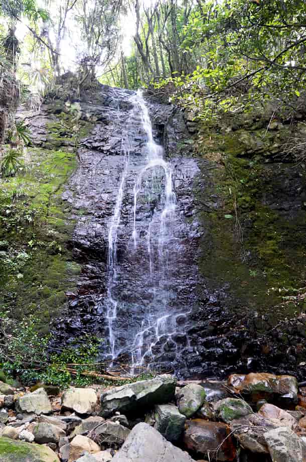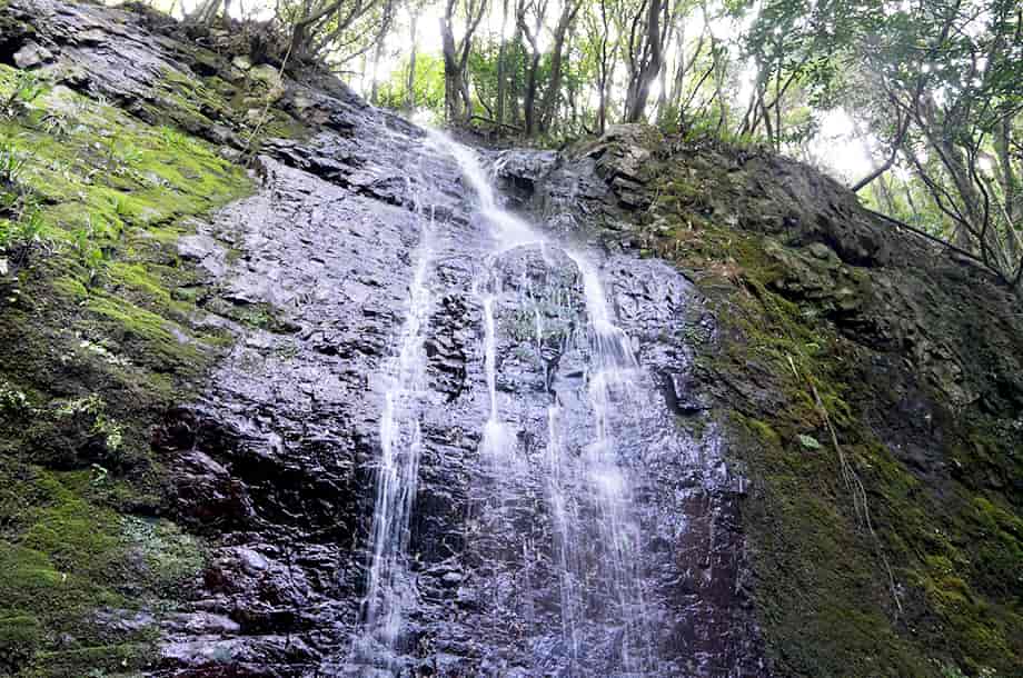 愛媛県砥部町にある「白滝」は、外山地区を流れる和田川の上流部に流れ落ちている。 落差は10~12m程で、水は幅広い岩壁を流れ落ちている。 この岩肌は黒っぽいが、白い水が流れる落ちる様子は明暗を現わしていて、白滝の名前に相応しく感じられる。 この時の水量は多い方ではないだろうが、水の流れは糸を引いているようにも見えておもしろく、水量が多いと布引きのように見えるのかもしれない。 白滝は、道路から離れていることもあり、辺りは閑静で、滝音だけが聞こえてくる。 また、滝前はよく開けていることもあって、落ち着きのある滝のようにも感じられる。 ただ、滝前へも山道からすぐに降りることができるが、周辺がやや荒れた感じがするのは残念ではある。 ところで、滝の周辺を見てみると、付近にはしっかりとした石組みの土台が見られるので、かつては人が通っていたのだろう。 この石組は放棄された耕作地のように見えるが、寺社などの跡地にも見える。 石垣が積まれている場所や高さ、土の様子などを見ると、どうも放棄田のようには見えないので、寺社の跡地だろうと思うが、詳しいことは分からない。 白滝への交通・アクセス さて、白滝へは、自動車の場合、松山自動車道・松山インターからだと、インターを降りてから右折し、その先にある国道33号線と交わる交差点を「高知・久万高原町」方面へ向かって右折する。 しばらく走って行くと、「小田・総津」方面へ向かう国道379号線との分岐があるので、この交差点を右折する。 この交差点には信号機はあるが、住所表記などがないので、道路標識と一緒に「砥部焼伝統産業会館・砥部町陶芸創作館 →」などの案内標識も設置されているので、それにも注意しておくとよい。 (この「小田・総津」方面との分岐の手前に「柳谷・美川・三坂」方面の気温情報などが表示される電光掲示板がある交差点を右折してもよい。 右折すると県道53号線になるが、ここには右折車線はあるが、信号機がないので、曲がるときには対向車にはよく注意する。) 国道33号線から「小田・総津」方面へ右折して少し行くと、「伊予市・大平 県道53号線 →」の道路標識があるので、この分岐を右折する。 右折してからの途中、住宅地を抜ける間の道は狭くなるが、やがて道幅は広くなる。 あとは道なりに県道53号線を走って行くが、道はその内に山の方へ入って行く。 しばらく走って行くと「← 県道53号線・伊予市」の道路標識があるが、この分岐は直進して、県道から外れて左に見える和田川沿いに進んで行く。 ここからの道も舗装されているので特に問題はなく、そのまま行くと、程なく大きく道が右へと曲がるところがある。 ここから脇道が延びているので、白滝へは、その脇道へと入って行く。 自動車は、付近が広くなっているので止めることができるが、道路が曲がるところにあるので、駐車位置にはよく注意する。 ここまで、国道33号線から右折して10~15分程で、松山インターからでも25~30分程度。 白滝へは、駐車位置のところにある作業道のような脇道に入って行くが、道は舗装されていてはっきりとしている。 入り口から歩いて行くと、やがて大きな堰堤に着くが、ここからの道は、所謂山道になる。 堰堤の右から、逆戻りするように登り坂があるので、ここからはこの山道を歩いて行く。 山道ははっきりとしているが、途中には竹の倒木などがあって、やや歩きづらい。 それでも、分岐らしいところはないので、道なりに歩いて行くと、やがて突き当りのようになり、左下に白滝があるのが見える。 滝前へは、崩れたような斜面から降りていくことができるが、岩ばかりなので、足元には注意した方がよい。 ここまで、作業道の入り口から12~13分、長くても15分程で、山道はやや荒れた感じするが、迷うようなことはない。 尚、国道379号をそのまま進んで行くと「衝上断層公園」があり、ここには「かがす淵の滝」が流れ落ちているので、時間があれば寄ってみるのもよい。 |