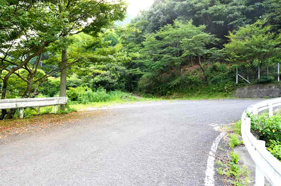 | ▲県道との分岐・直進する | ▲山道入り口の様子・奥に山道が延びている |