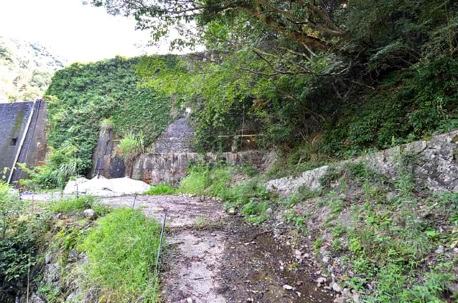 | ▲入り口から見た道路の様子 | ▲途中の堰堤・右の坂道へ進む |