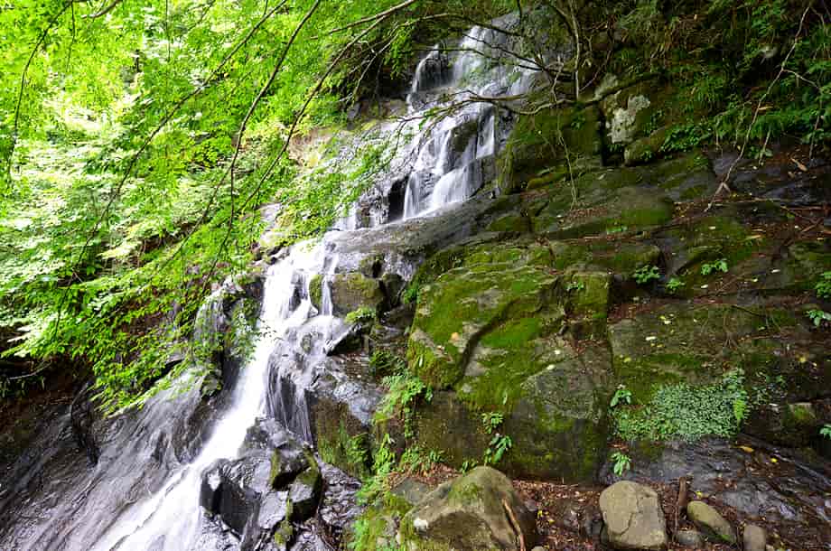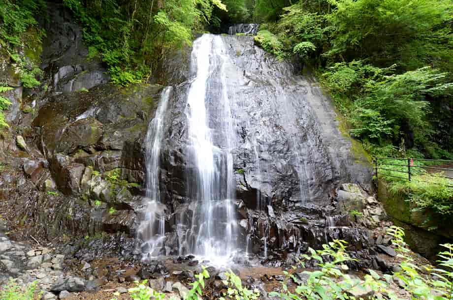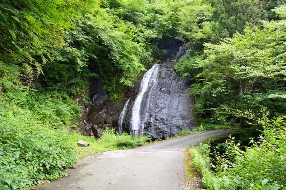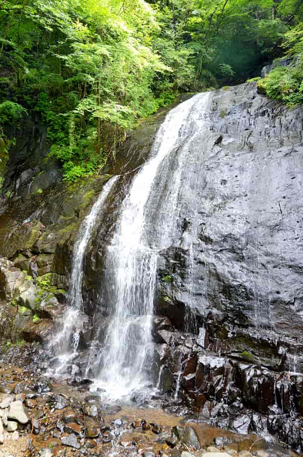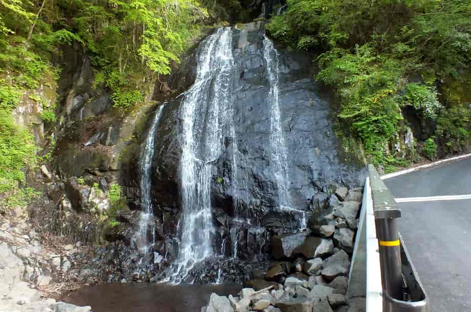愛媛県東温市にある「琴の滝」は、井内地区を流れる井内川の枝沢に流れ落ちている。 林道を進んでくると、突然正面に見えてくるが、この時の光景にはやや驚きがある。 全体は落差20m程の二段になった段瀑で、上段の滝はやや奥まったところに流れ落ちている。 道路脇にある滝だが、滝前が広場になっているので、水が流れ落ちる大きな岩を正面から見ることができる。 この岩は、辺りが開けていることもあって、堂々としていて、水は布滝のようになって流れ落ちている。 「琴の滝」の名前は、この水の流れが琴の糸のように見えるからだろうか。 いずれにしても、綺麗な名前だと思う。 滝壺にはほとんど水がなかったので、この時は水量が少ない方だったのかもしれないが、それでも滝の様子は清々しい。 水量が多いと、水は幾筋にもなって流れ落ち、浅いながらも滝壺をつくるのだろう。 また、上段の滝は、やや離れて見た方がよく分かるが、上段部分にも小さな滝壺があるのかもしれない。 ところで、琴の滝は道路脇にあるので、周辺は荒れた感じもしないが、近年、滝横に架かる橋が新しく架け直され、「岩流橋」と名付けらけている。 前の写真を見てみると、琴の滝の滝壺の右辺り(道路寄り)に岩などはなかったが、新しく橋が架けられてからの写真を見ると、その所に落石の後の様な岩が多く見られる。 滝自体の形は変わっていないように見えるので、台風などで落石があったのか、道路の一部が崩落などのしたのかもしれない。 琴の滝への交通・アクセス さて、琴の滝へは、自動車の場合、松山方面からだと、国道11号線を東温・西条方面へ向かう。 重信川や表川などを越えて走って行くと、「300m先 井内・県道210号線 →」の案内標識があるので、その先の「東温市・則之内」と書かれた陸橋のある交差点を右折して、県道210号線へ進む。 (ここからしばらく先にある国道494号線の分岐の陸橋にも「東温市・則之内」と書かれているので、反対側から訪れる場合には注意する) 県道に入ってからは道なりに進んで行くが、やがて突き当りのような分岐があり、ここには伊予鉄バスの「井内北間」のバス停がある。 正面には案内板が設置されていて、「御来光の滝」と共に琴の滝の写真も掲載されているので、参考にしておくとよい。 この分岐は右折してもよいが、左折して県道210号線を進む方が分かりやすく、走りやすい。 左折してからの道も舗装されているので、道なりに走って行くと、左に善城寺があるが、琴の滝へは、ここを越えて更に進んで行く。 善城寺から少し行くと「林道・梅ケ谷-永子線 起点」の標識があり、ここからは林道になる。 しかし、道は舗装されているので問題はない。 林道を進んで行くと、集落や耕作地の間を抜けて行き、どんどん高度を上げていく。 やがて耕作地も終わり、所謂林道といった様子になるが、そのまま道なりに進んで行く。 しばらく走って行くと、左に曲がった先の正面に琴の滝が見える。 ここまで、県道210号線に入ってから25~30分程なのだが、随分長い時間がかかったように感じる。 しかし、それだけに琴の滝を遠望できた時には、少しばかり驚きがある。 自動車は滝の前が広場になっているので、そこに駐車することができる。 但し、琴の滝がある「林道・梅ケ谷-永子線」は、気象状況などによっては、通行止めや通行不可になっていることもあるので、訪れる前に確認しておくのもよい。 尚、御来光の滝は、ここから自動車で4~5分程のところにあるので、一緒に訪れてみるとよい。 |