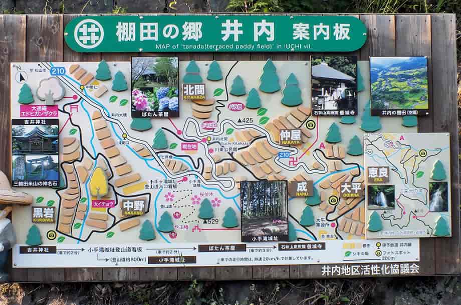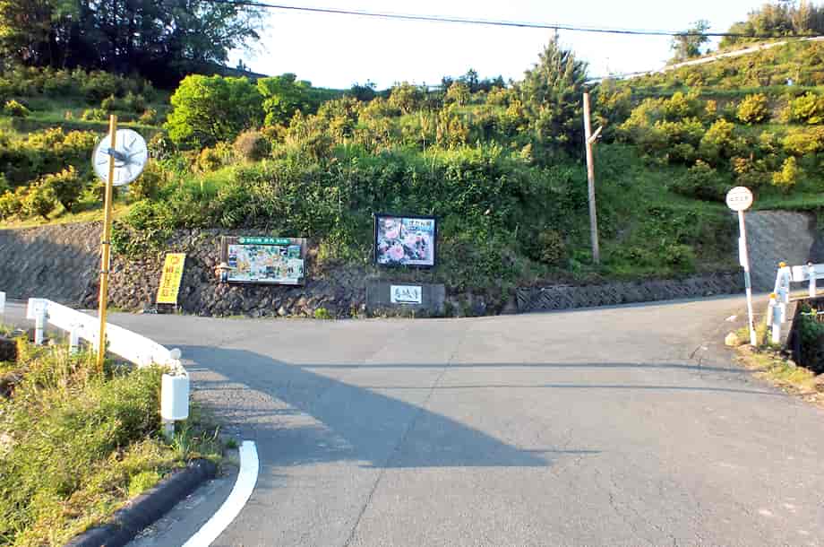 | ▲「井内北間」バス停の分岐・左へ進む | ▲分岐にある案内図 |