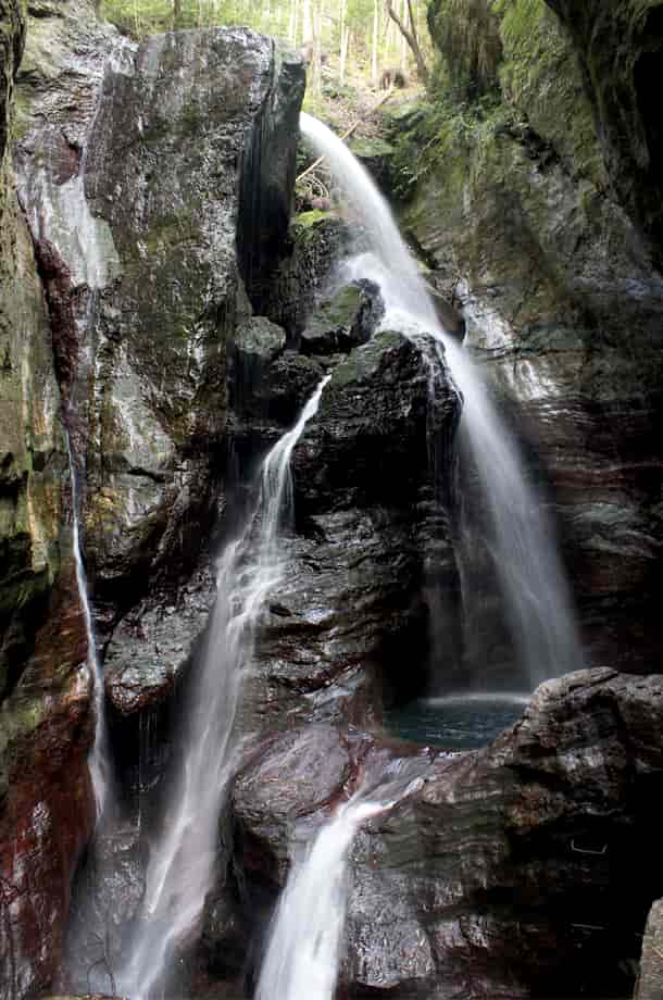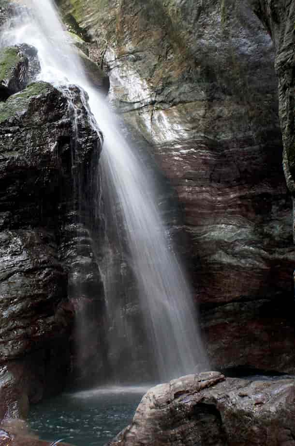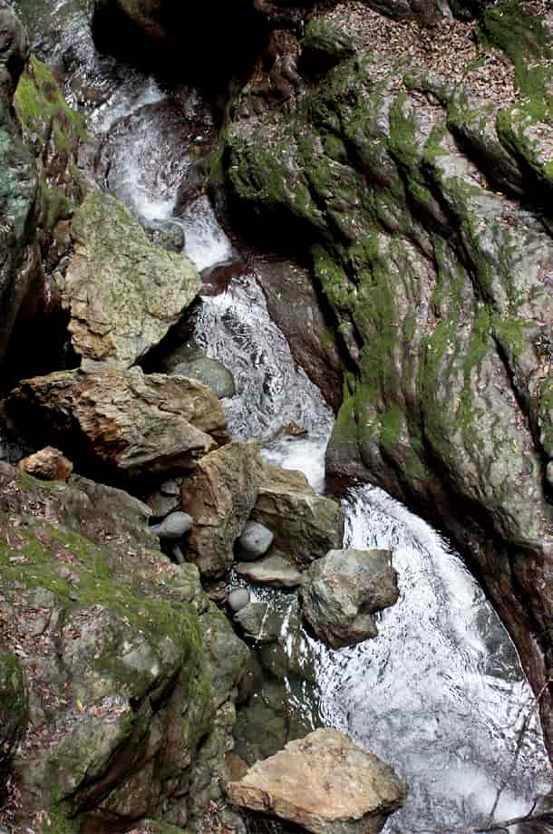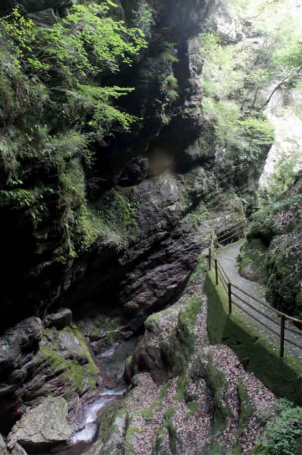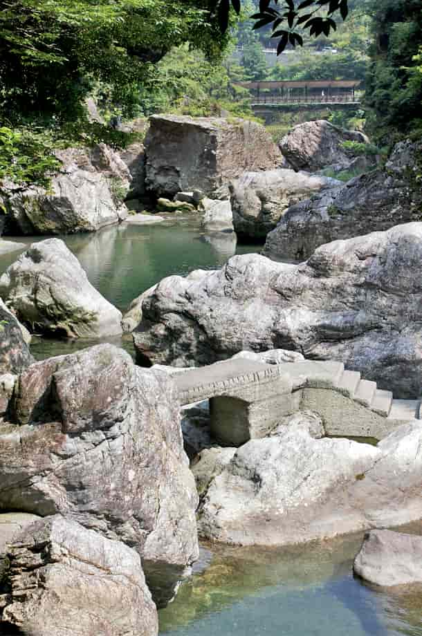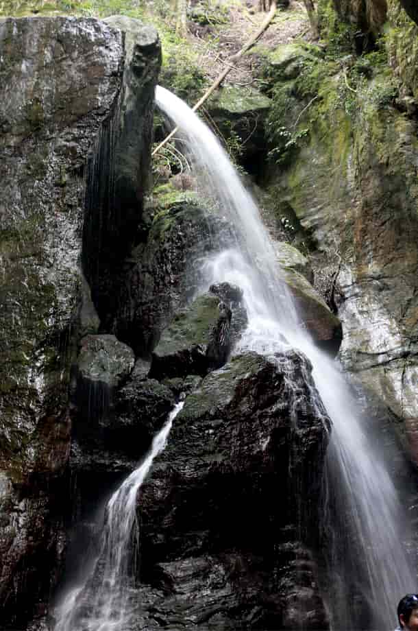 高知県仁淀川町にある「雨竜の滝」は、名野川地区を流れる名野川の上流部に流れ落ちている。 四季折々の景観を現わす「中津渓谷」の中にある滝で、落差は20m程と言われている。 全体は段瀑のように見えるが、流れ落ちた水は、途中にある突出した岩によって大きく分けられている。 右の流れは、すぐにはっきりとした滝壺をつくっていて、そこからの流れが、再び左のものとひとつになっている。 その流れは更に下へ向かっていて、深い渓谷へと続いているが、落差は20mを超えているようにも見える。 また、雨竜の滝は立体感のある滝でもあり、突出した岩の上にも垂直に立つ岩があり、その脇からも流れが見える。 水量が多い時には、この流れもはっきりとした様子を現わし、名前のように、雨後には龍のような力強い景観を現わすのだろう。 ところで、滝自体は滝見台から正面に見えるのだが、残念ながら、滝下から眺めることはできない。 ロープなどがあれば整備された遊歩道を外れ、滝下辺りから見ることもできるのかもしれないが、それはやめておいた方が良さそうである。 また、中津渓谷には毘沙門天や大黒天などの七福神が祀られていて、この雨竜の滝付近にも不動尊が祀られているようだが、この時は分からなかった。 途中には「紅葉滝」という滝も流れ落ちているようなのだが、この滝も見落としてしまったのか、分からずじまいになってしまった。 雨竜の滝への交通・アクセス さて、雨竜の滝へは中津渓谷を目指すことになるが、渓谷入り口までの交通はそのページで紹介しているので、入り口からよく整備された遊歩道を歩いて行くと、入り口から15分ほどで滝前に着く。 遊歩道は、ほとんどコンクリートの道が続いていて、歩きやすい。 道に迷うこともなく、渓流の景観などを楽しみながら歩いて行くとよい。 |