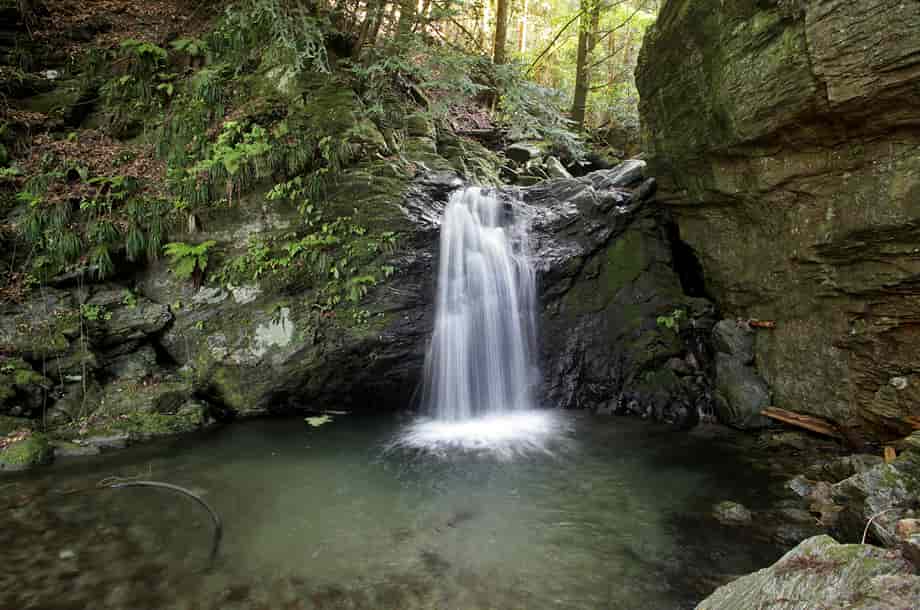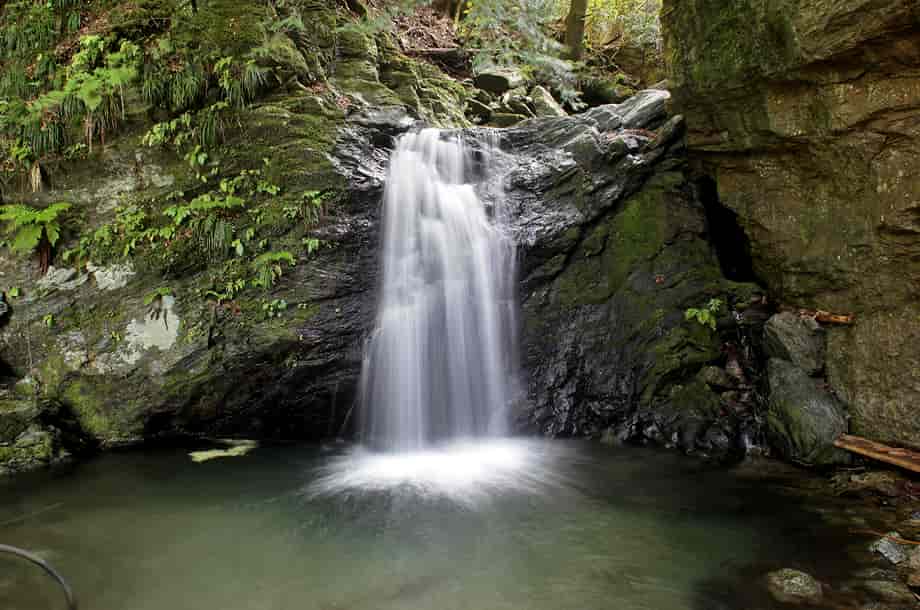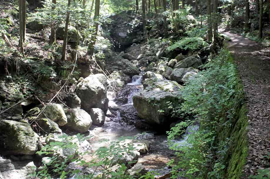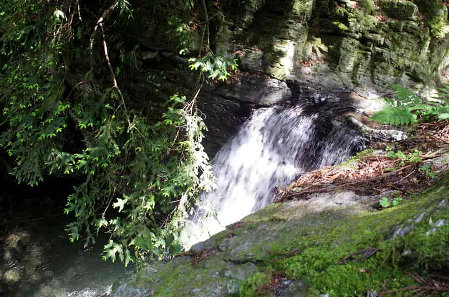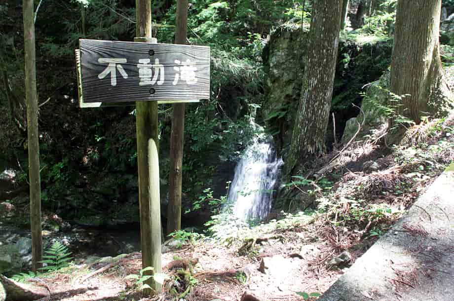 徳島県神山町にある「不動滝」は、神領地区を流れる高根谷川上流部に流れ落ちている。 周辺は「高根谷川渓谷」と呼ばれていて、不動滝は上流側にある「雨乞の滝」へ向かう途中にある。 名前のように、信仰の滝でもあり、落差5m程の小さな滝だが、落ち口は幅広く、どっしりとした落ち着きある印象を受ける。 広い滝壺をもつ端正な滝でもあり、下流側にある「うぐいす滝」とは全く違った味わいがある。 「不動」の名前に相応しく感じられる滝で、辺りの景観と共に、信仰の滝に相応しくも感じられる。 ところで、不動滝は山道からでも眺めることができるが、落ち口の上辺りになるところには不動尊が祀られている。 石仏は簡素なもので、祠代わりの石組みの中に安置されているが、古くから大切にされてきたことが窺える。 また、この辺りはやや広くなっていて、不動尊近くから滝の落ち口の様子などを眺めることができる。 不動滝への交通・アクセス さて、不動滝は、雨乞の滝へ向かう途中にあるが、入り口になる駐車場まではそのページで紹介しているので、駐車場の奥から延びる山道を登って行くと、250〜260mほどで見えてくる。 駐車場からの山道は遊歩道のように舗装されていて、下流側にあるうぐいす滝からだと150〜160m程のところに名板が立てられていて、山道から見ることができる。 滝前へは、名板のやや手前から沢へ降りることができ、降り口もすぐに分かる。 名板を過ぎると、左に不動尊が祀られているが、付近はやや広くなっている。 ここまで、入り口から距離はないが、ずっと上りが続くので、この広場で一息入れ、更に上流側を目指すのもよい。 |