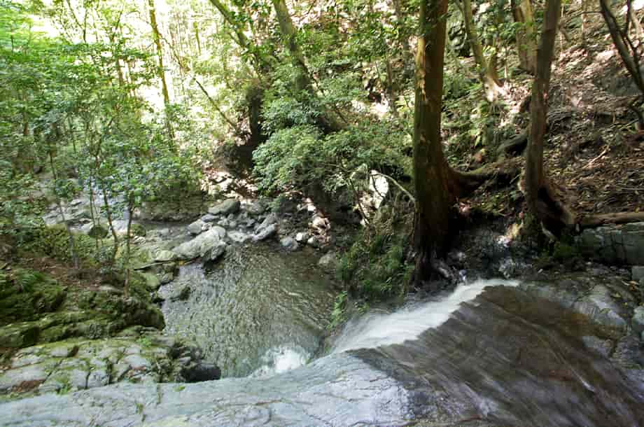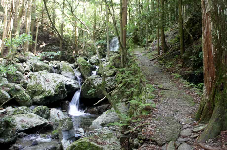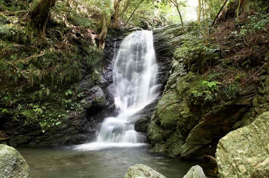 徳島県神山町にある「観音滝」は、神領地区を流れる高根谷川上流部に流れ落ちている。 上流側にある「雨乞の滝」へ向かう途中にある滝で、山道に名板が立てられていて、その辺りからでも見ることができる。 観音滝は落差7〜8m程で、はっきりとした広い滝壺をもっている。 落ち口は幅広いが、下方部分では段瀑になっていて、一度は滝幅が狭くなったように見えて味わいがある。 また、滝前には大きな岩が多いが、よく開けているので清々しくもある。 それに、全体の様子は、下流側にある「不動滝」に似ているように感じられるのもおもしろい。 落差は観音滝の方が大きいが、岩の様子などが似ているからだろう。 ふたつの似ている滝の名前が、いずれも仏名になっているのも、意図したことなのかもしれない。 観音滝への交通・アクセス さて、観音滝は、雨乞の滝へ向かう途中にあるが、入り口になる駐車場まではそのページで紹介しているので、駐車場の奥から延びる山道を登って行くと、600mほどで見えてくる。 下流側にある「もみじ滝」からだと130〜150m程で、入り口からでも15〜20分ほどで名板辺りに着く。 もみじ滝から、左に見える渓流の様子などを楽しみながら歩いて行くと、程なく遠望することができるが、「滝まで100m」と書かれた案内板辺りから、沢へ降りることができる。 観音滝は名板辺りからでもよく見えるが、沢へ降りて滝前に近づくと、違った空間と雰囲気が感じられる。 |