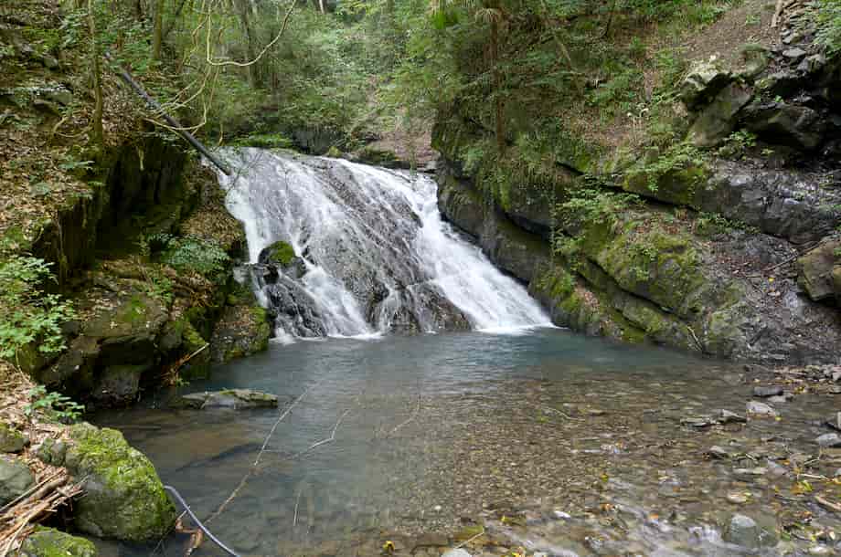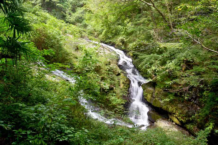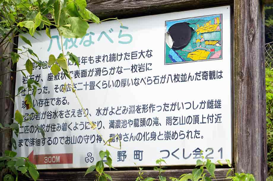 徳島県三好市にある「八枚なべら」は、三野町太刀野山地区を流れる河内谷川に流れ落ちている。 全体は、落差よりも長さがある連瀑のような感じで、大きく見ると三つの部分からできている。 上段の滝は段瀑だが、中段部分は大きな岩の間を流れている。 そして、下段部分は岩の両側を回り込むように、ふた筋になって水が流れている。 しかし、長さは150m程もあると言われているが、この時は植物が繁茂する時期だったので、残念ながら、全体の様子を見ることができなかった。 遊歩道から外れて近づいてみようとも思ったが、植物が生い茂っていて足元が確認できないほどだったので、遊歩道からの眺めだけにしておいた。 冬期などであれば、植物が少ないので全体の様子が見えるのかもしれないが、遊歩道から滝近くへ降りる斜面は、思いのほか急でもある。 この斜面は見た目以上に傾斜が強いので、足元がよく見える時期でも、十分に注意する必要があり、ロープを用意していた方が良いように思う。 遊歩道から眺めた限りでは、下段部分がもっともよく見え、大きな岩の様子などもよく分かる。 中段部分は多くが植物に隠れてしまい、水が流れる様子などはあまり分からなかったが、大きな岩の間を流れている様子は分かる。 上段部分もよくは見えなかったが、遊歩道から見ると、大きな崖から水が流れ出ているようにも見えて、おもしろい。 落ち口から上の流れは見えないが、上段の滝は断崖の脇に流れている。 この断崖はかなり大きく、地層も斜めになっていて興味を引く。 また、上段の滝を眺められる辺りに広場があるが、ここから遊歩道を更に進むと水利施設がある。 広場の辺りから先の道は勾配も急になっていて、やや距離もあるが、5〜6分程で水利施設に着く。 この辺りは上段の滝の上流部になるが、八枚なべら辺りとは違った様子で、趣のある渓流になっている。 この時は上流側を散策する時間はなかったが、この水利施設の横から沢に降りることができる。 ここには八枚なべらの最上段、或いは上の滝とも言える斜瀑があり、滝前も開けていて清々しい。 落差は3〜4m程だろうか、水は澄み切っていて、滝壺も広くて味わいがあるので、時間があれば登って行ってみるとよい。 ところで、「八枚なべら」の「なべら」とは、表面が滑らかで平らな岩のことで、説明板などによると、「巨大な岩石が長年に渡って流れによって削られ、表面が滑らかな座敷状の一枚岩になった」と記されている。 その岩の広さは二十畳ほどで、この厚い岩が八枚あることから「八枚なべら」と呼ばれている。 八枚なべらが流れる河内谷川は水量が多く流れが速いとされているが、その速い流れもなべら岩をつくり出す一因になっているのだろうが、「この岩が谷水を遮り、淵をつくったが、いつしか雌雄2匹の大蛇が住みつくようになり、満濃池や「龍頭の滝」、雨乞山の頂上付近まで徘徊するので、お山の守り神『 龍神さん 』の化身として崇められた」とも伝えられている。 確かに、この時も水量は豊富で、流れも速いようであった。 それに、大きな岩の間を複雑に水が流れる様子は、大蛇が徘徊しているようにも見える。 残念ながら、この時は全体の様子は見ることができなかったが、長さ150m程もあると言われる景観を思い浮かべると、大蛇伝説が伝わっていることも頷くことができる。 八枚なべらへの交通・アクセス さて、八枚なべらへは、自動車で徳島自動車道・井川池田インターからだと、インターを降りて右折し、国道192号を高松方面へ向かい、1km近く走ったところに「← 州津」の道路標識があるので、その先の交差点を左折する。 この交差点には左折車線があり、左へ曲がると、すぐに三好大橋を渡る。 そのまま道なりに走っていくと、「州津堂面」の交差点があるので、この交差点を右の12号線の方へ入る。 曲がってからしばらくは県道12号を走り、「鳴門」方面へ向かう。 やがて、県道108号線との分岐があるので、ここを左折するが、ここには信号機がないので注意する必要がある。 この分岐は河内谷川の橋を渡る手前になるが、分岐の手前には、道路左側に「← 三野町・碁要口 / 徳島・鳴門 ↑」の道路標識と、その下には「↑ 紅葉温泉 1.8km」の案内標識があるので、それらに注意しておくとよい。 この分岐まで、インターを降りてから18〜20分程で、左折すると県道108号線になるので、あとは道なりに進んで行く。 県道108号線に入ってから7〜8分ほど走ると中央分離帯があるところがあり、その先に片側一車線ずつの橋が架かっている。 この橋を渡り、分離帯が終わるところに「八枚なべら」の説明版が設置されている。 説明版には、「八枚なべらまで300m」と記されているが、この説明板のところを左へ入り、幅の狭い道を上がると駐車場がある。 駐車場には簡易トイレも設置されていて、インターから30〜35分程で駐車場に着く。 八枚なべらへは駐車場の先の道を下っていくが、右にも山