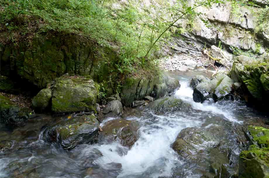 | ▲山道を登っていくとある水利施設・奥の建物の辺りから沢へ降りることができる | ▲水利施設辺りの沢から見る下流側の様子 |
