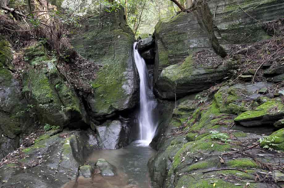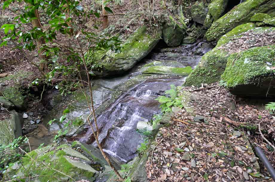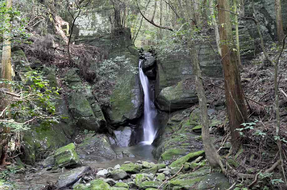 徳島県吉野川市にある「水神の滝」は、川島町山田湯吸地区を流れる飯尾川の支流・湯吹(ゆす)谷川に流れ落ちている。 水神の滝は、この谷川にある幾つかの滝の総称のようで、「奥の滝」はそのひとつになっている。 水神の滝の中ではもっとも上流側にあり、落差は4m程だろうか。 「四の滝」とも呼ばれ、下流側にある「雌滝」を更に小さくしたような印象を受ける。 しかし、端正な滝で、小さいながらも滝壺も見られる。 岩の間から水が流れ落ちる様子も、この小ぶりな滝に相応しいように思える。 一方、岩幅があるので、水量が多いと迫力のある景観を現わしそうな滝でもある。 奥の滝への交通・アクセス さて、水神の滝までの交通はそのページで紹介しているので、奥の滝へは、雌滝から更に遊歩道を登って行ったところにある。 雌滝から奥の滝までは10〜15分程度で、この時は、雌滝から先を右岸沿いに進み、途中で上流にある渓流滝の様な前を渡渉して、沢の左岸にある遊歩道を進んで行った。 しかし、雌滝から先の道は、途中から全く道がなくなってしまうといった様子になるので、雌滝の手前の太鼓橋を渡って、沢の左岸にある遊歩道を歩いて行った方がよいかもしれない。 |