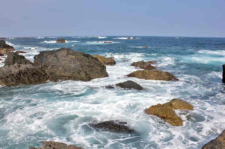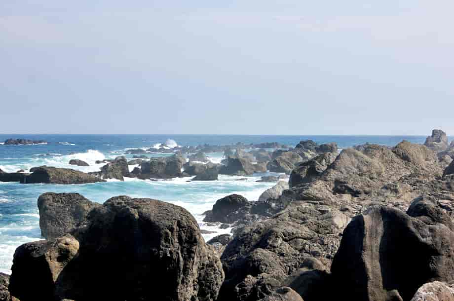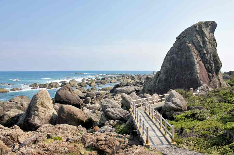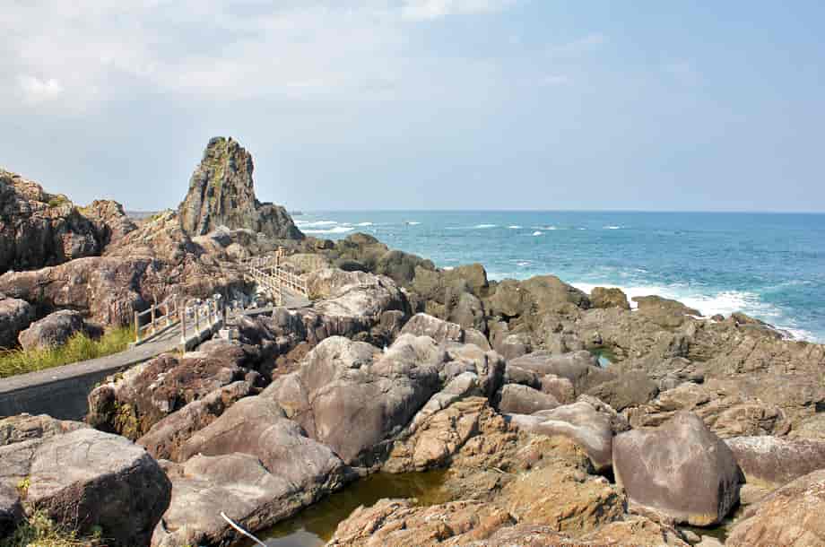 高知県室戸市にある「室戸岬」は、室戸半島の先端に位置していて、太平洋に向かって大きく突き出している。 国の名勝地でもあり、室戸阿南海岸国定公園に指定されているが、「室戸岬亜熱帯性樹林および海岸植物群落」は、国の天然記念物にも指定されている。 周辺の景観は素晴らしく、岬の上にある室戸岬灯台辺りからの眺めは広大で素晴らしい。 しかし、海岸に降りて見ると、高台から眺めるのとは違い、変化に富んだ海岸の様子に改めて感嘆する。 海岸には遊歩道が整備されていて、次々に現れる奇岩や海岸段丘、磯の様子など、散策していても飽きることがない。 「ビシャゴ岩」と呼ばれる奇岩は、室戸がまだ海底にあった頃(およそ1400万年前)、地層にマグマが水平に入り込み、更にそれがほぼ垂直に回転したとされる珍しい岩で、よく目立つ。 「烏帽子岩」と呼ばれる奇岩も目に付くが、この岩は、名前のように、烏帽子のような形をしていて、やはり1400万年前頃に形成されたとみられている。 他にも目に留まる奇岩が多いが、岬の東側では日出、西側では日の入りを見ることができ、「月見ヶ浜」と呼ばれるところから眺める名月も、さぞかし美しいものだろう。 一方、室戸岬は、太平洋に面していることから波は荒く、強風が吹くことでも知られている。 岩礁に波が打ち付ける様子は清々しくもあるが、海岸付近では、あまり海際には近づかない方がよさそうである。 ところで、岬の上には室戸岬灯台が建てられているが、この灯台は明治32年(1899年)に設置された古いものだが、レンズの直径は2m60cm、凡そ49km先まで光が届くとされている。 また、室戸周辺には弘法大師所縁のものが多く、灯台付近にある最御岬寺は、山門をはじめ、本堂や多宝塔、鐘楼などが建ち並び、四国八十八か所の札場になっている。 更に、徳島方面から国道55号線を走ってくると、道路沿いに洞窟があるのが目に留まる。 この洞窟はふたつあり、左の洞は「御厨人(みくろど)窟」で、洞内には五所神社が祀られ、右側のものは「神明窟」で、神明宮が祀られている。 「御蔵洞」とも呼ばれる御厨人窟に入ると、中から見えるのは空と海だけで、弘法大師・「空海」の法名は、この眺めに深く感銘したからだと云われている。 この時は、どちらもの洞も立ち入れ禁止になっていたのが残念ではあったが、御厨人窟の中で聞く波音は、「日本の音風景100選」に選ばれている。 いずれにしても、室戸岬は素晴らしく、海岸に降りてみると、その素晴らしさがよく分かる。 高知県では、西の端に「足摺岬」が太平洋に突き出していて、そこから眺める太平洋の眺めも素晴らしい。 しかし、どちらの岬も趣が異なっていて、おもしろく、高知県には心に残る海岸風景も多い。 室戸岬への交通・アクセス さて、室戸岬へは、自動車の場合、高知市からだと、国道55号線を東へ進み、およそ2時間ほど。 徳島市からだと、国道55号線を南へ向かい、およそ3時間ほどはかかる。 |